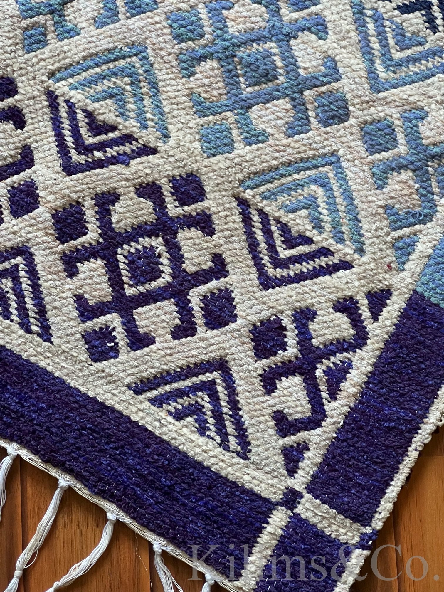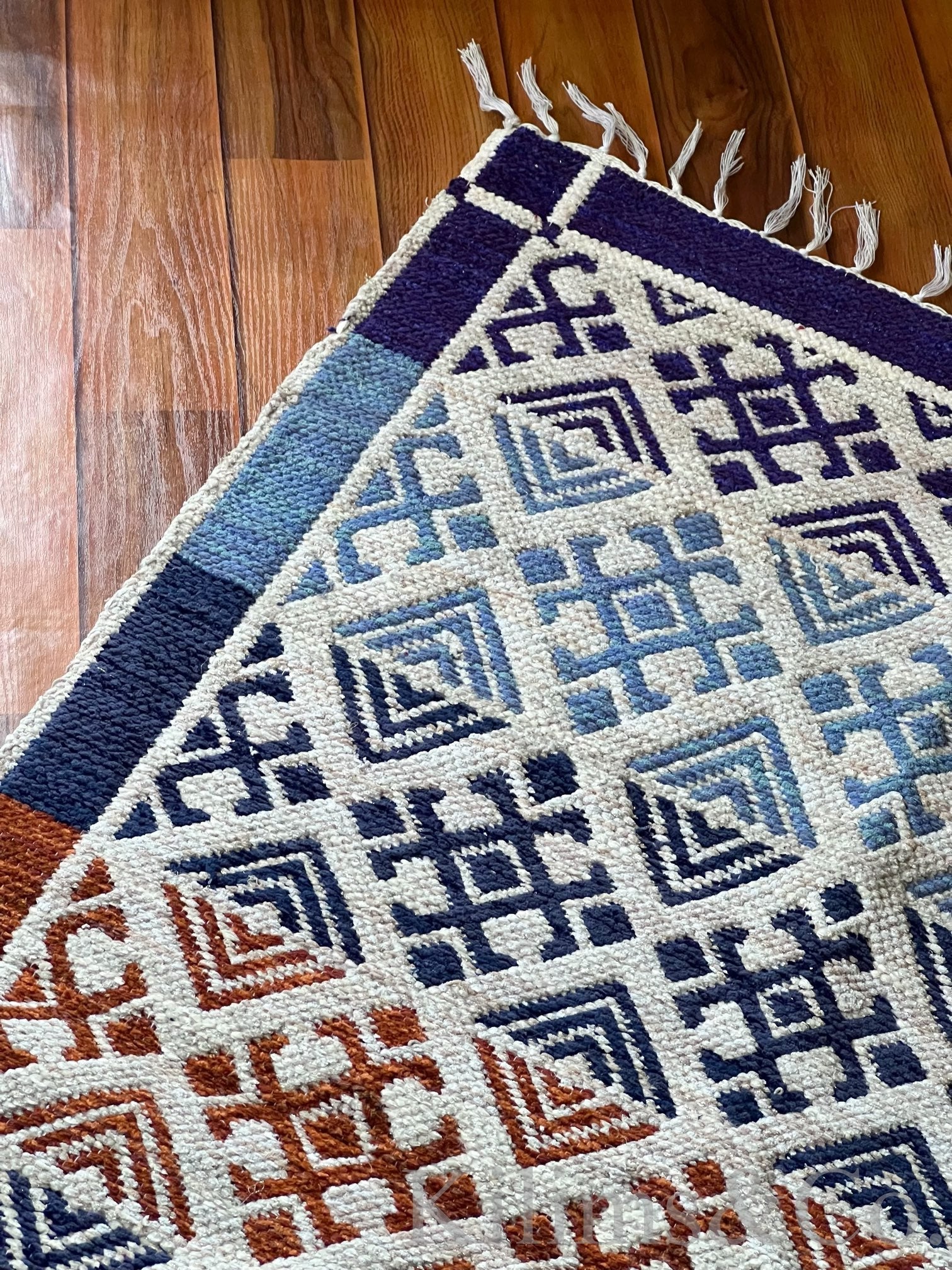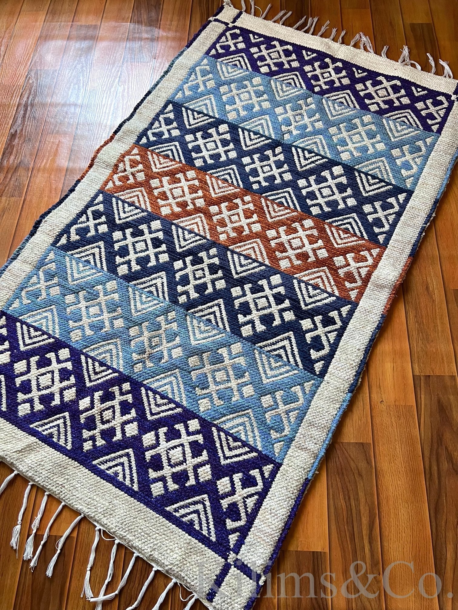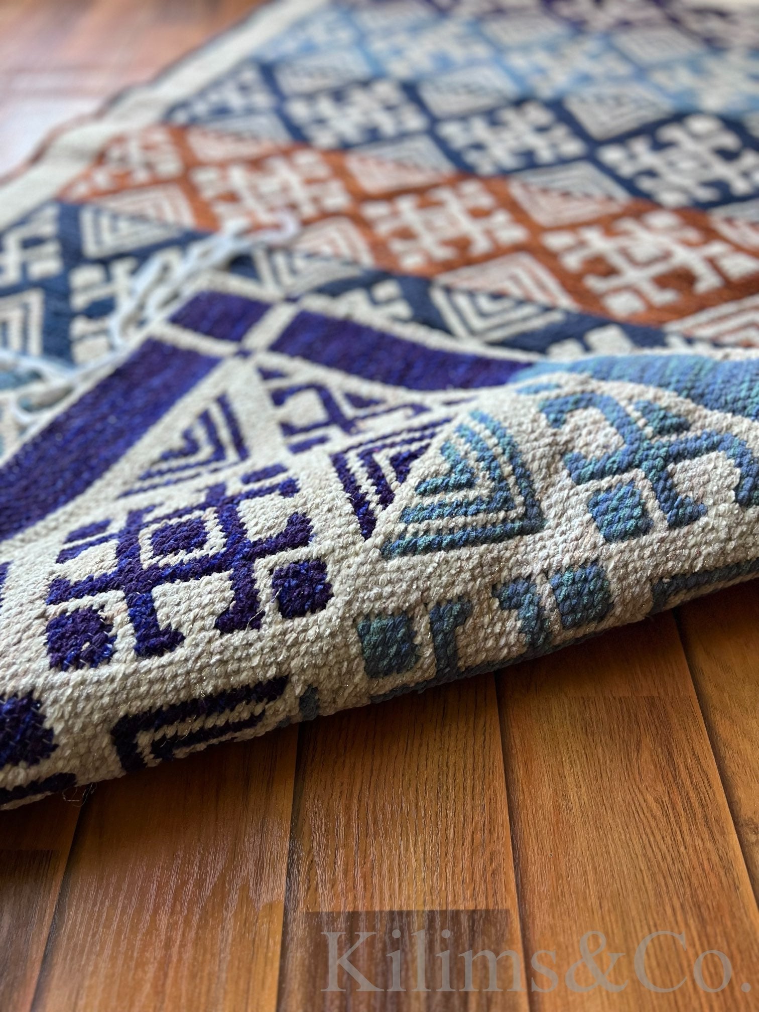 Introducing the "Retro Vibe Kilim" - a charming rug that features a nostalgic blend of blue, purple, rustic orange, and white colors. The name is inspired by the vintage aesthetic of the 60s and 70s, bringing a touch of retro style to your living space.