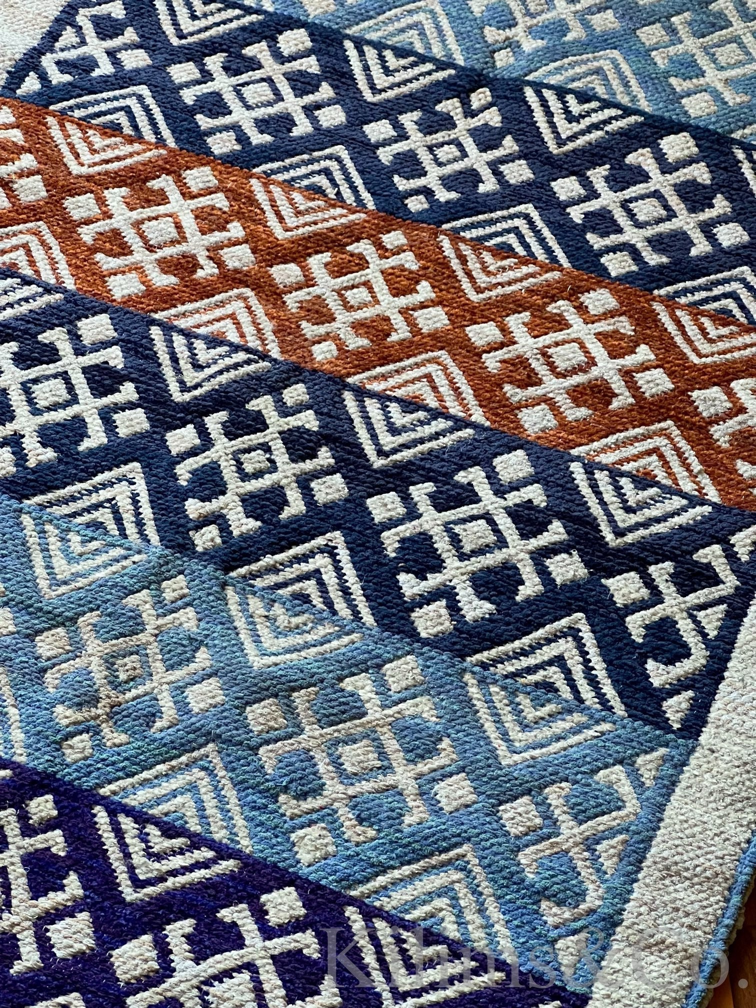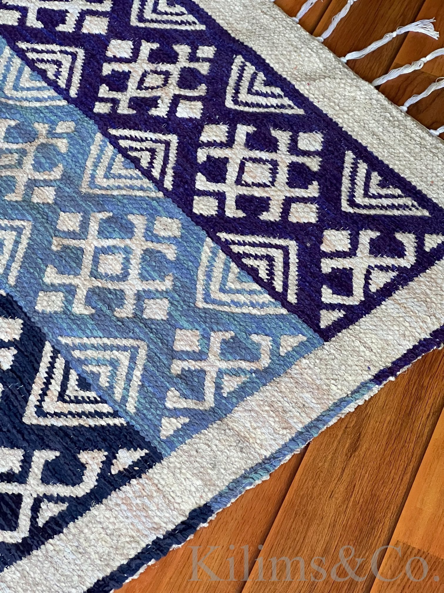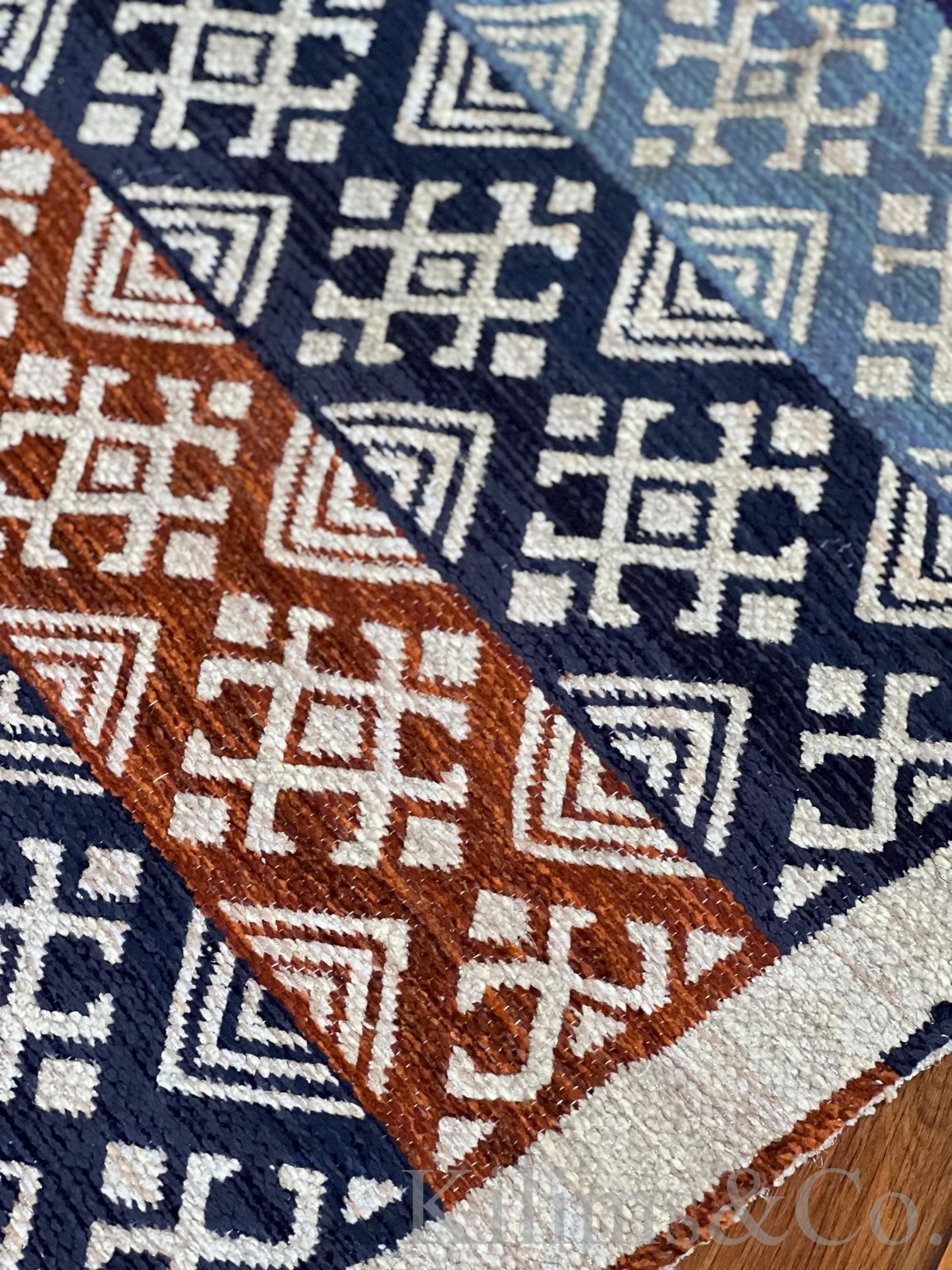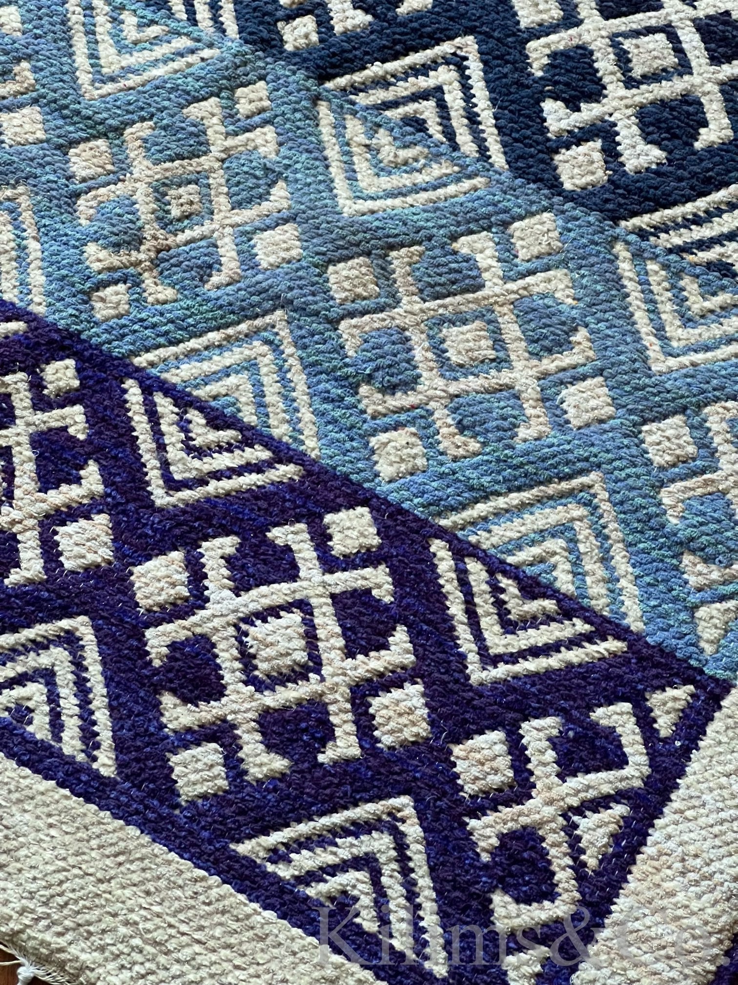 Introducing the "Retro Vibe Kilim" - a charming rug that features a nostalgic blend of blue, purple, rustic orange, and white colors. The name is inspired by the vintage aesthetic of the 60s and 70s, bringing a touch of retro style to your living space.
