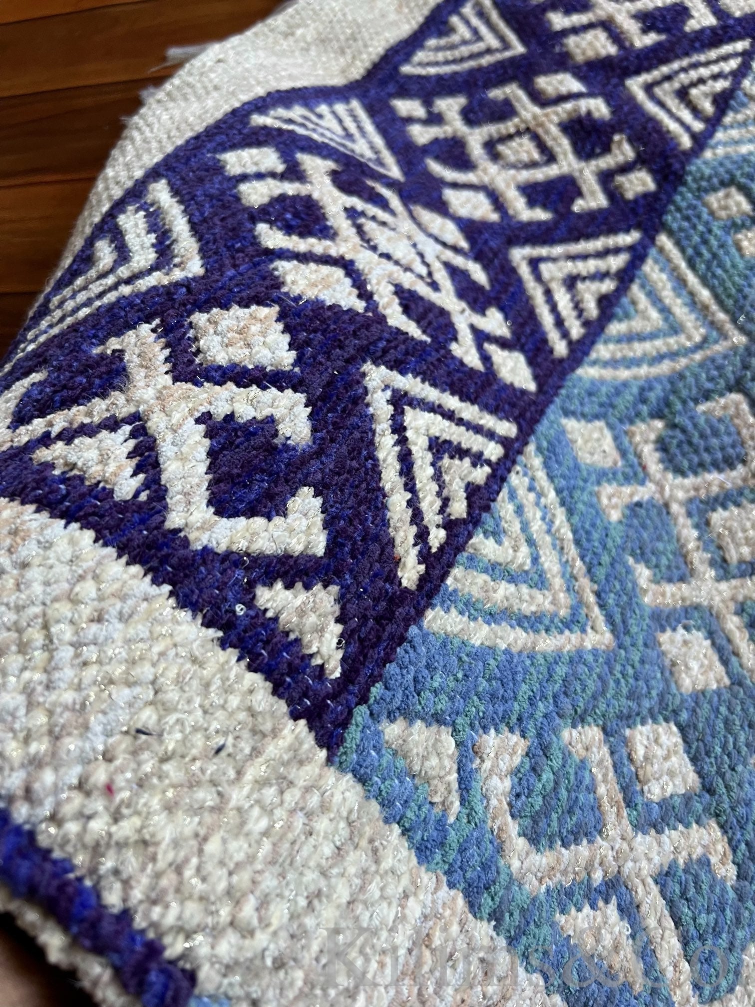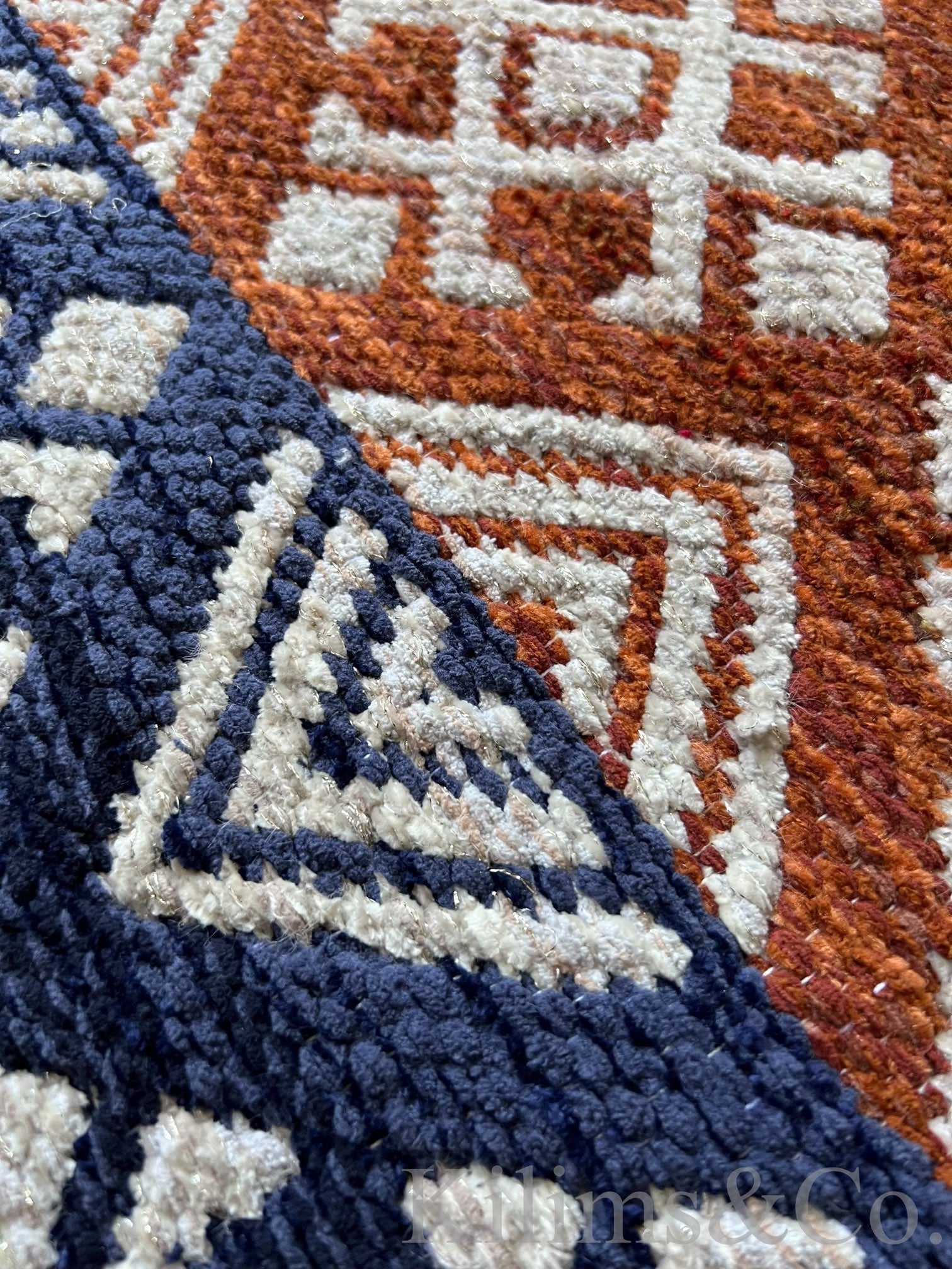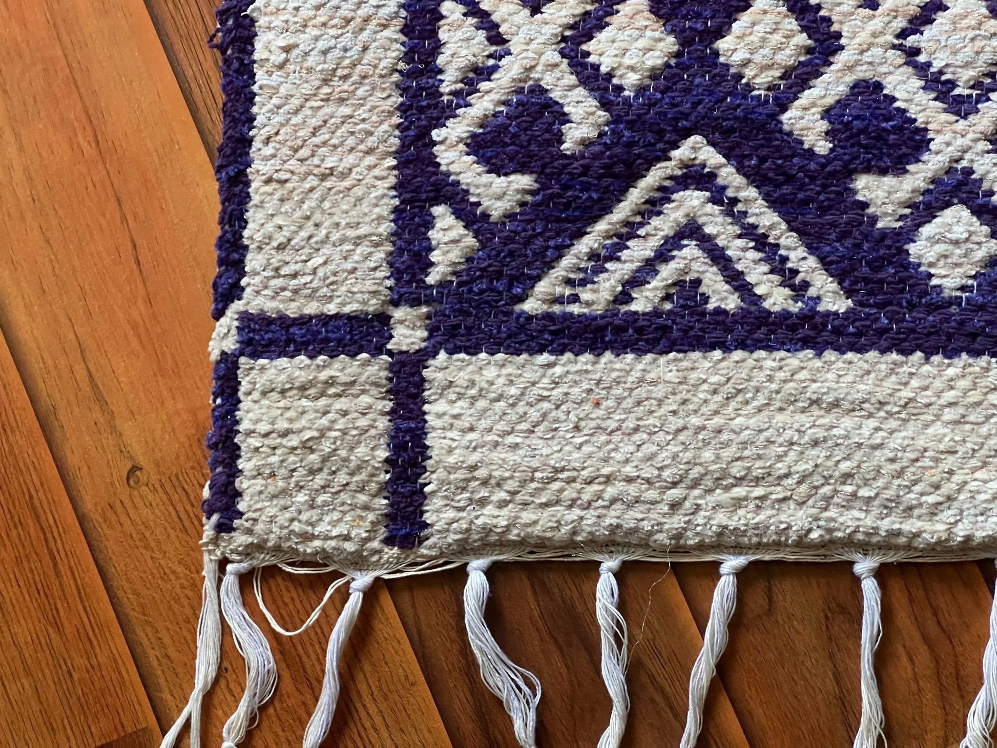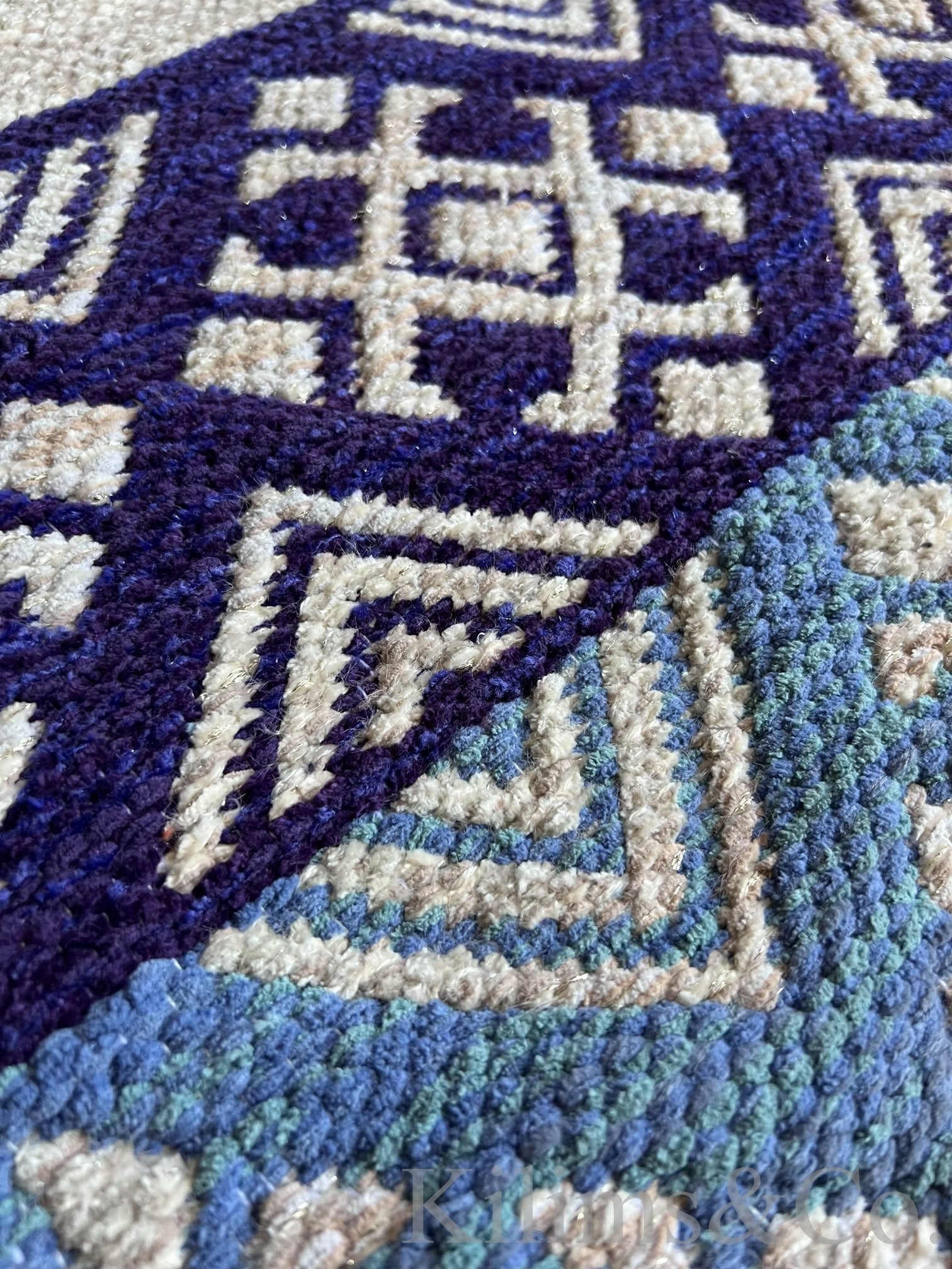 Introducing the "Retro Vibe Kilim" - a charming rug that features a nostalgic blend of blue, purple, rustic orange, and white colors. The name is inspired by the vintage aesthetic of the 60s and 70s, bringing a touch of retro style to your living space.