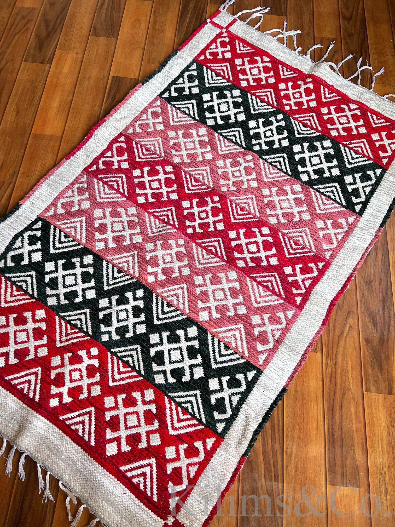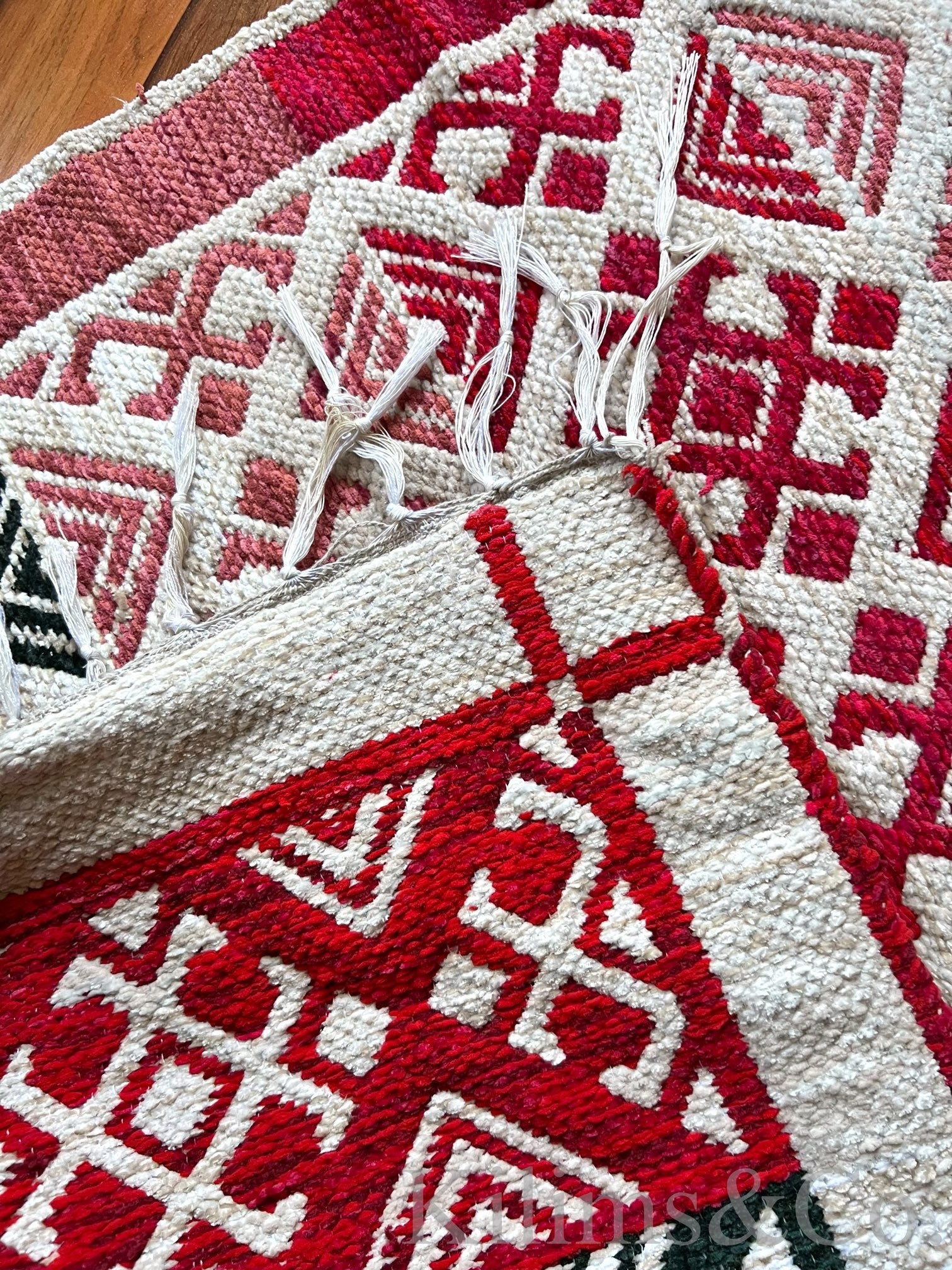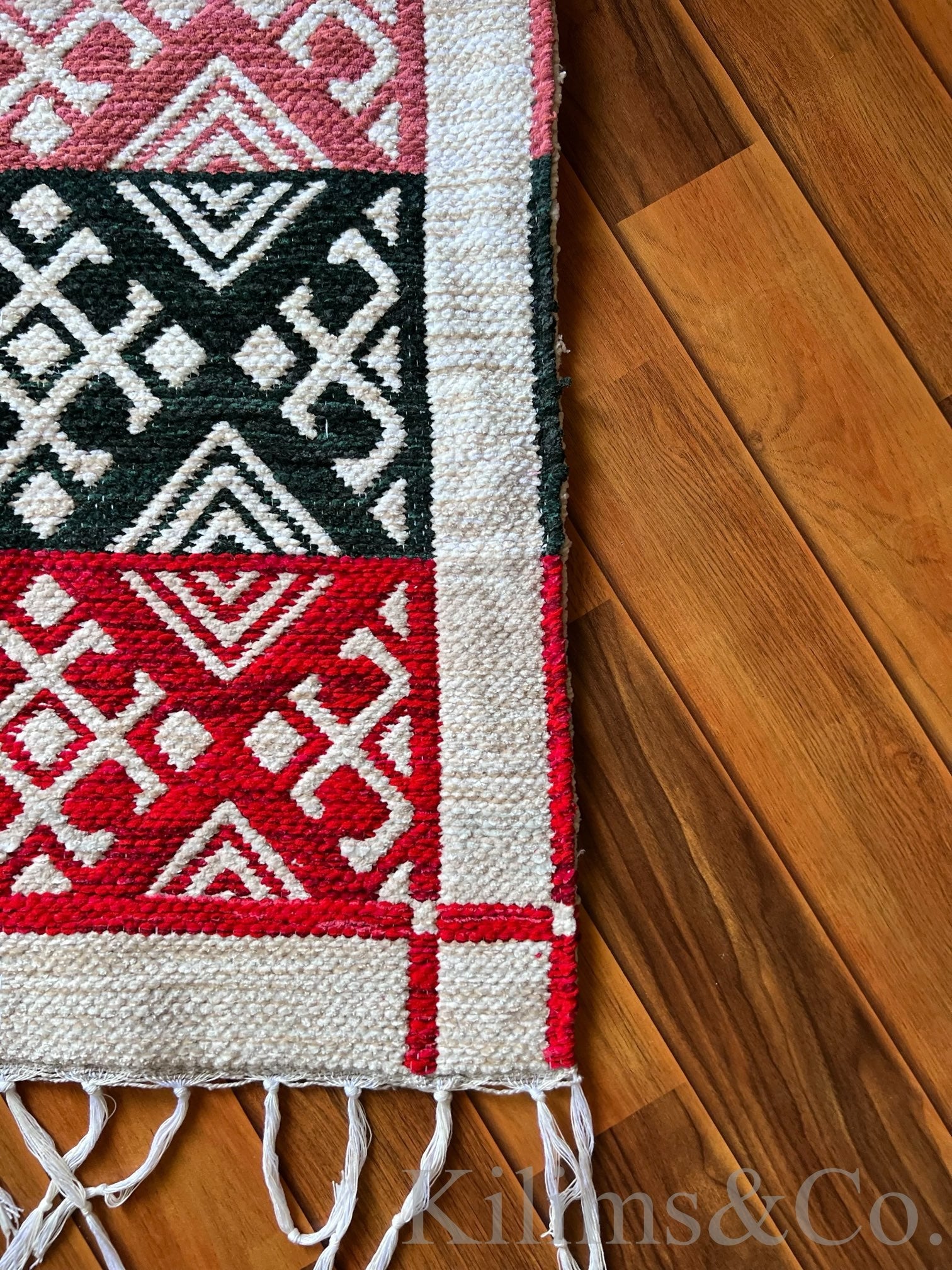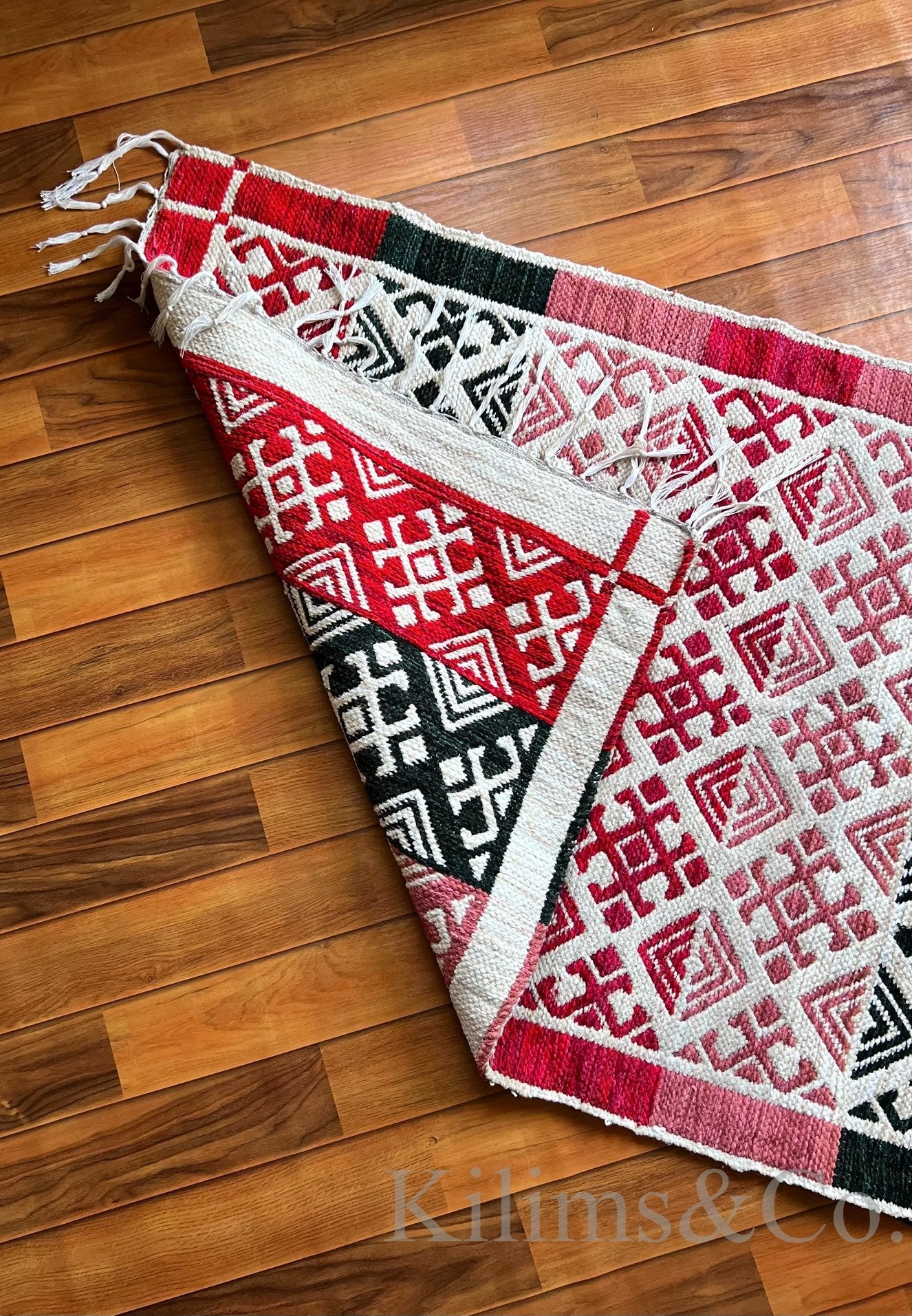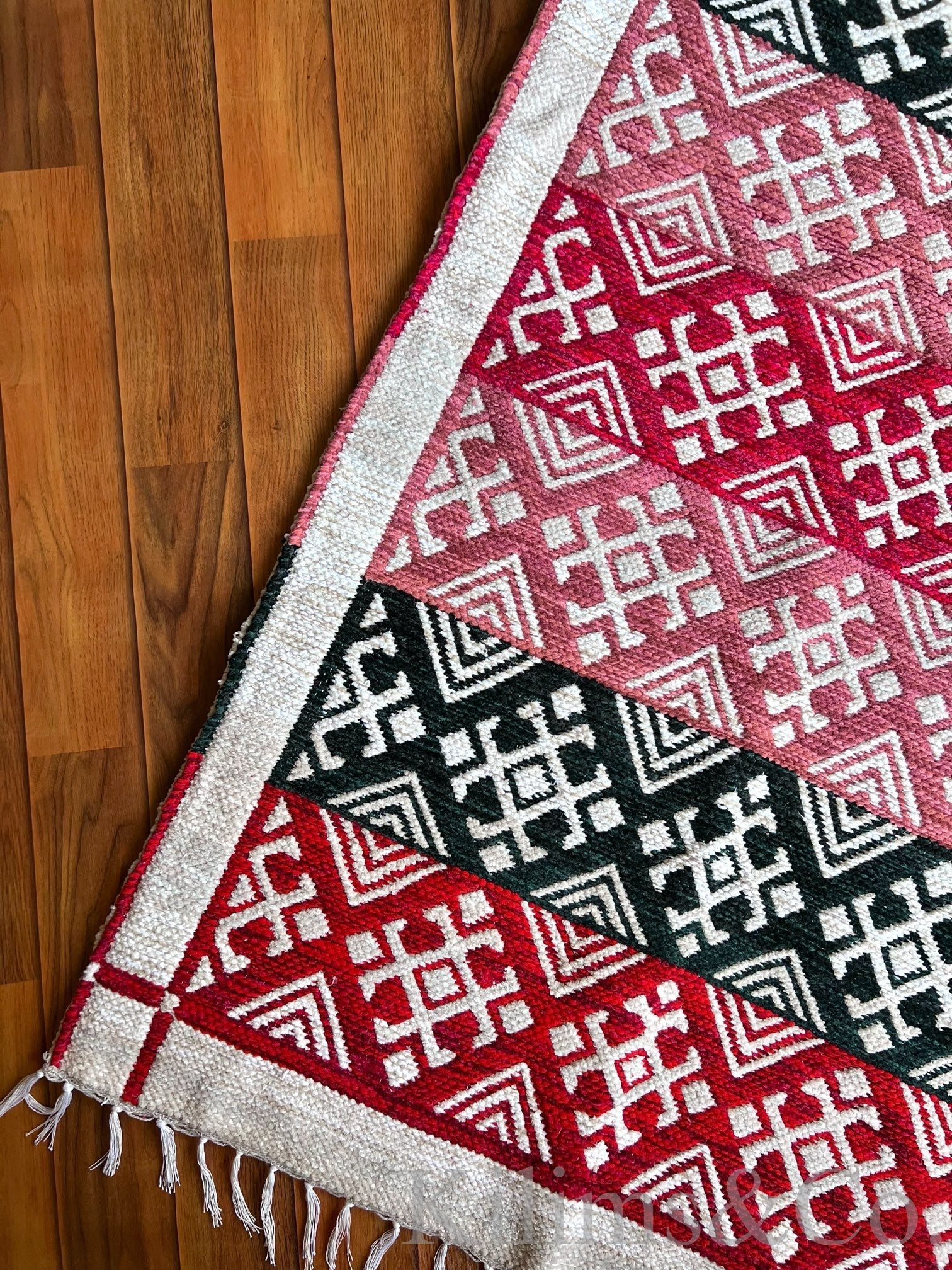 Introducing the "Harley Quinn Kilim" - a vibrant rug that combines bold shades of pink, red, black, and white. The name is inspired by the iconic comic book character, known for her colorful personality and edgy style.