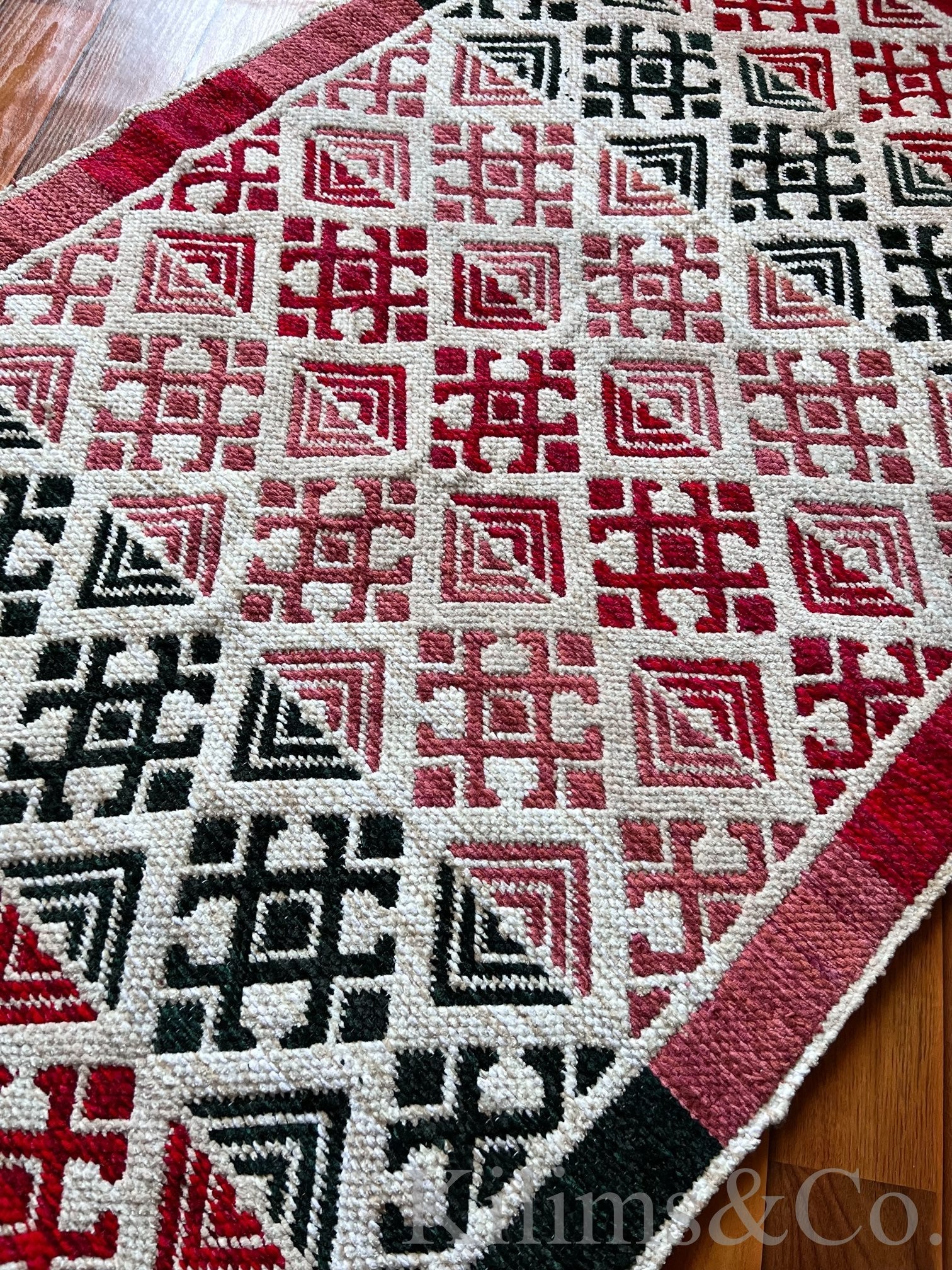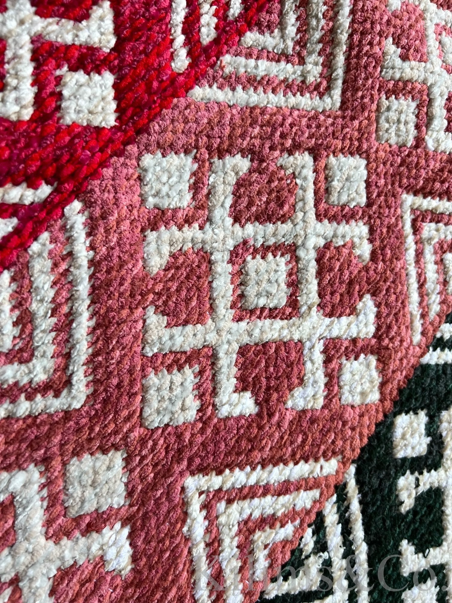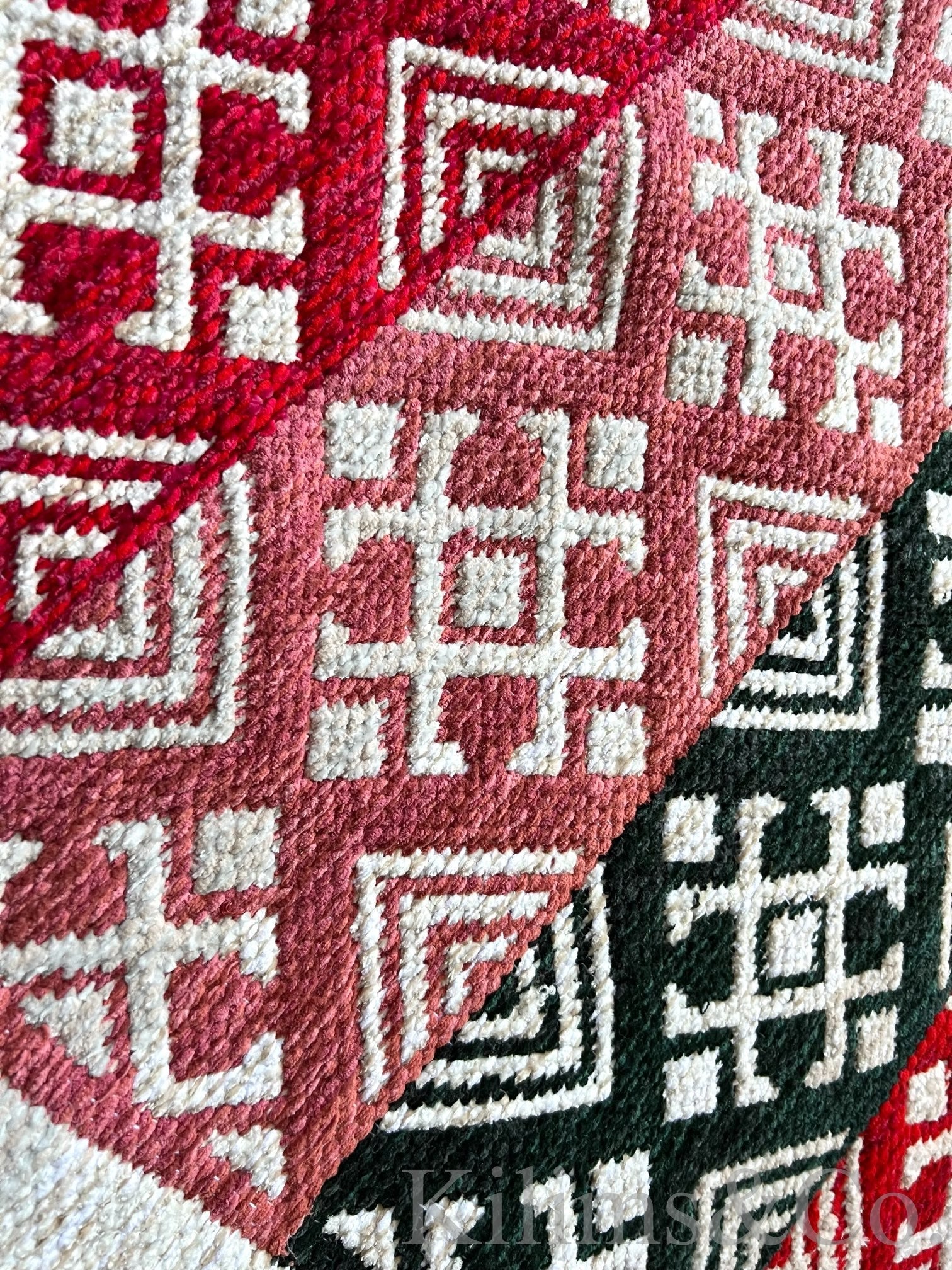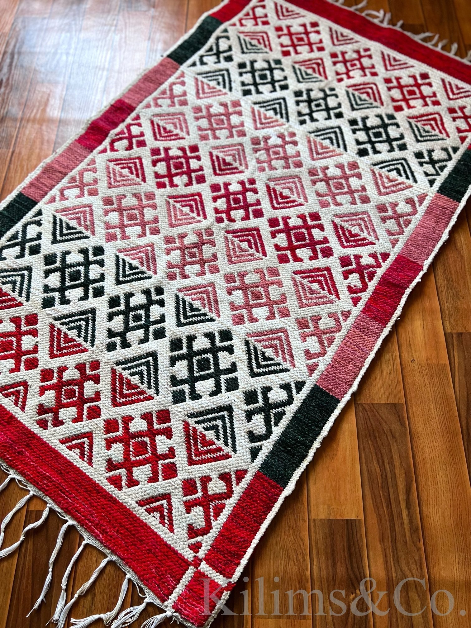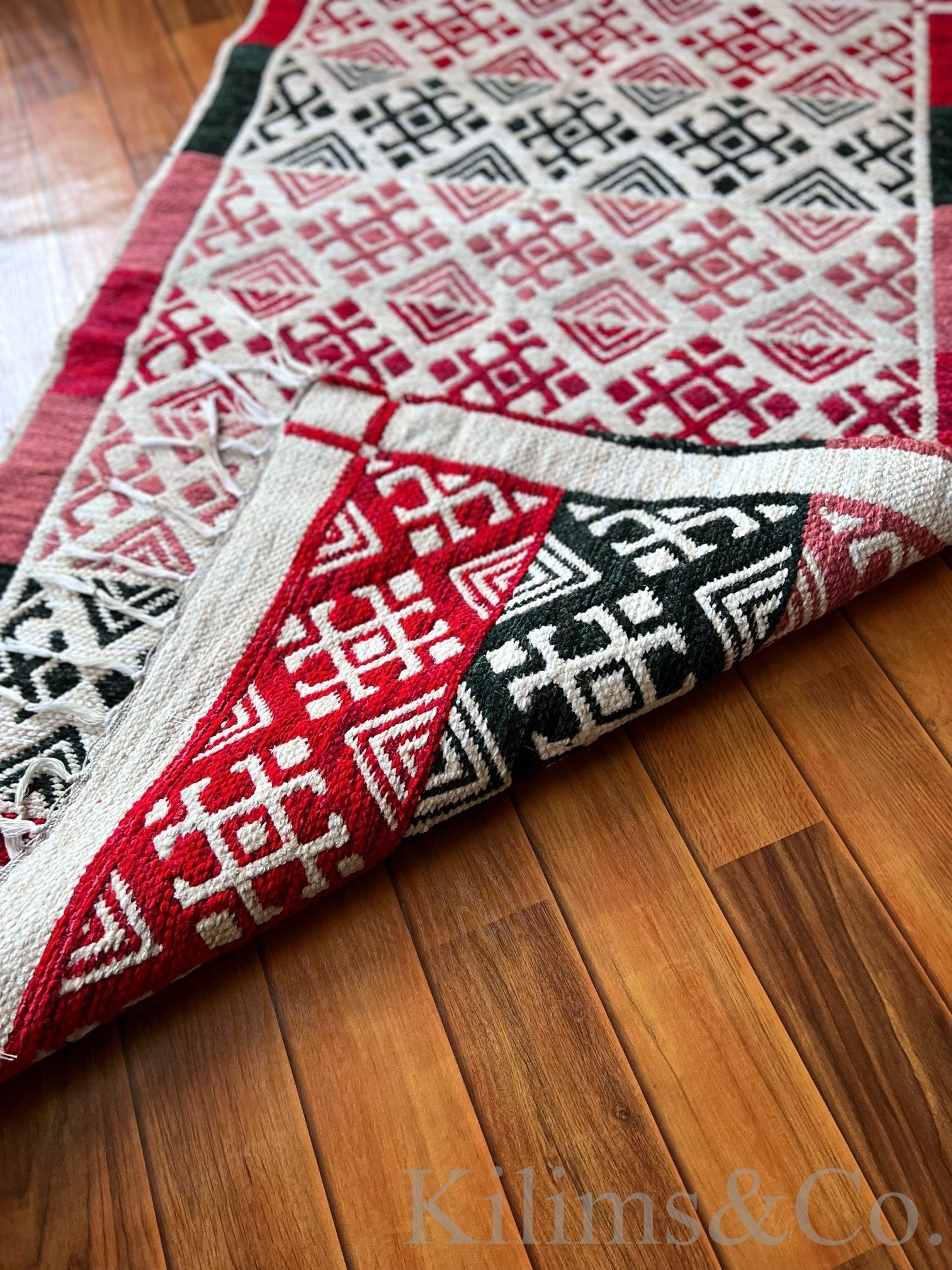 Introducing the "Harley Quinn Kilim" - a vibrant rug that combines bold shades of pink, red, black, and white. The name is inspired by the iconic comic book character, known for her colorful personality and edgy style.