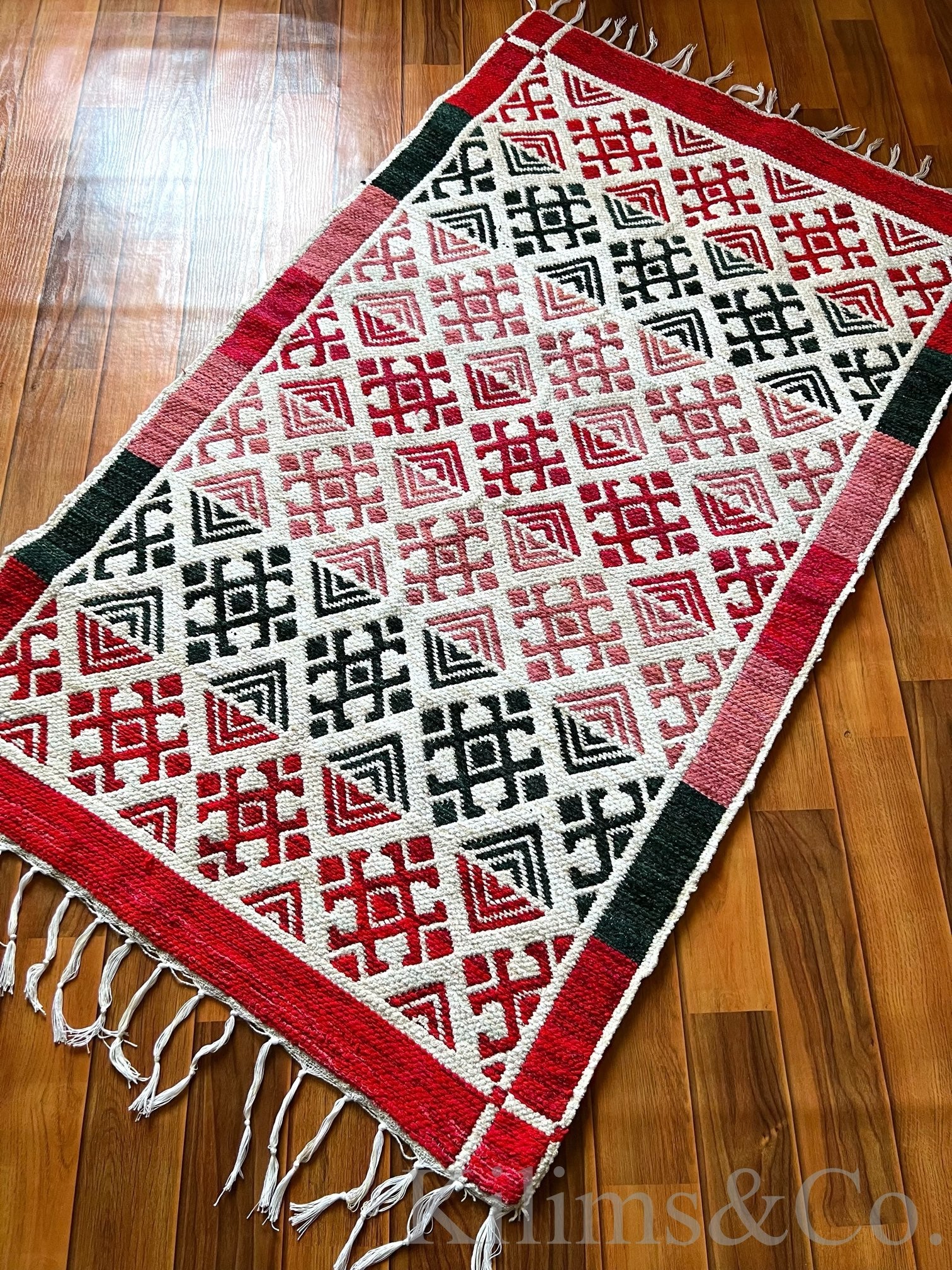 These Kilims are made in the bustling streets of Multan and nearby Rural areas , on a traditional Khaddi. Featuring Dynamic patterns in bold colour schemes making them a distinctive accent to any home.
