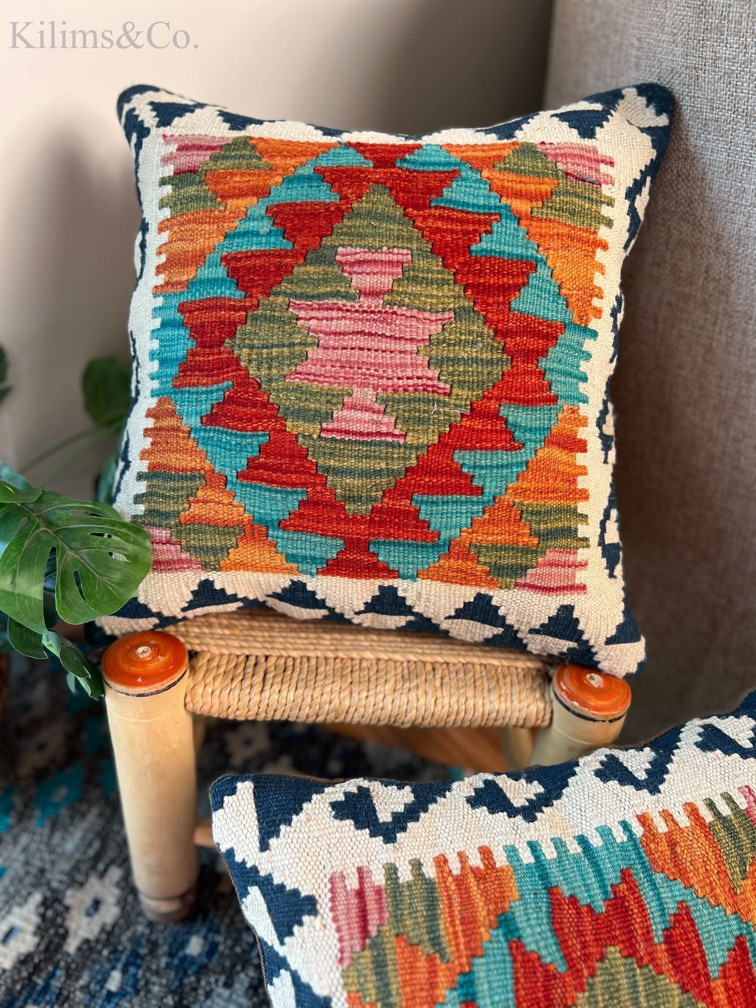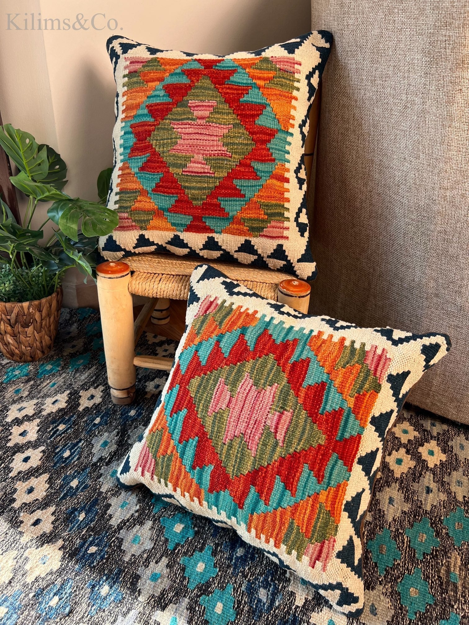 Handmade woollen cushion covers in a beautiful design that will make your home feel like you're in the middle of a dream. These cushions are made from kilim, which is a type of woven textiles that originated in Afghanistan. They have vibrant colours and look great with any decor!