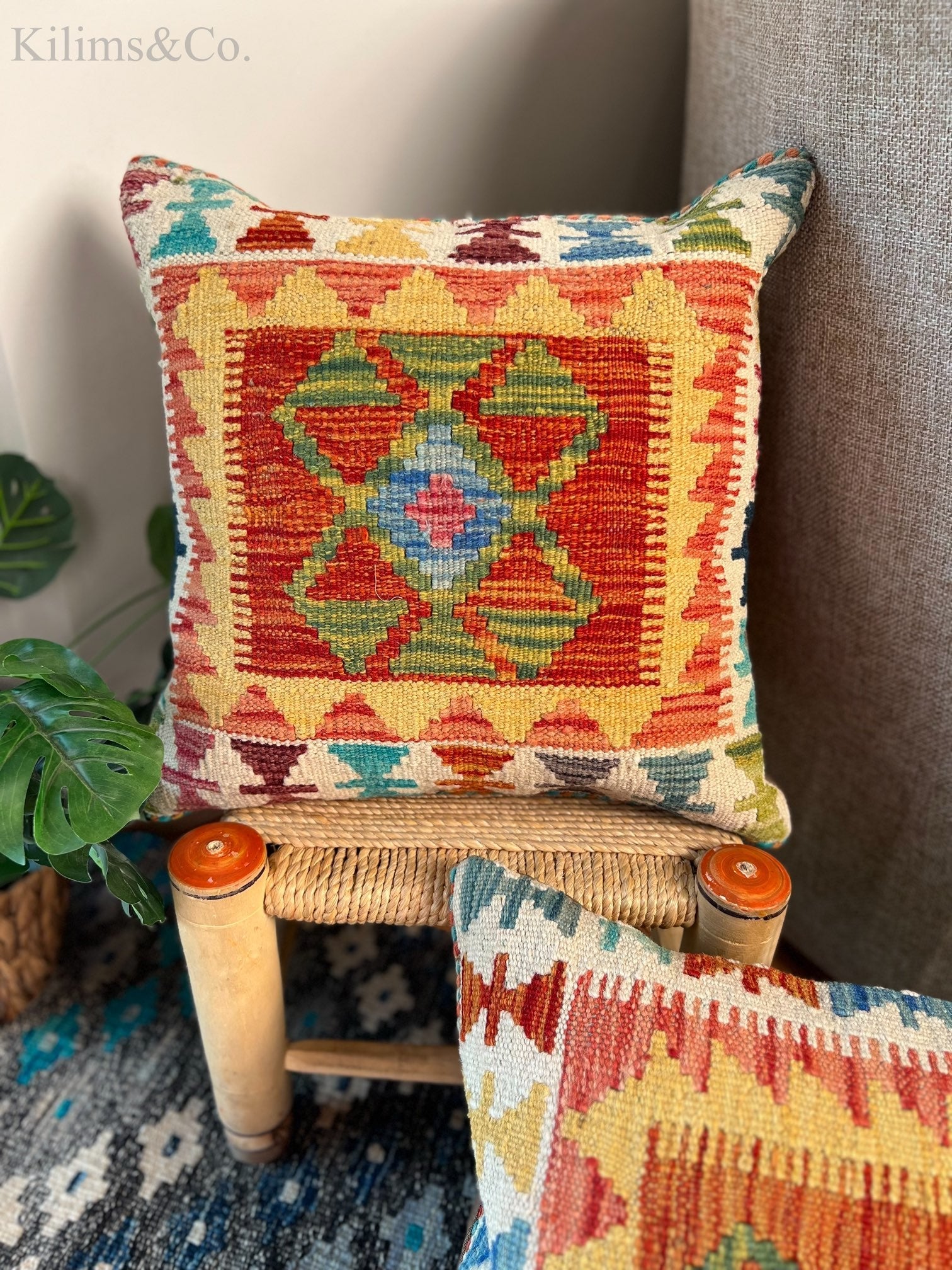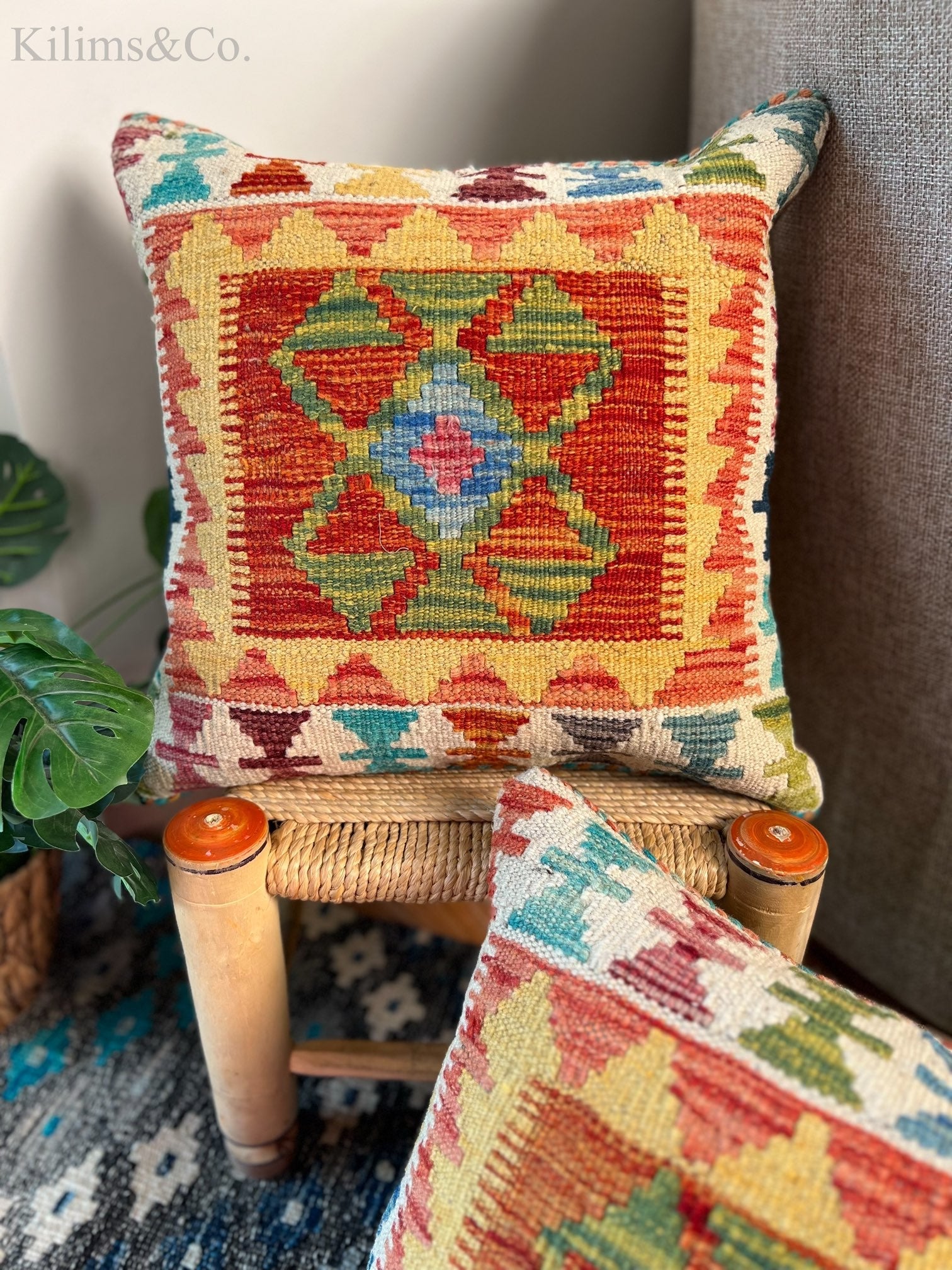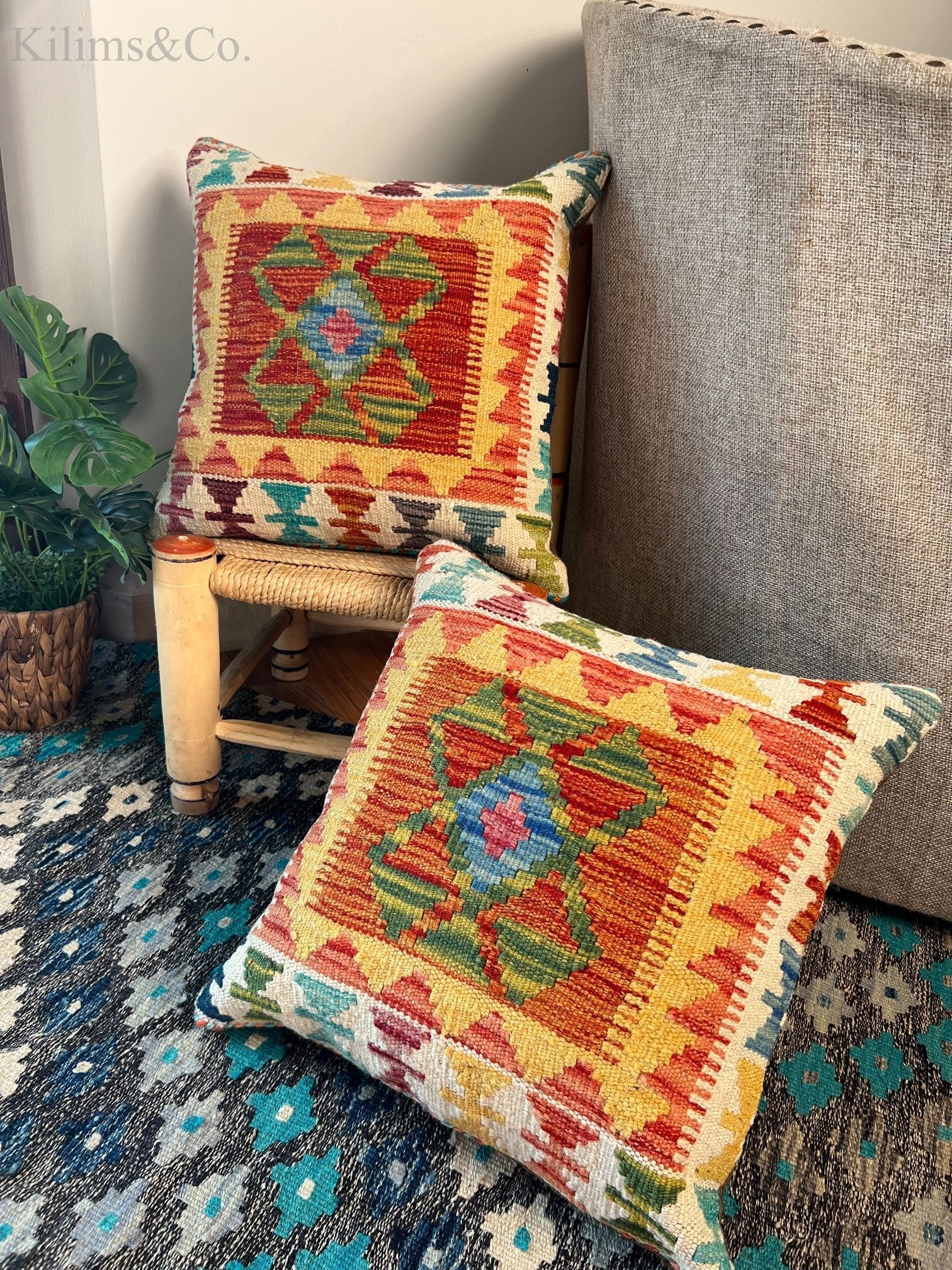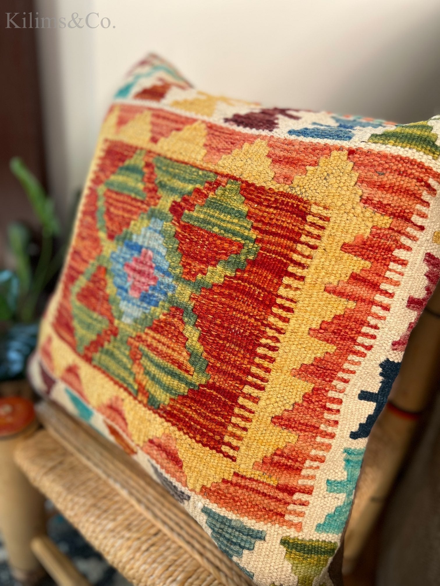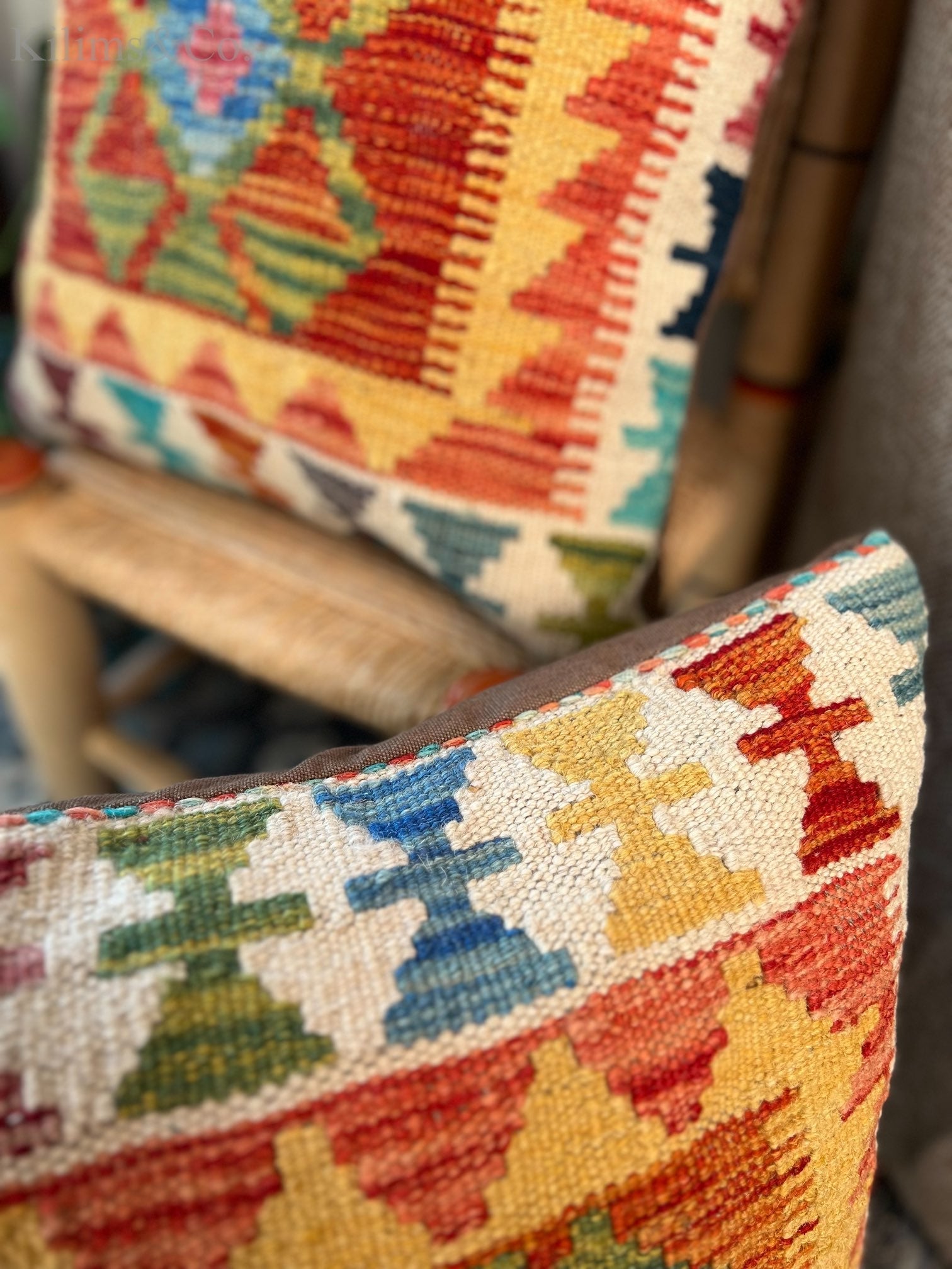 Handmade woollen cushion covers in a beautiful design that will make your home feel like you're in the middle of a dream. These cushions are made from kilim, which is a type of woven textiles that originated in Afghanistan. They have vibrant colours and look great with any decor!