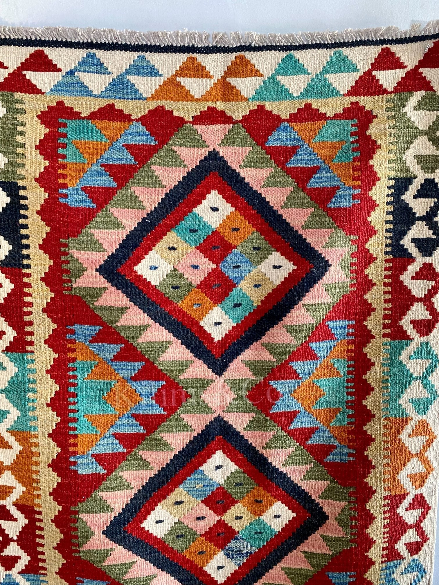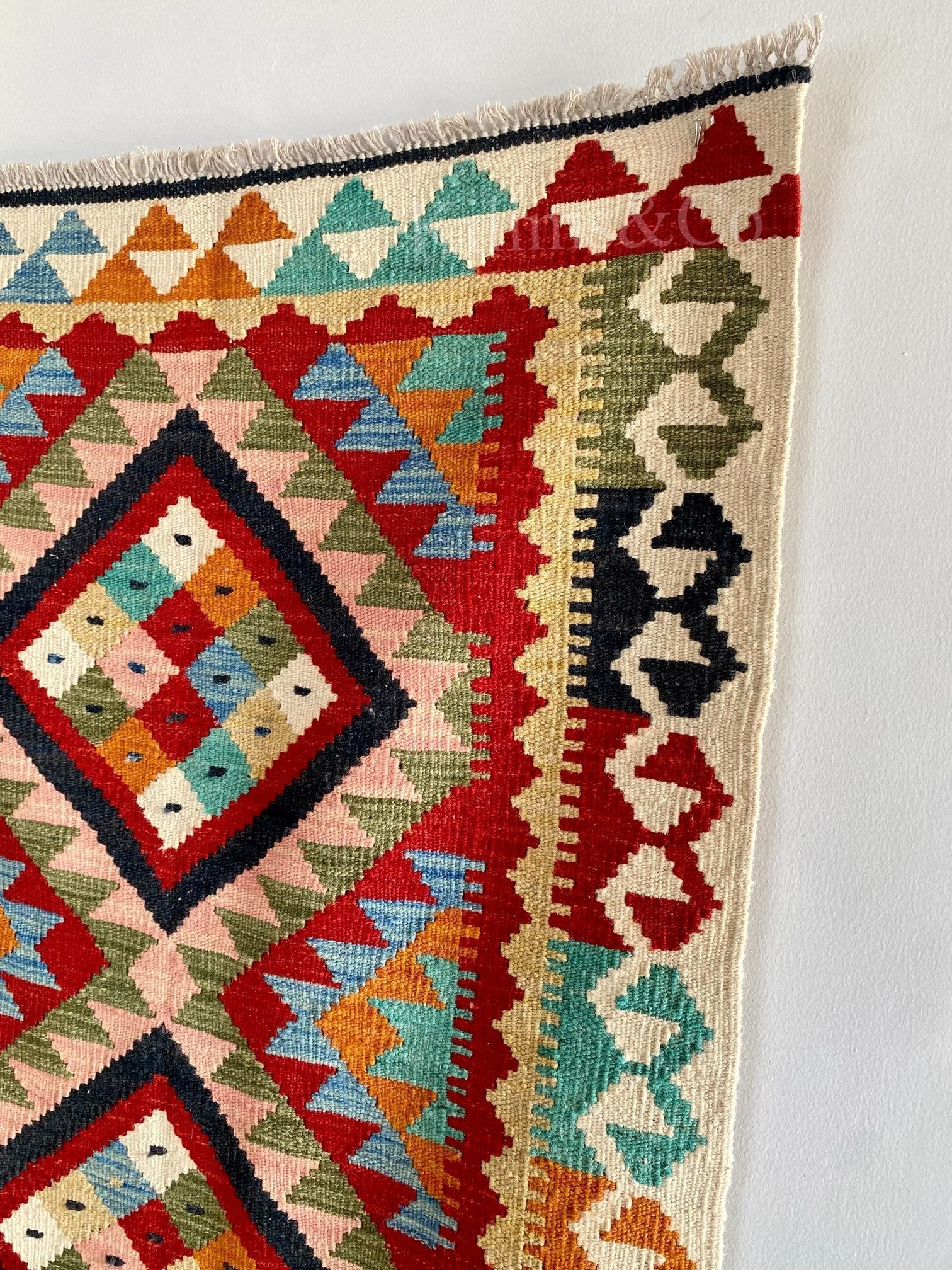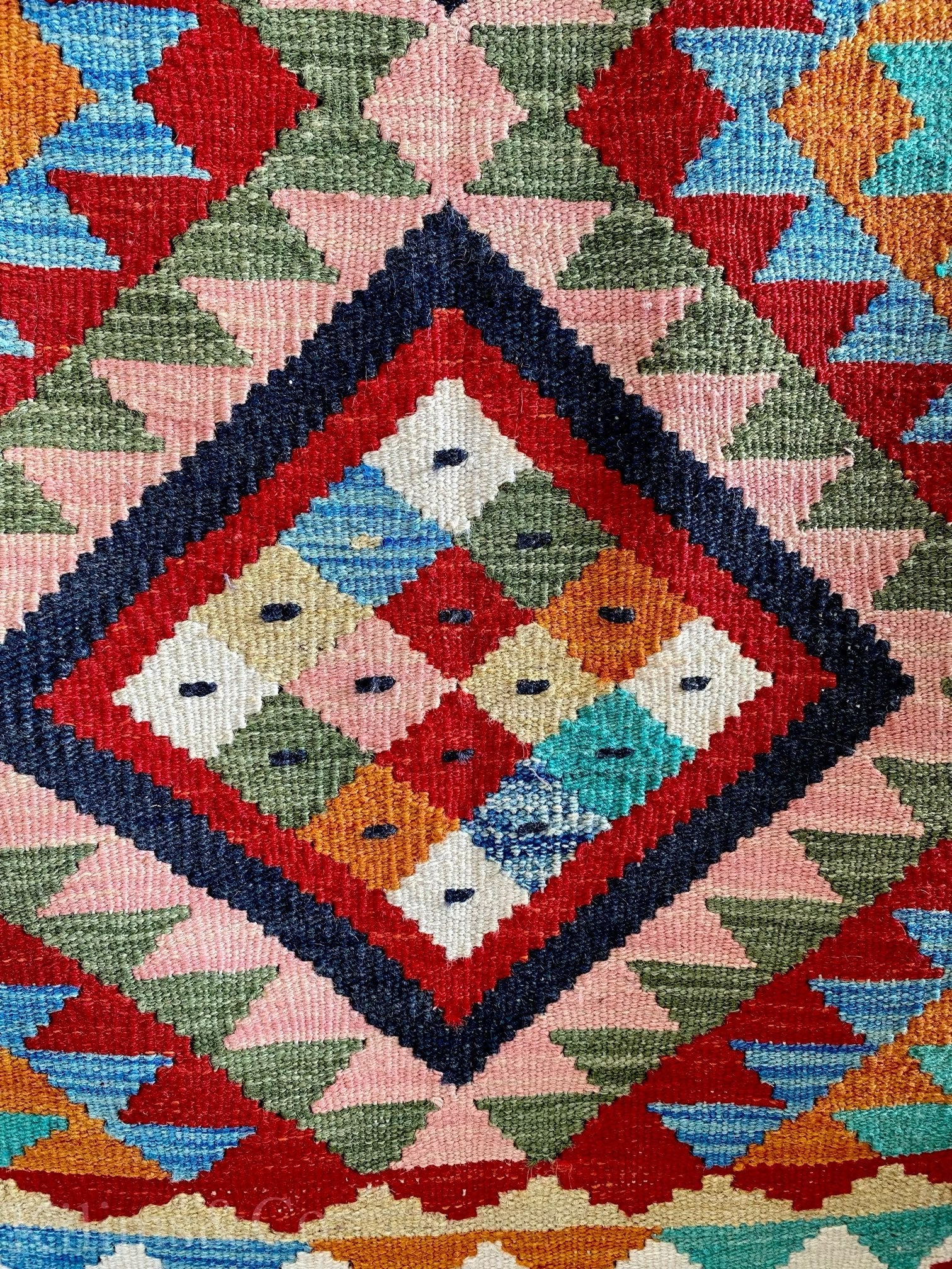 The Carnival Diamond Kilim is a festive and lively piece that features a dazzling diamond pattern in a riot of colors. The kilim's diamond shapes are woven in various shades of red, orange, yellow, green, blue, and purple, evoking the playful and vibrant colors of a carnival. The intricate diamond pattern is carefully woven by skilled artisans, resulting in a kilim that is both beautiful and durable. The Carnival Diamond Kilim is a perfect choice for adding a touch of whimsy and fun to any room, and its lively colors are sure to lift your spirits. Whether used as a statement piece or as an accent, this kilim is guaranteed to bring joy and cheer to your space.