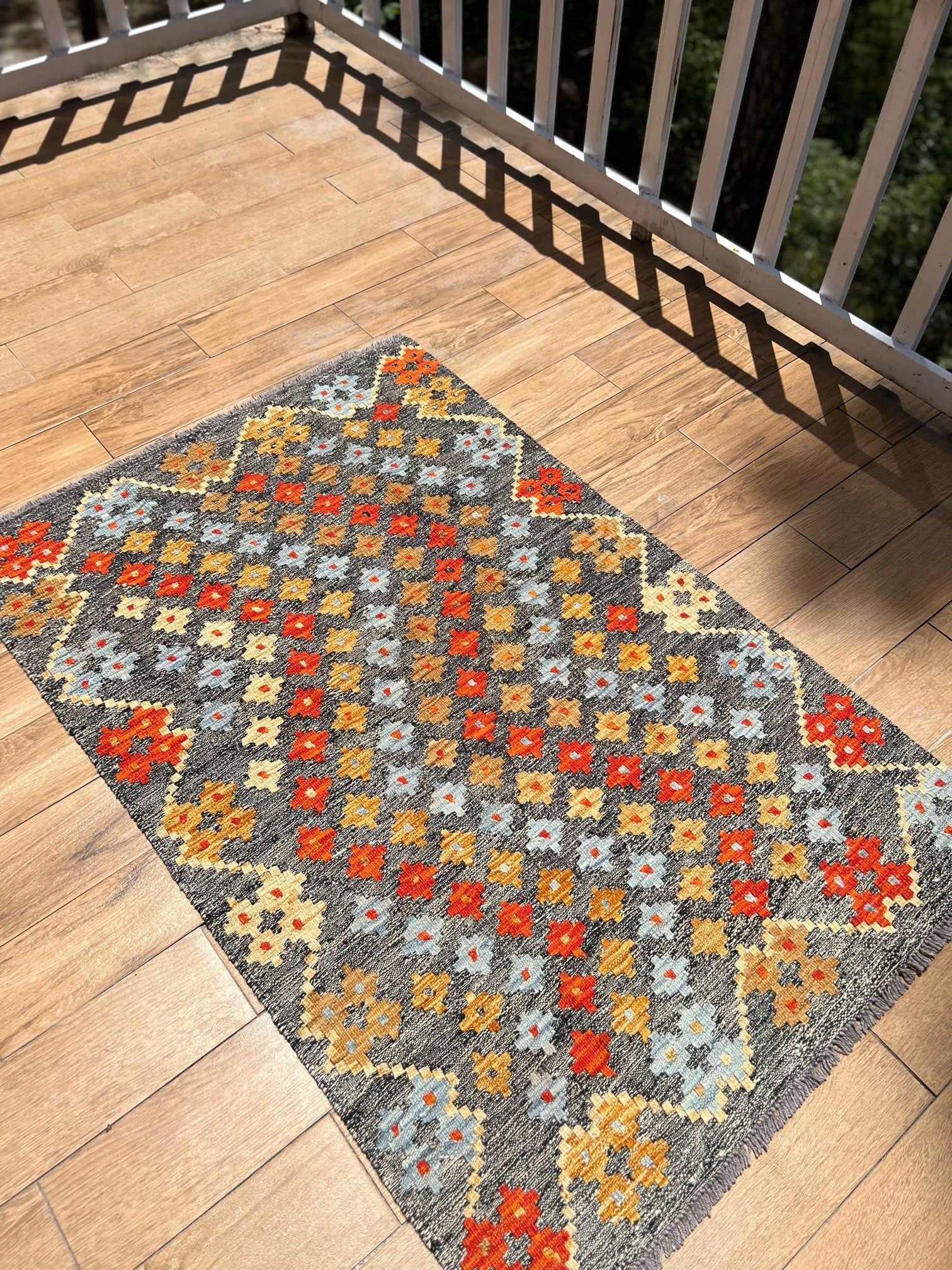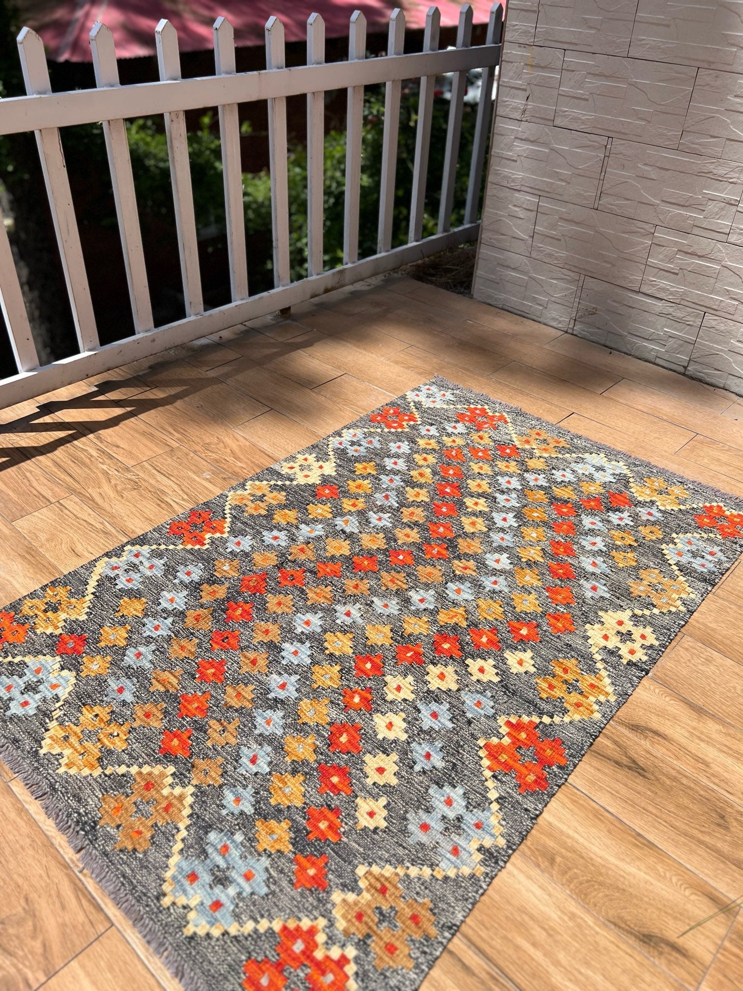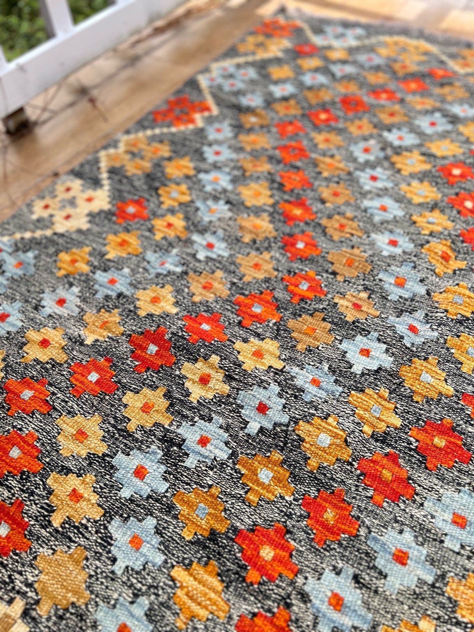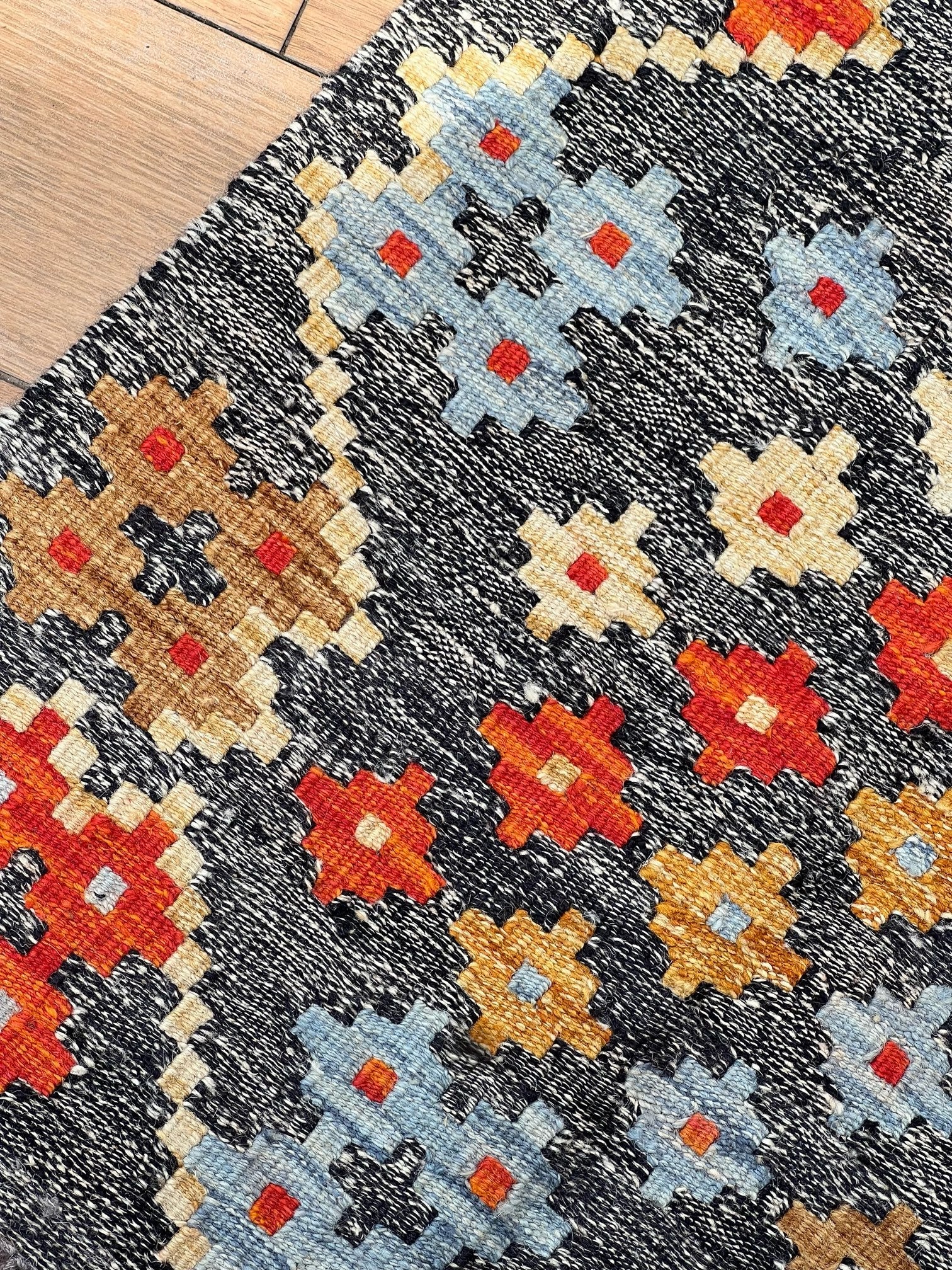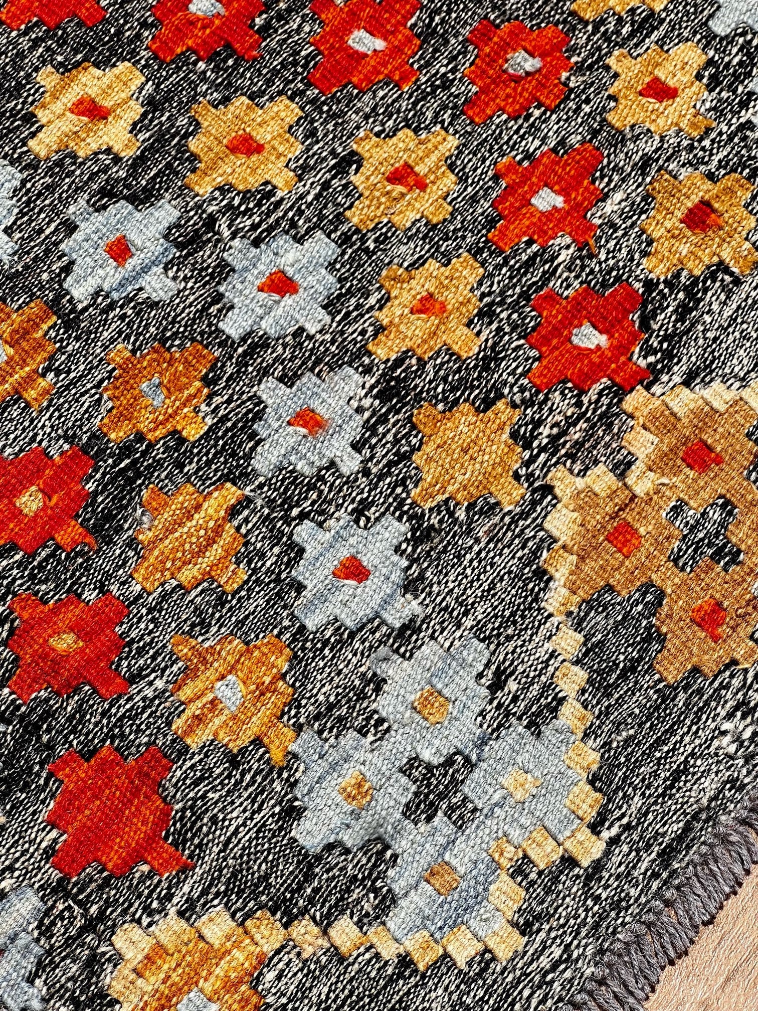 Immerse yourself in the exquisite world of artisanal craftsmanship with the "Ember Blossom" kilim. Handwoven to perfection by master craftsmen, this exceptional piece is a testament to timeless artistry and unrivaled dedication. Only the finest sheep wool, renowned for its softness and durability, is meticulously chosen to form the foundation of this kilim. Each thread is infused with vibrant, natural dyes, sourced from the heart of nature, creating a mesmerizing symphony of colors.