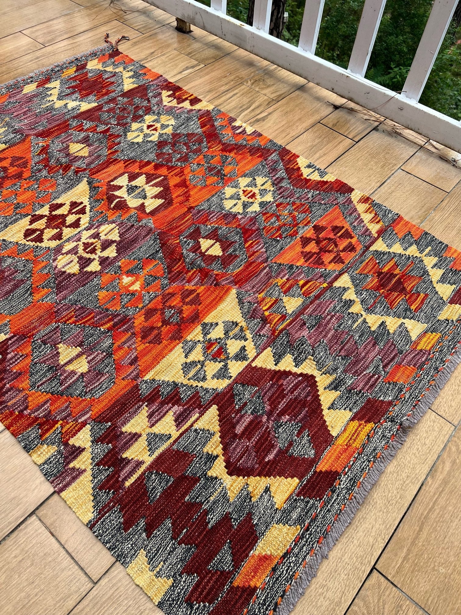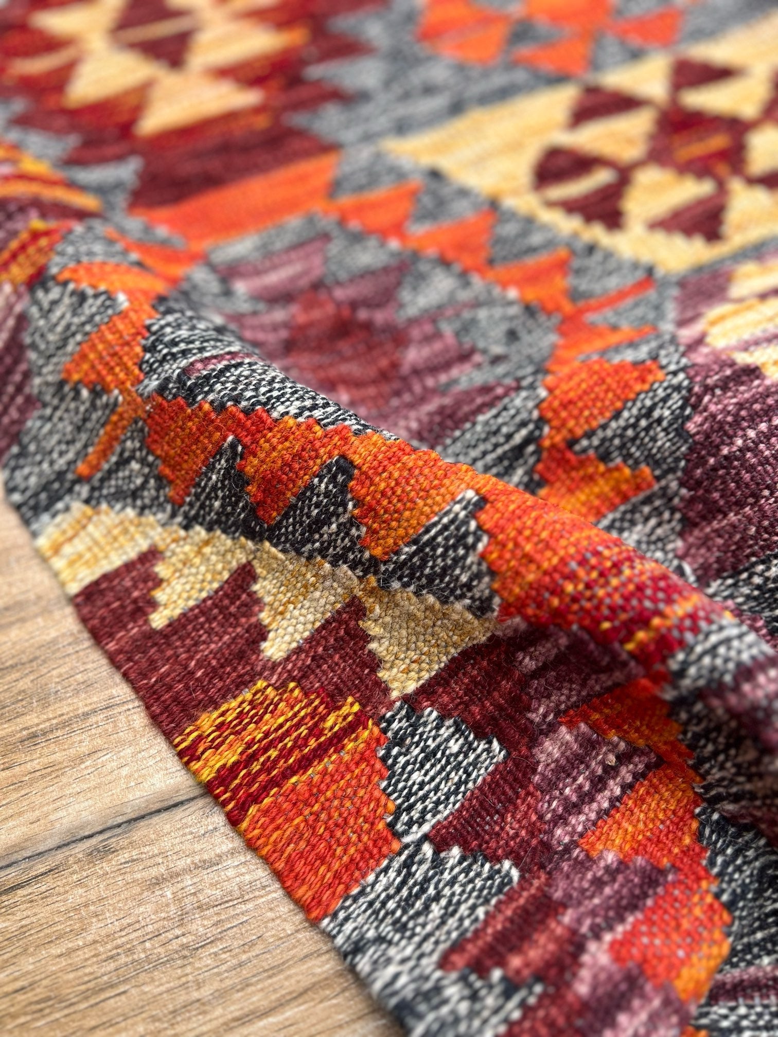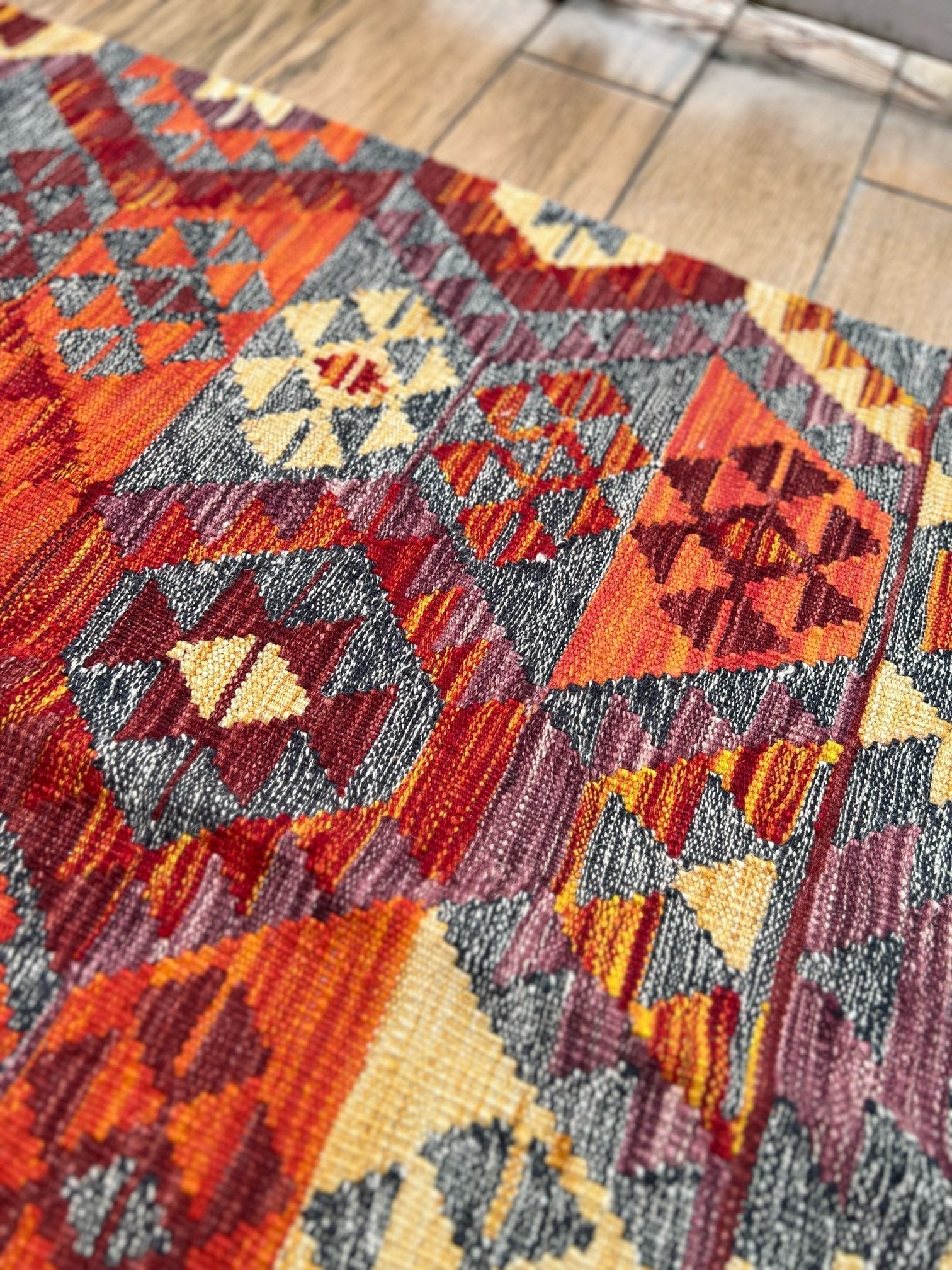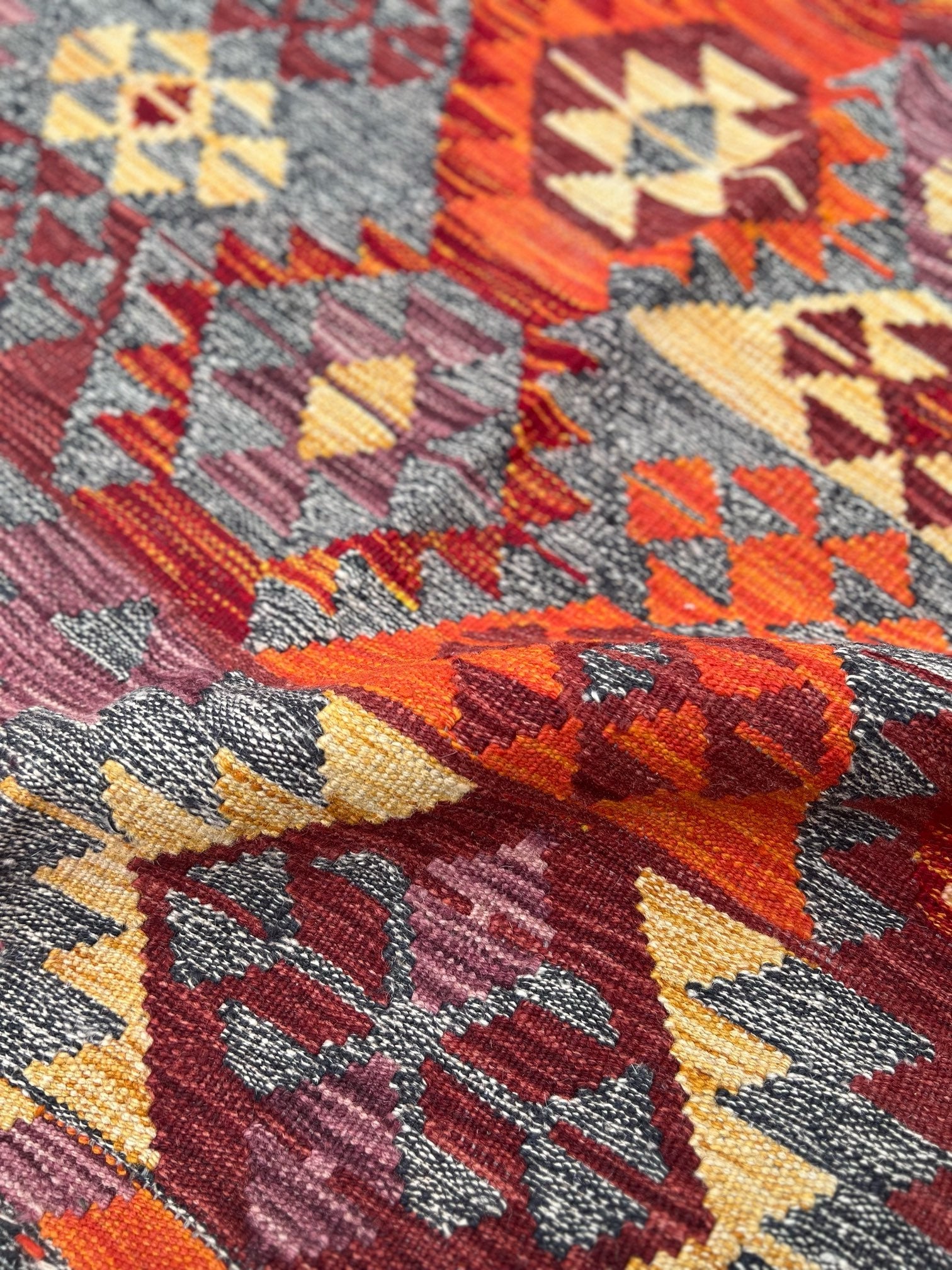 Handwoven with utmost precision, this kilim exudes timeless beauty and sophistication. The base color of the kilim is a serene and soothing shade of grey, reminiscent of misty mountain peaks; adorned with fiery orange prints, creating a striking and captivating contrast. Made from pure sheep wool and dyed with natural botanical dyes, this kilim represents the perfect blend of traditional craftsmanship and contemporary design.