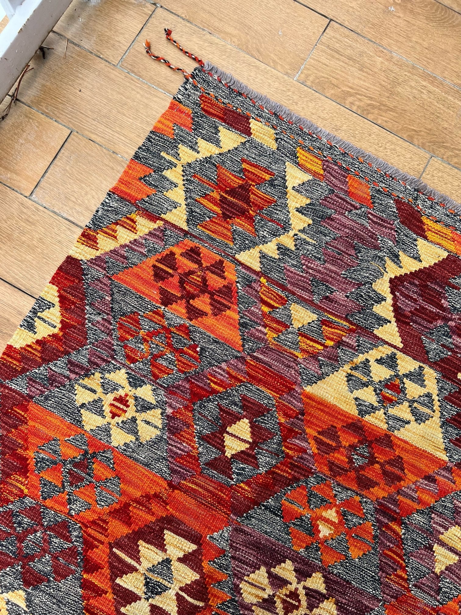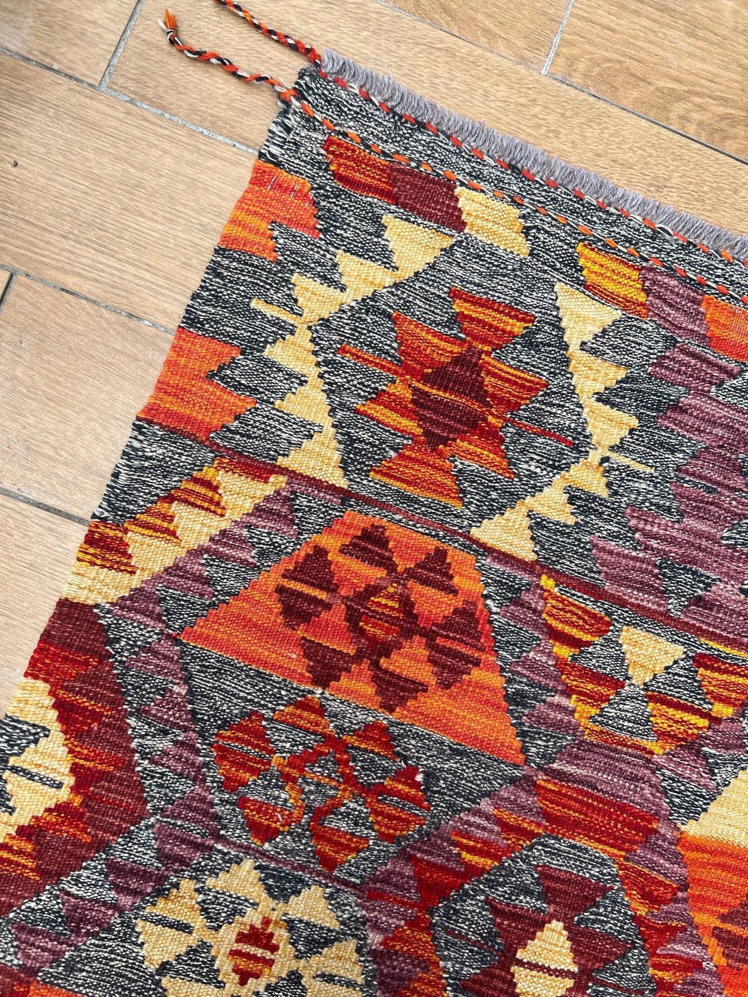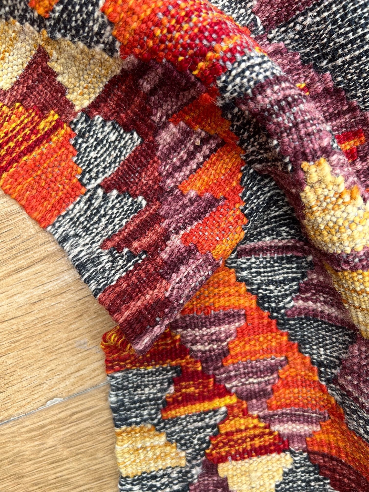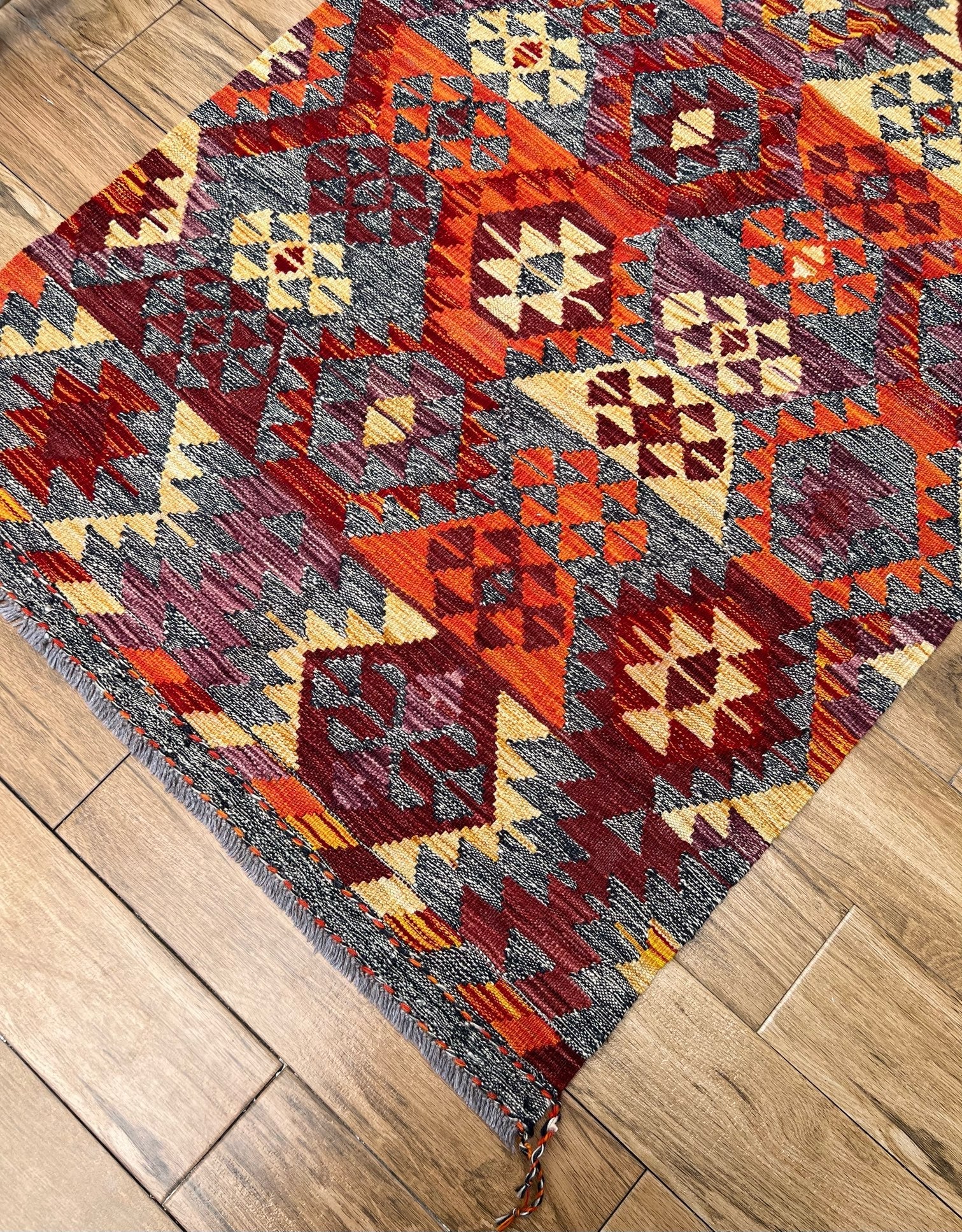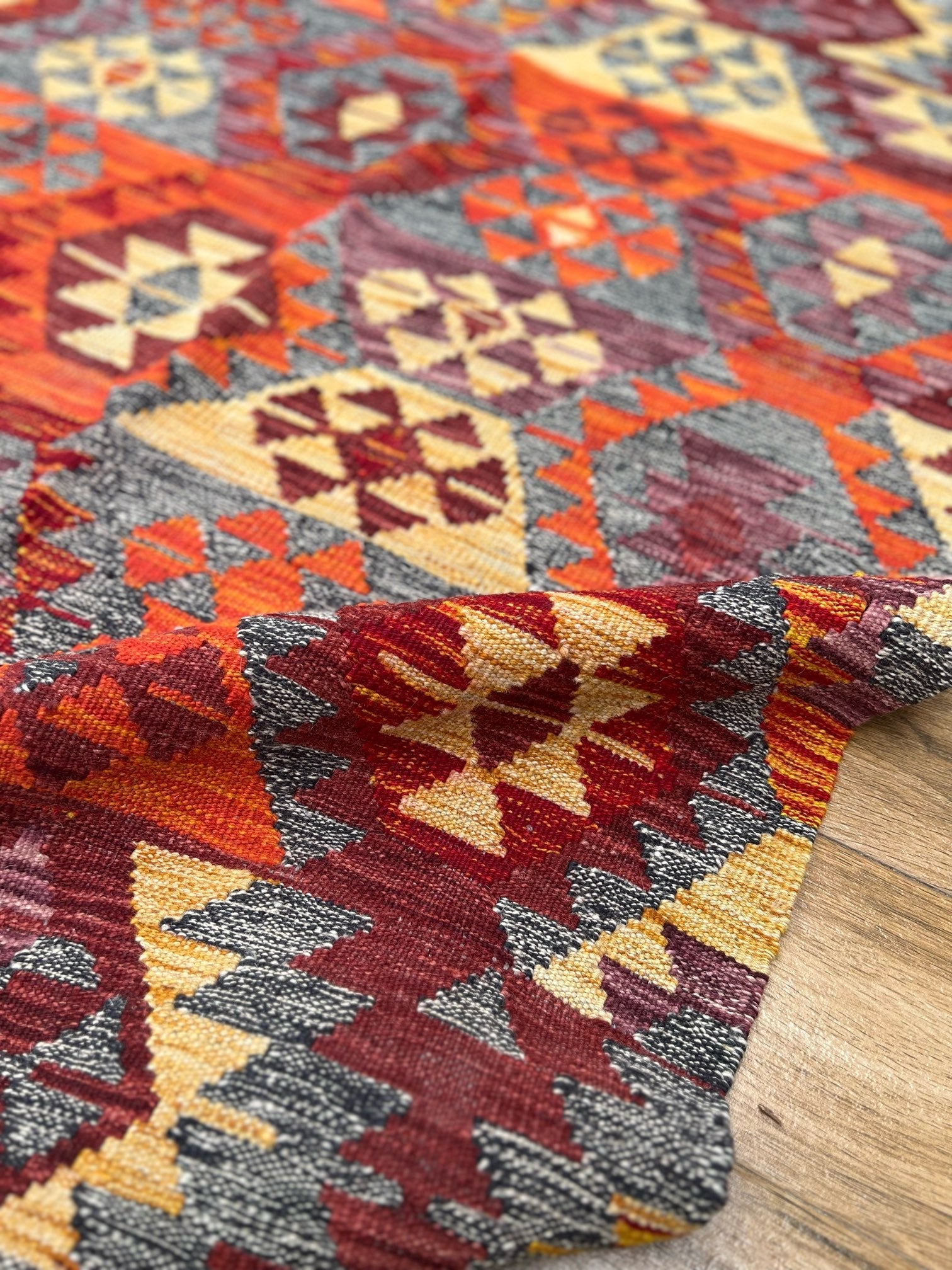 Handwoven with utmost precision, this kilim exudes timeless beauty and sophistication. The base color of the kilim is a serene and soothing shade of grey, reminiscent of misty mountain peaks; adorned with fiery orange prints, creating a striking and captivating contrast. Made from pure sheep wool and dyed with natural botanical dyes, this kilim represents the perfect blend of traditional craftsmanship and contemporary design.