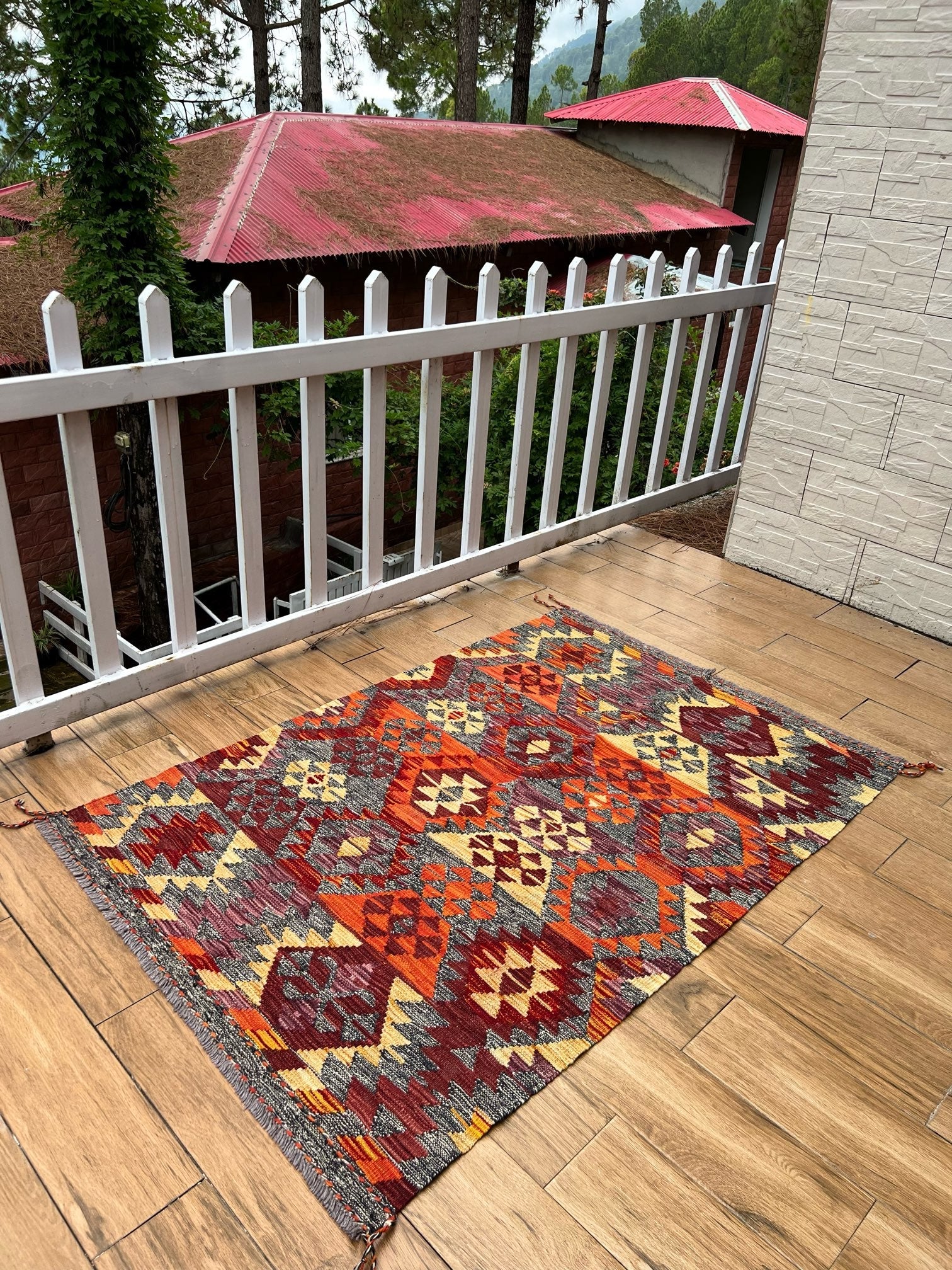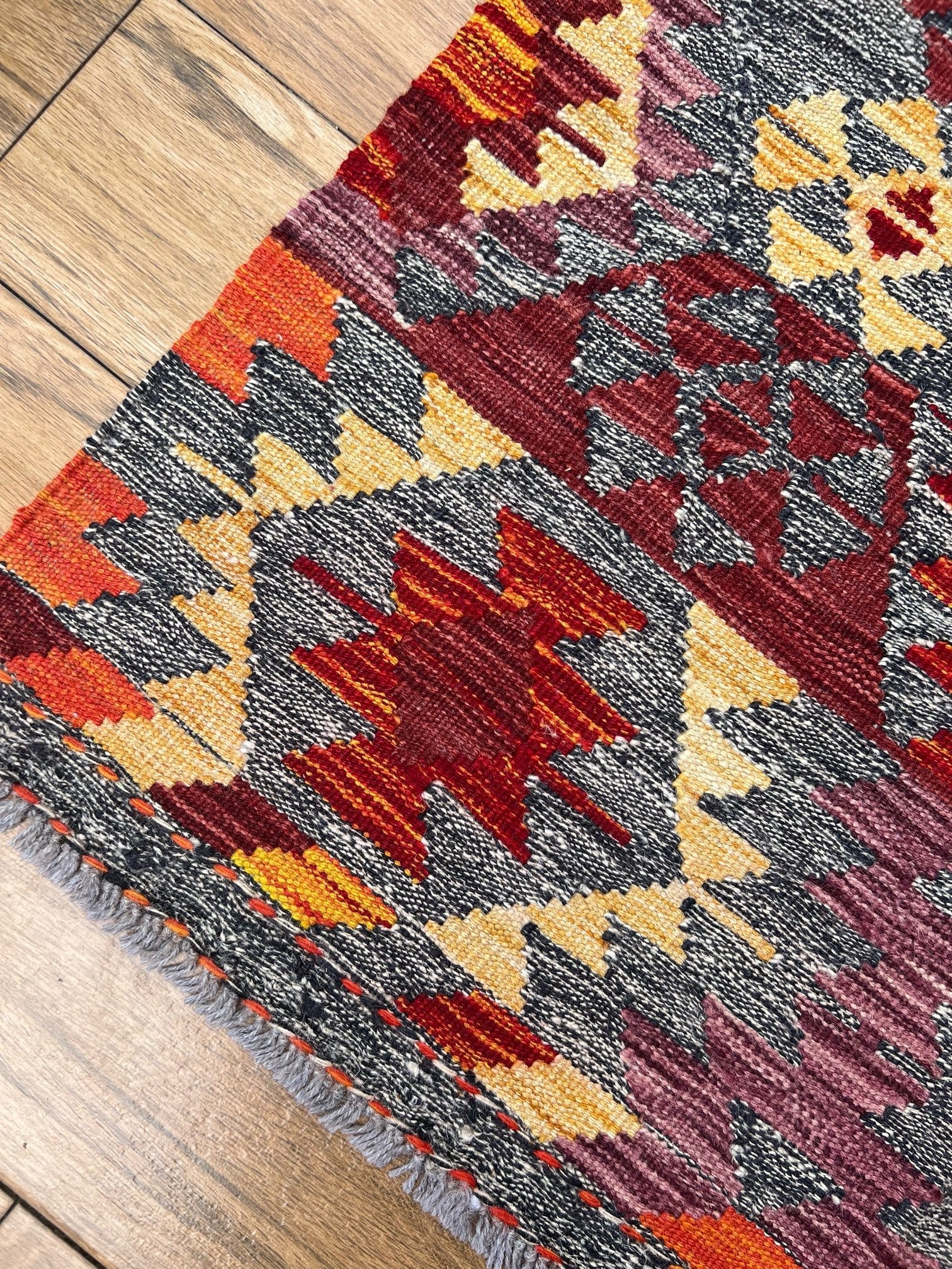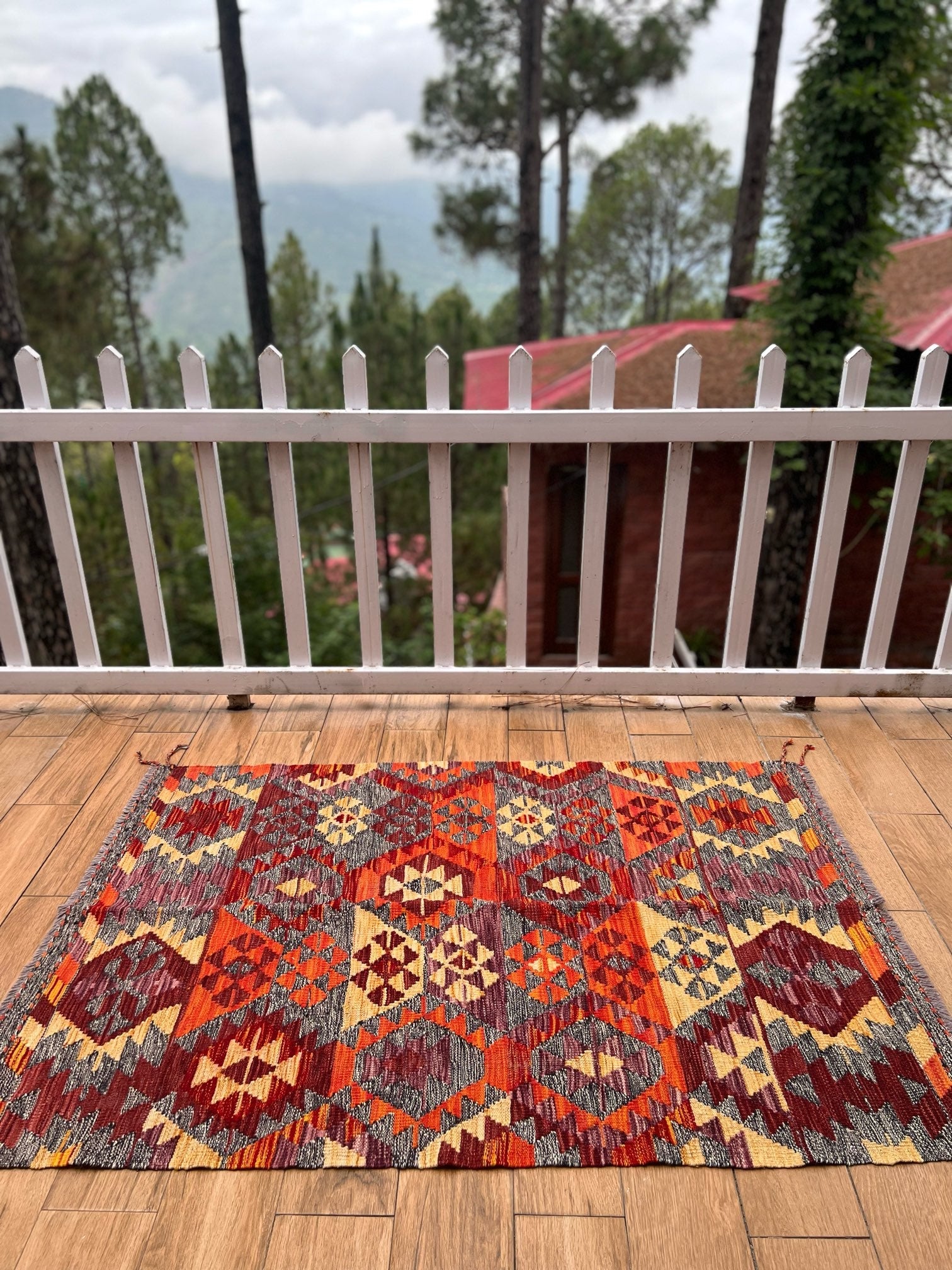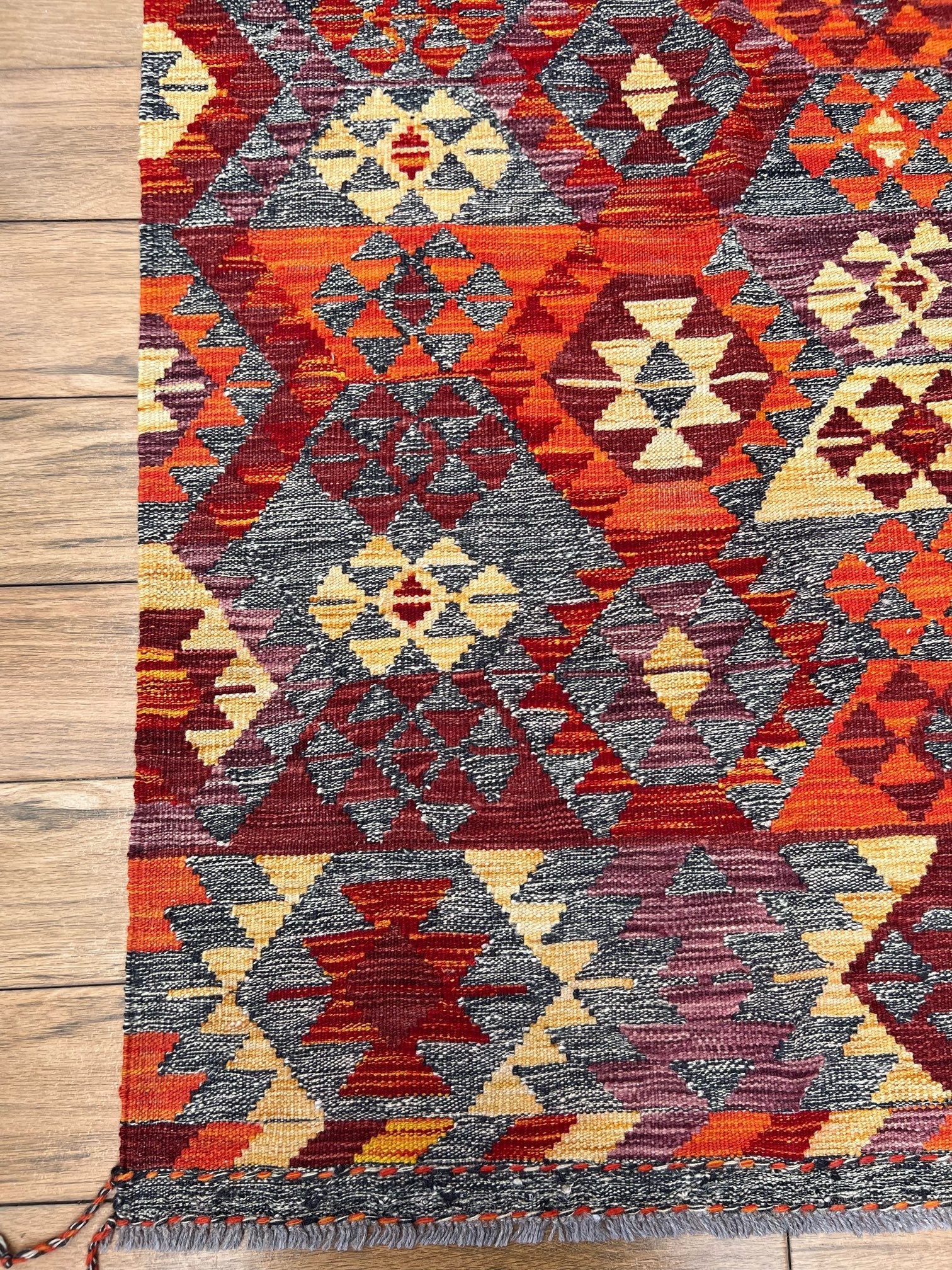 Handwoven with utmost precision, this kilim exudes timeless beauty and sophistication. The base color of the kilim is a serene and soothing shade of grey, reminiscent of misty mountain peaks; adorned with fiery orange prints, creating a striking and captivating contrast. Made from pure sheep wool and dyed with natural botanical dyes, this kilim represents the perfect blend of traditional craftsmanship and contemporary design.