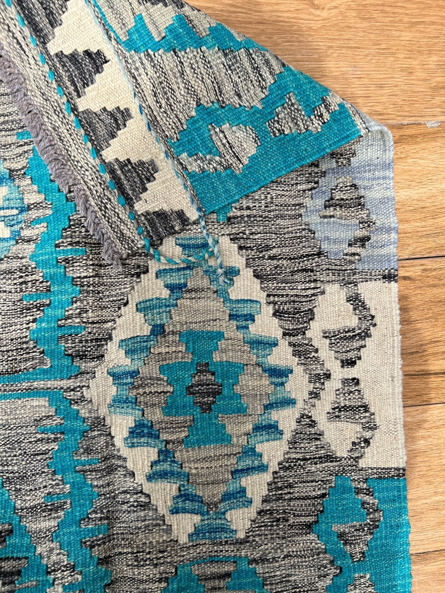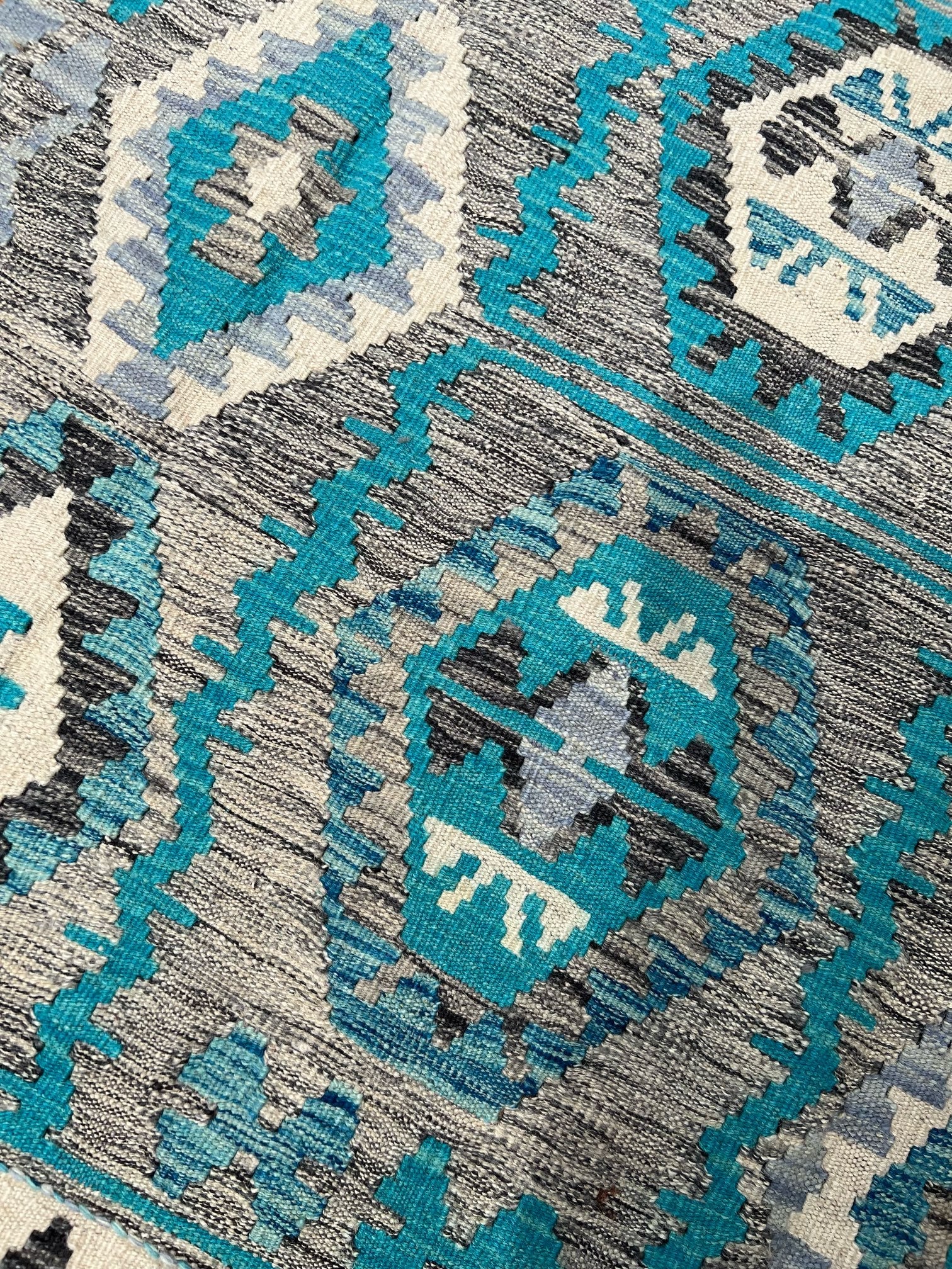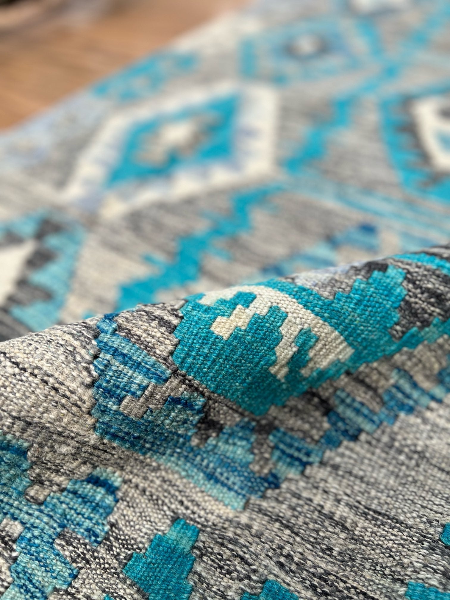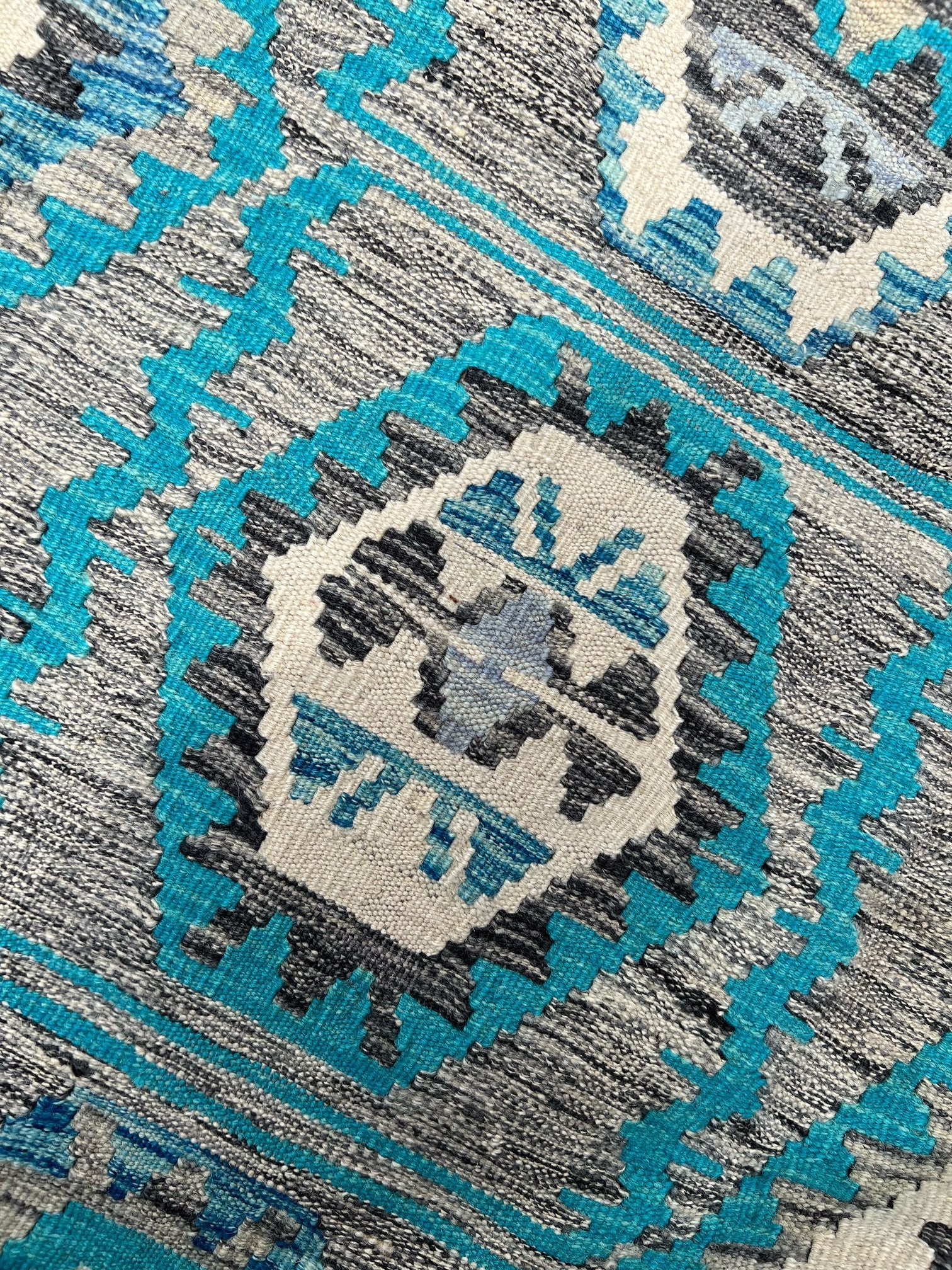 Crafted with meticulous attention to detail, Frosty Elegance reflects the expertise of master craftsmen. The grey static pattern creates a sense of depth and texture, while the intricate icy blue and white traditional motif adds an element of timeless elegance. The combination of these elements results in a kilim that exudes sophistication and allure.
