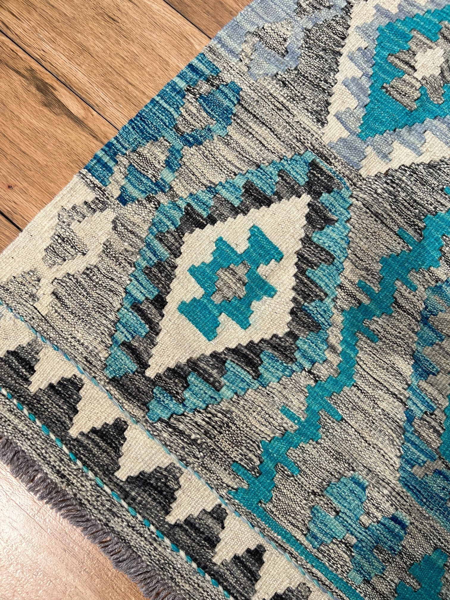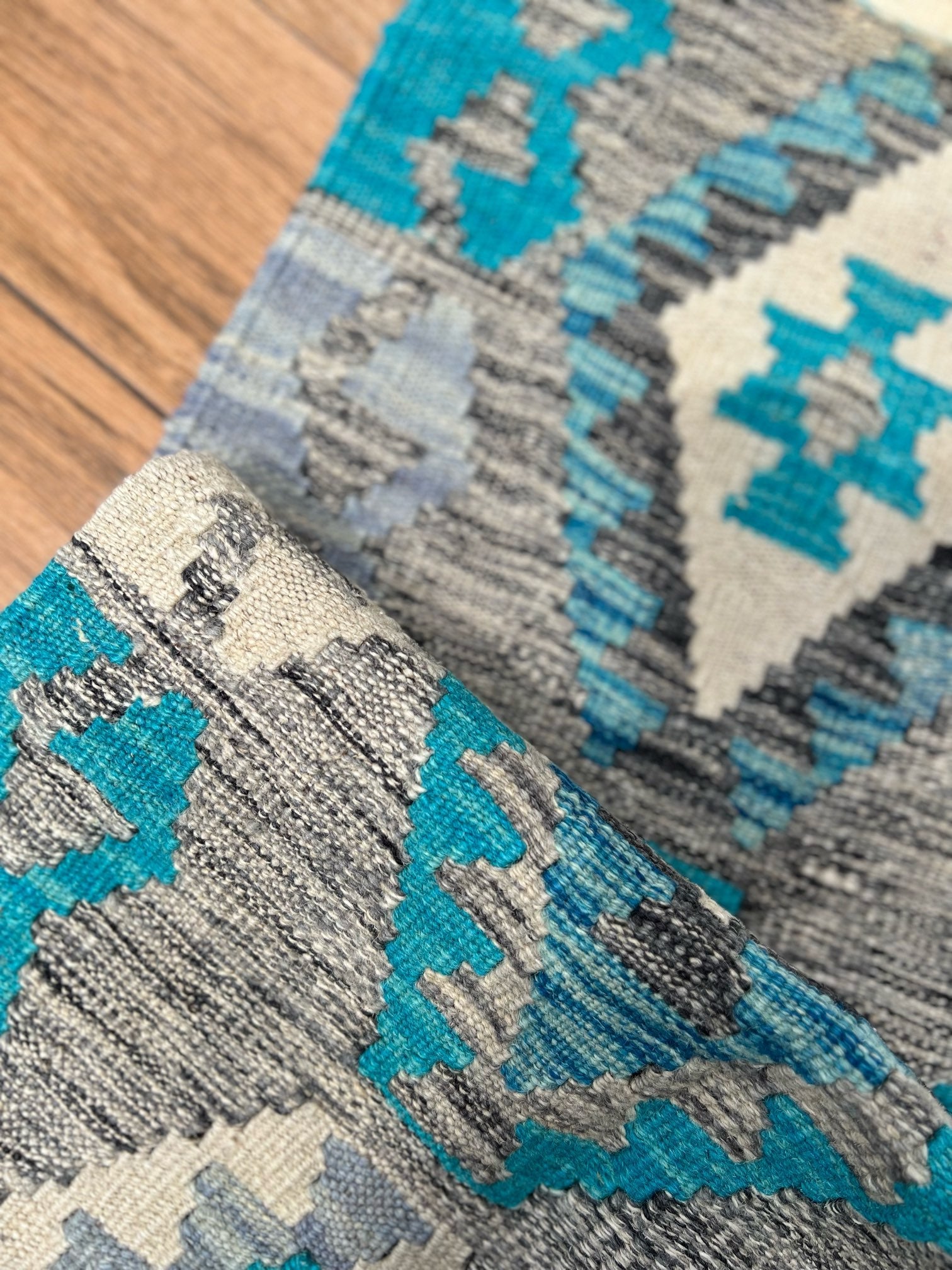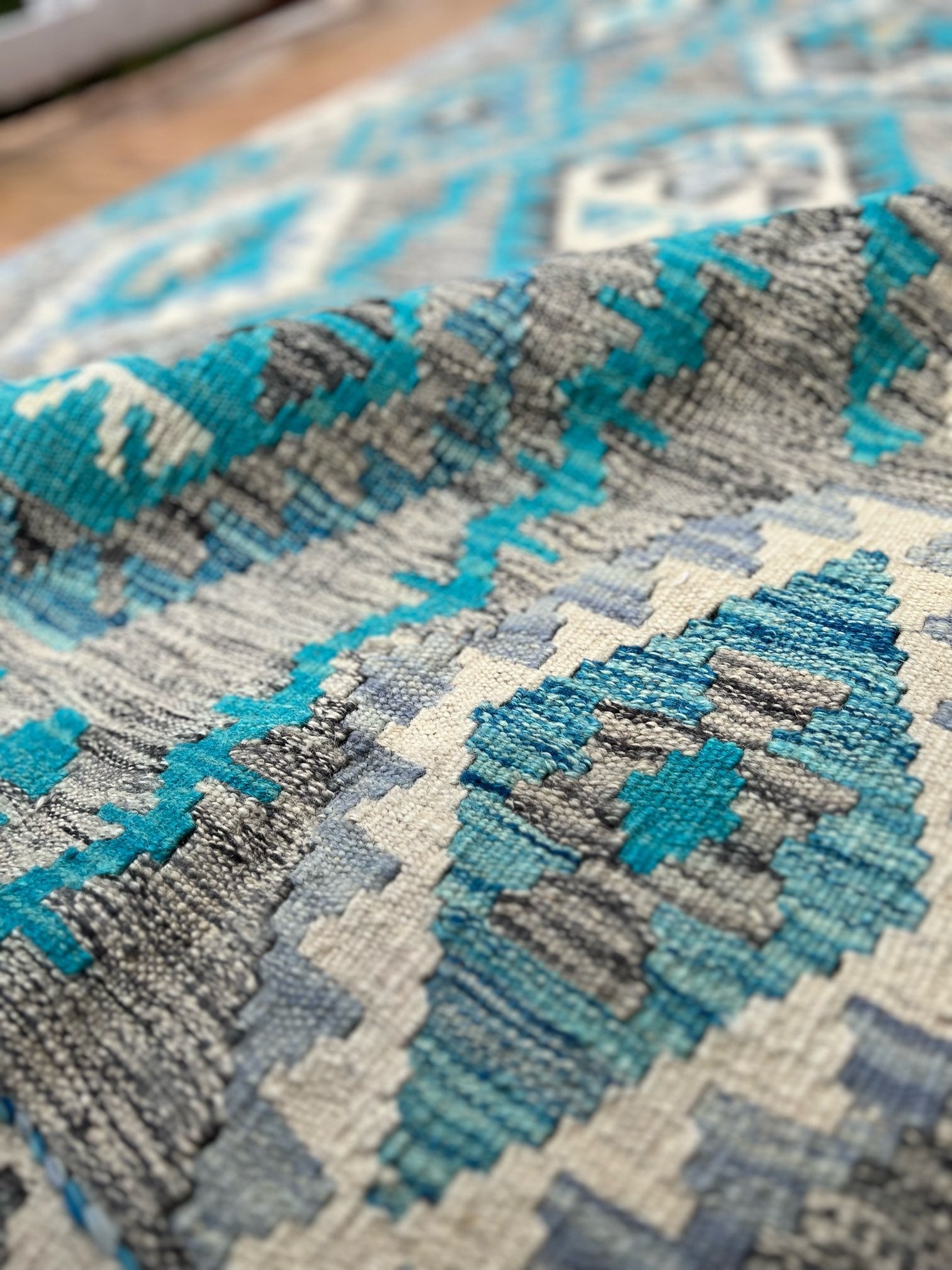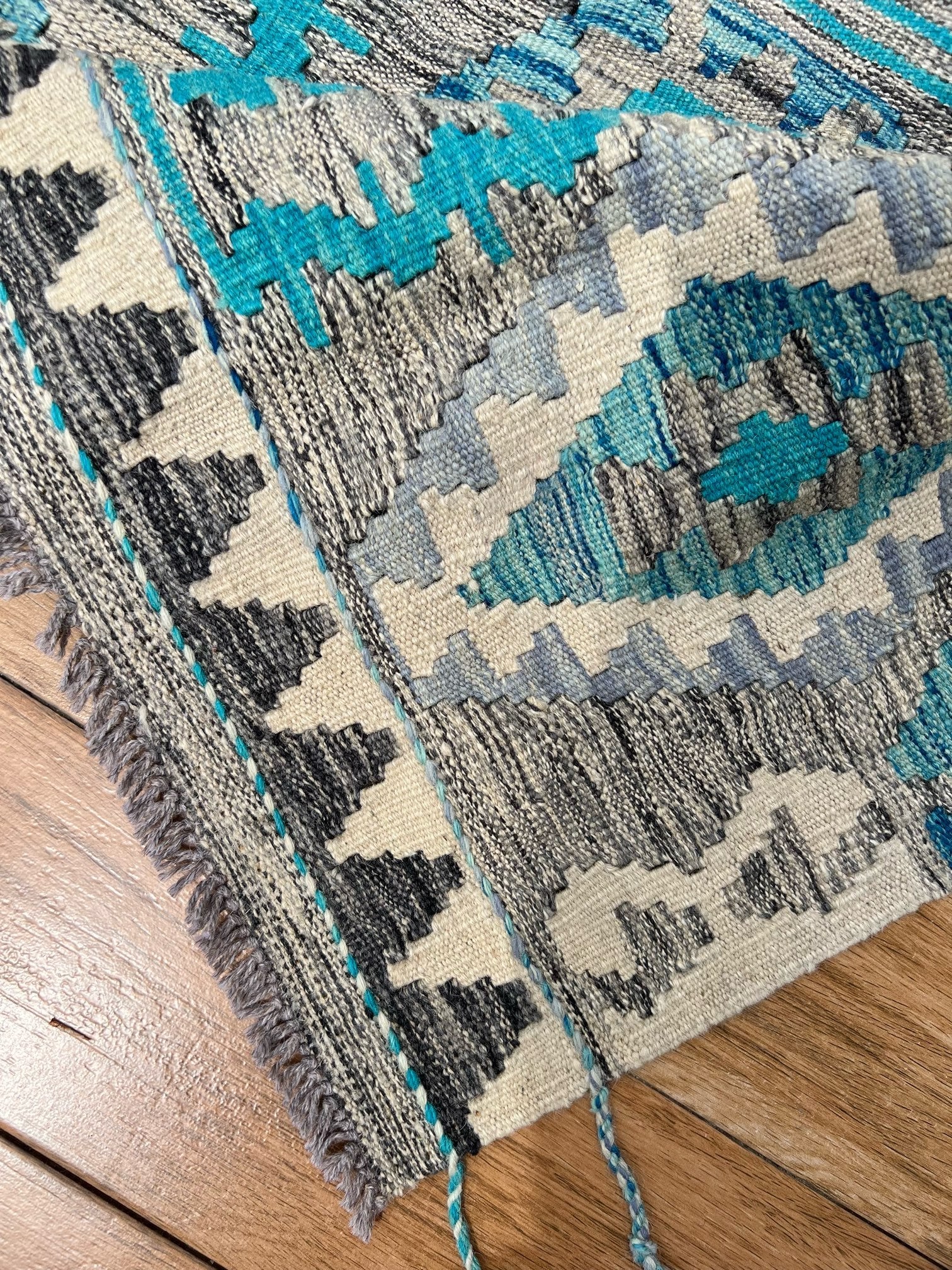 Crafted with meticulous attention to detail, Frosty Elegance reflects the expertise of master craftsmen. The grey static pattern creates a sense of depth and texture, while the intricate icy blue and white traditional motif adds an element of timeless elegance. The combination of these elements results in a kilim that exudes sophistication and allure.