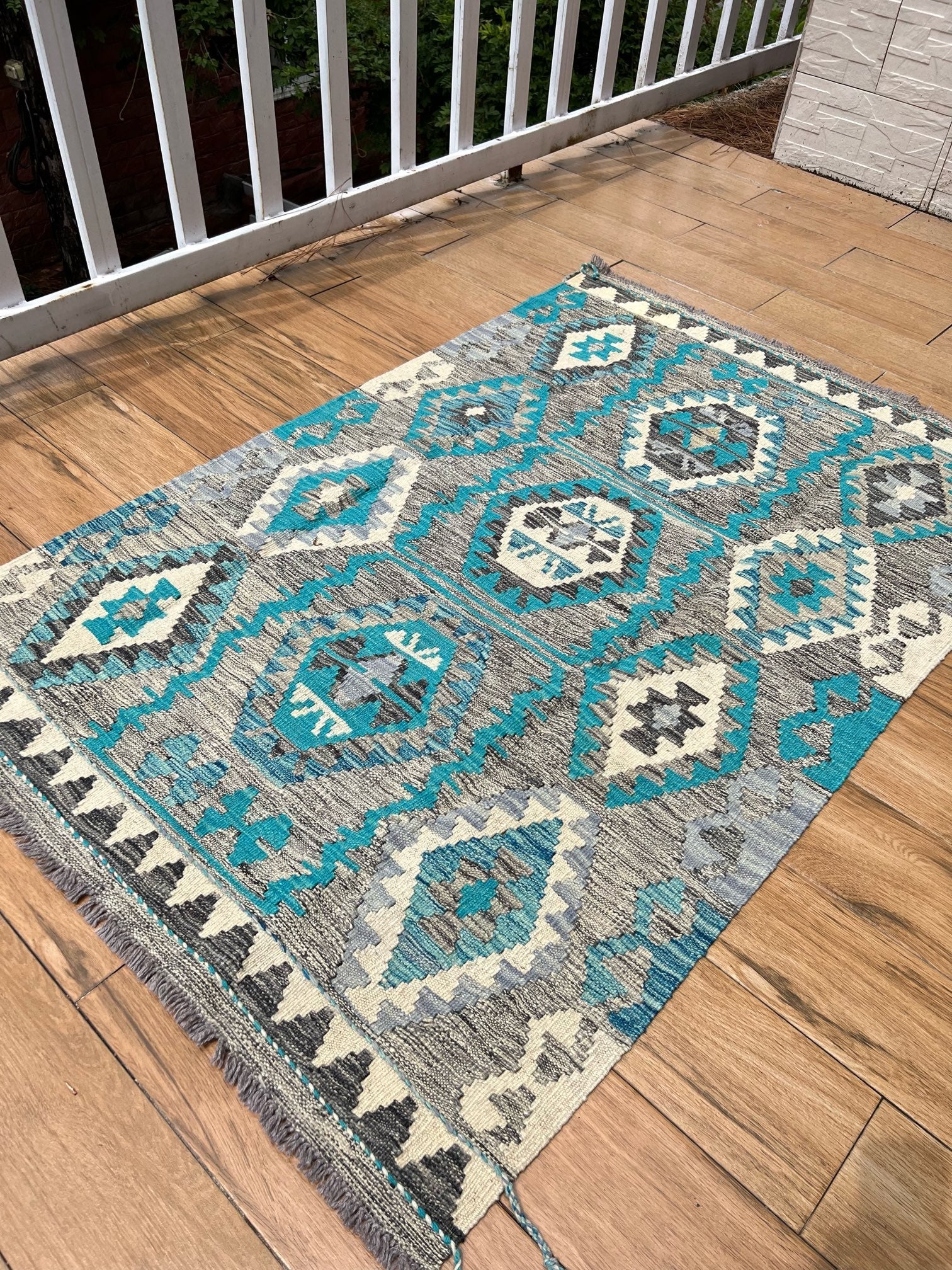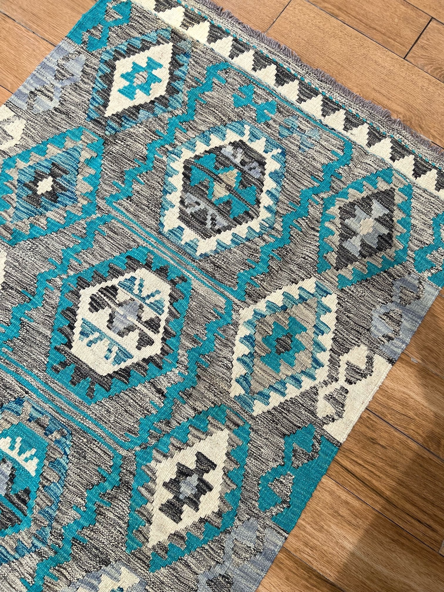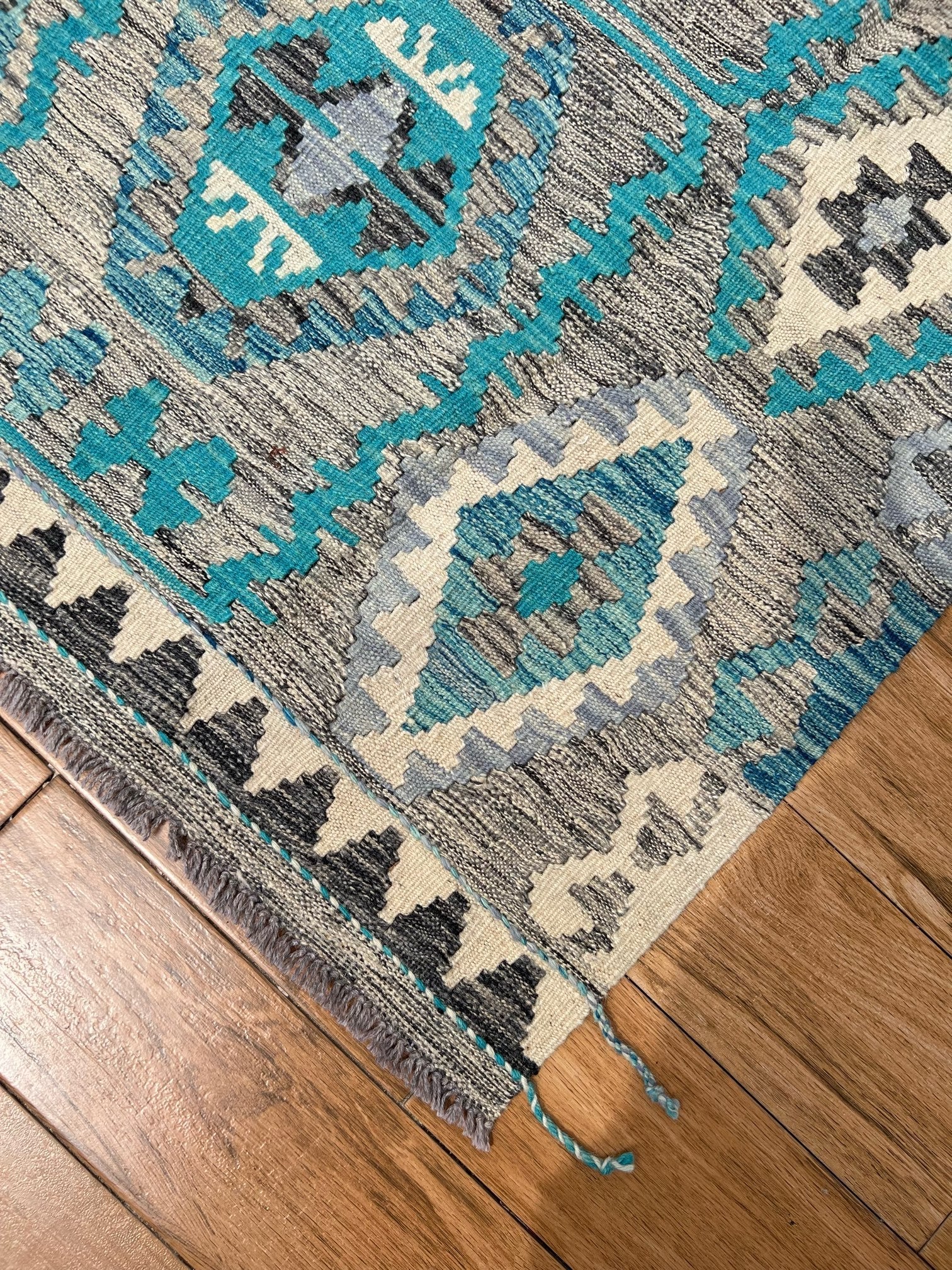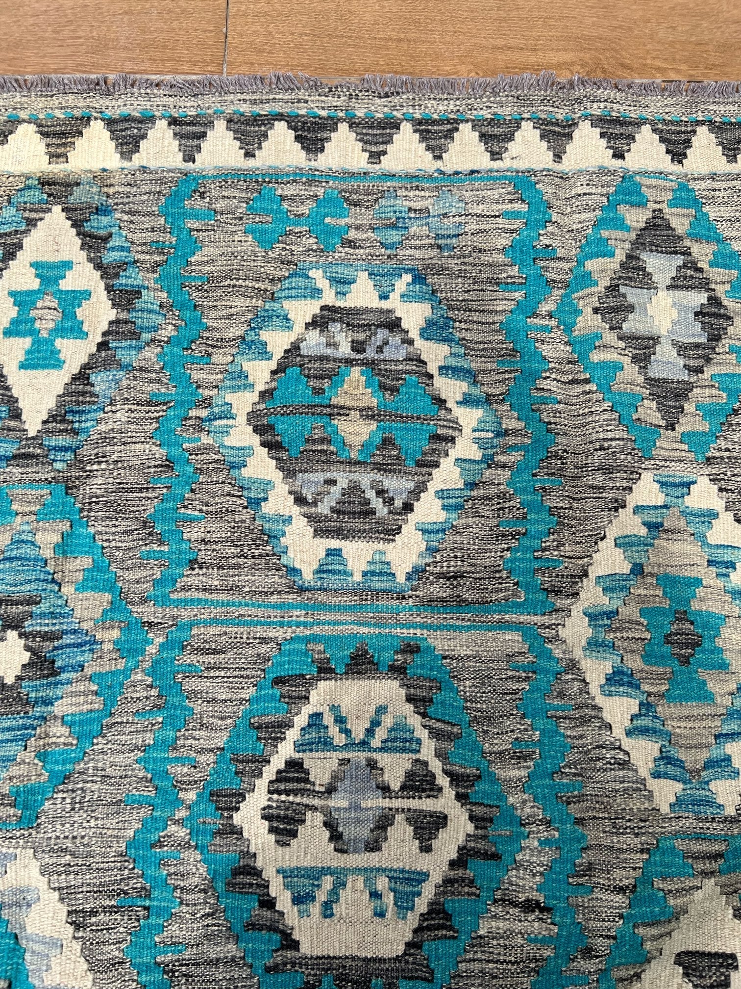 Crafted with meticulous attention to detail, Frosty Elegance reflects the expertise of master craftsmen. The grey static pattern creates a sense of depth and texture, while the intricate icy blue and white traditional motif adds an element of timeless elegance. The combination of these elements results in a kilim that exudes sophistication and allure.