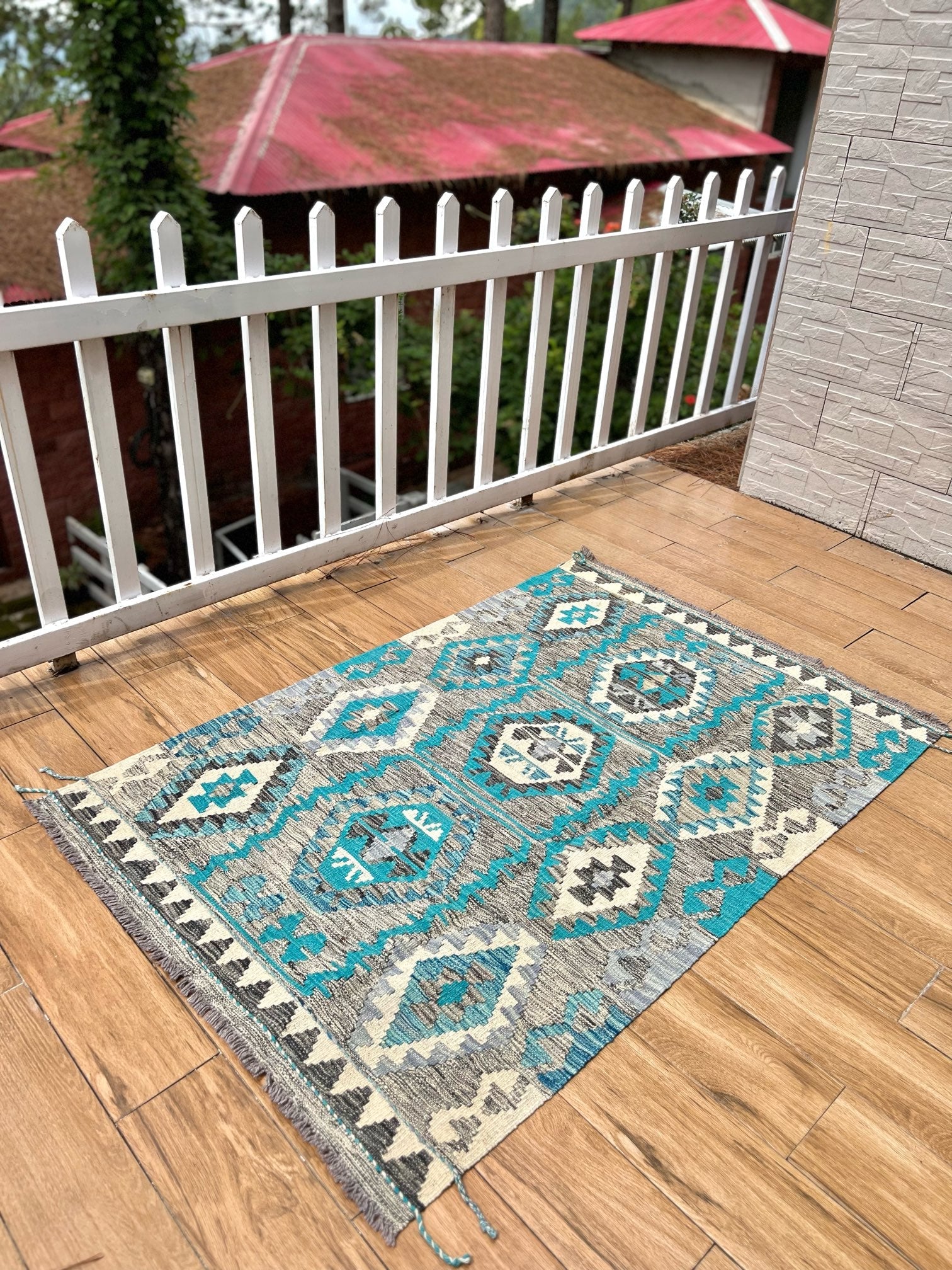 Frosty Elegance is a premium kilim that beautifully combines traditional charm with a touch of contemporary aesthetics. Its design showcases a grey static-like pattern as the base, overlaid with an icy blue and white traditional motif.