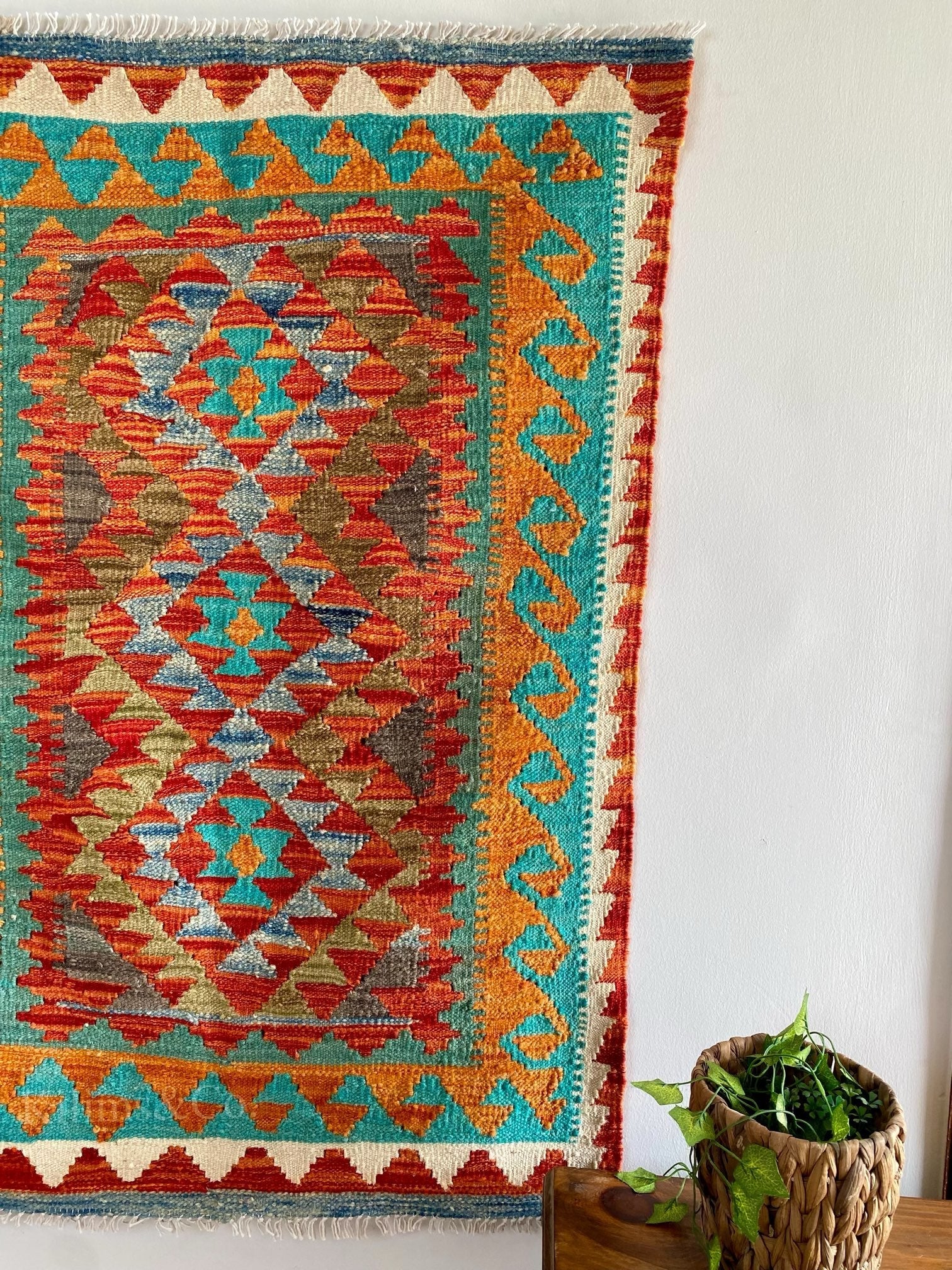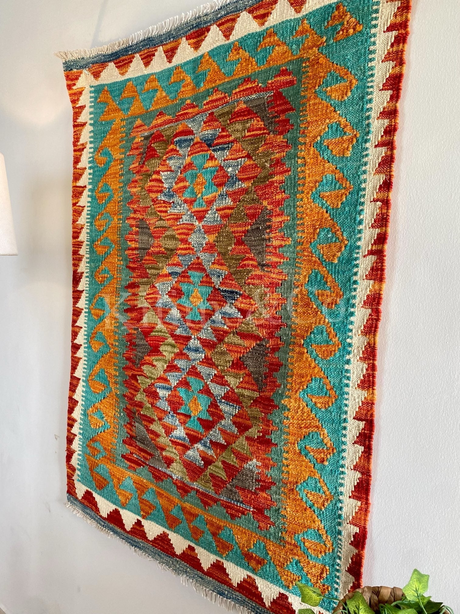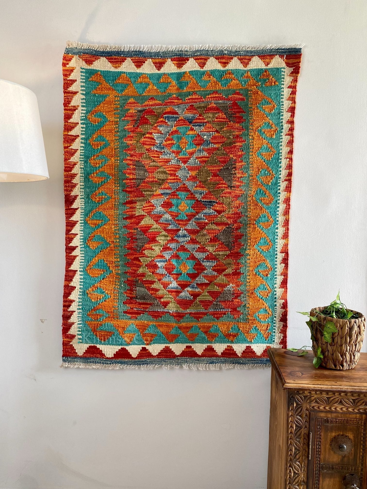 Decorate your walls with this Premium Afghan Kilim, it's sharp vivid colours will please the eyes and make your room feel more homely.