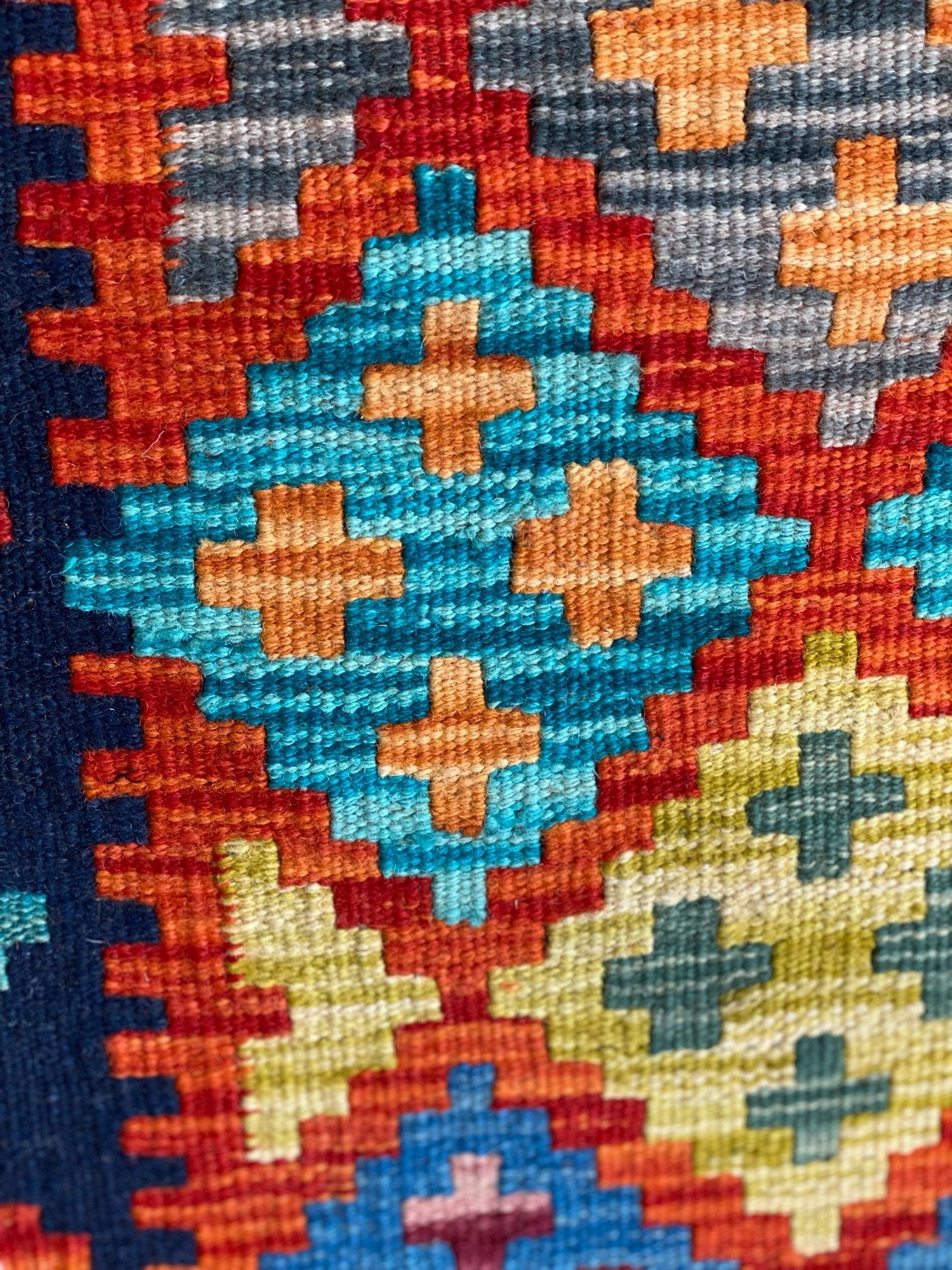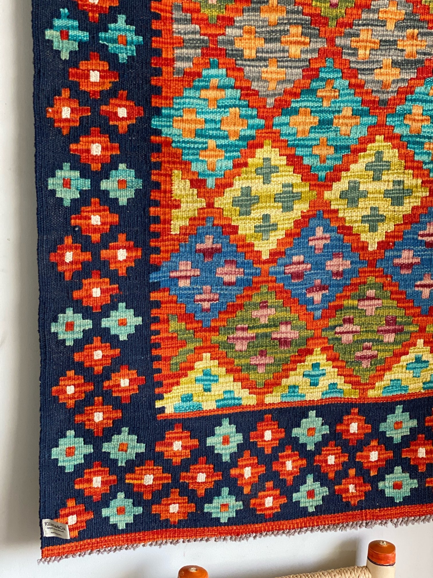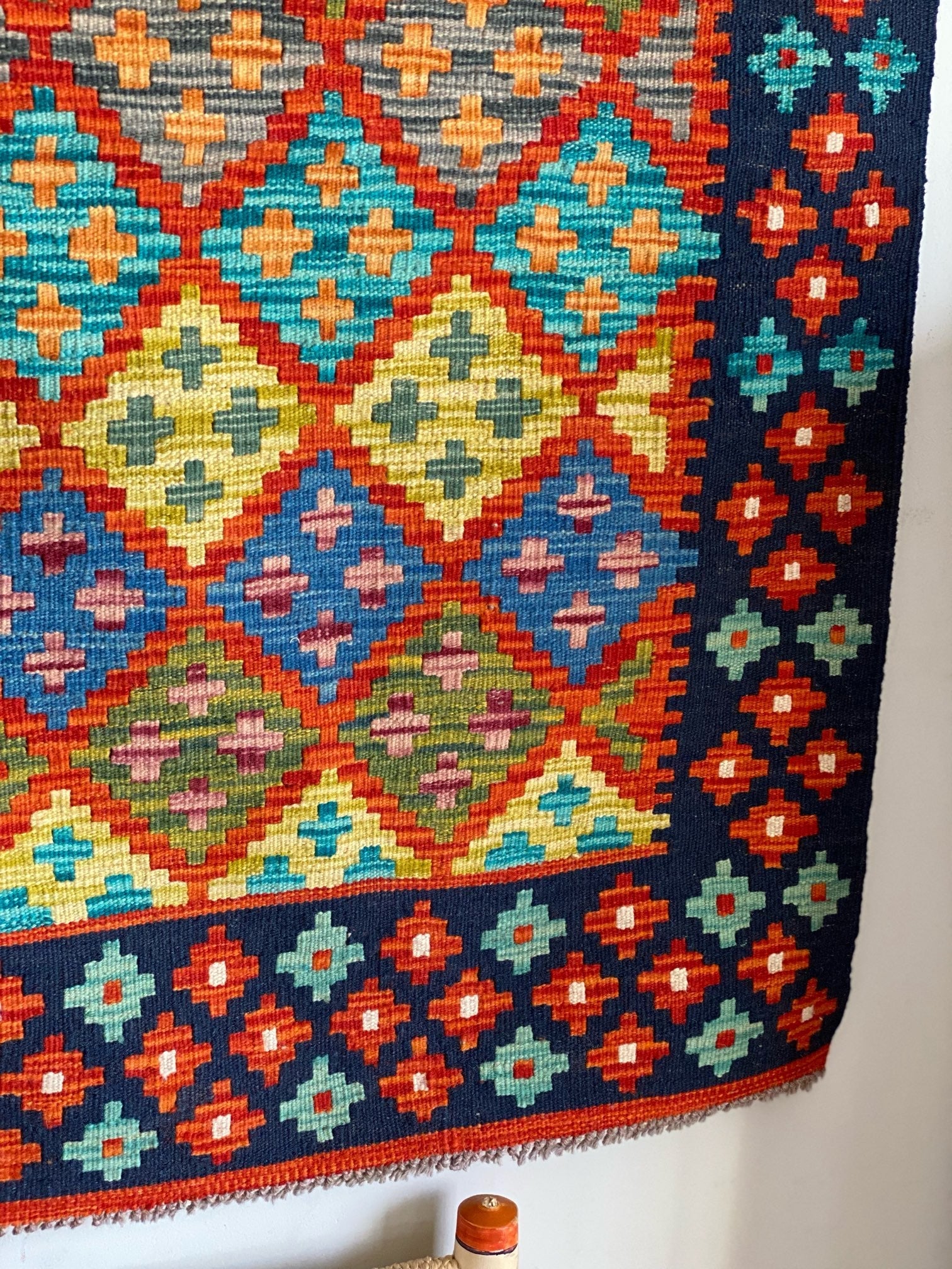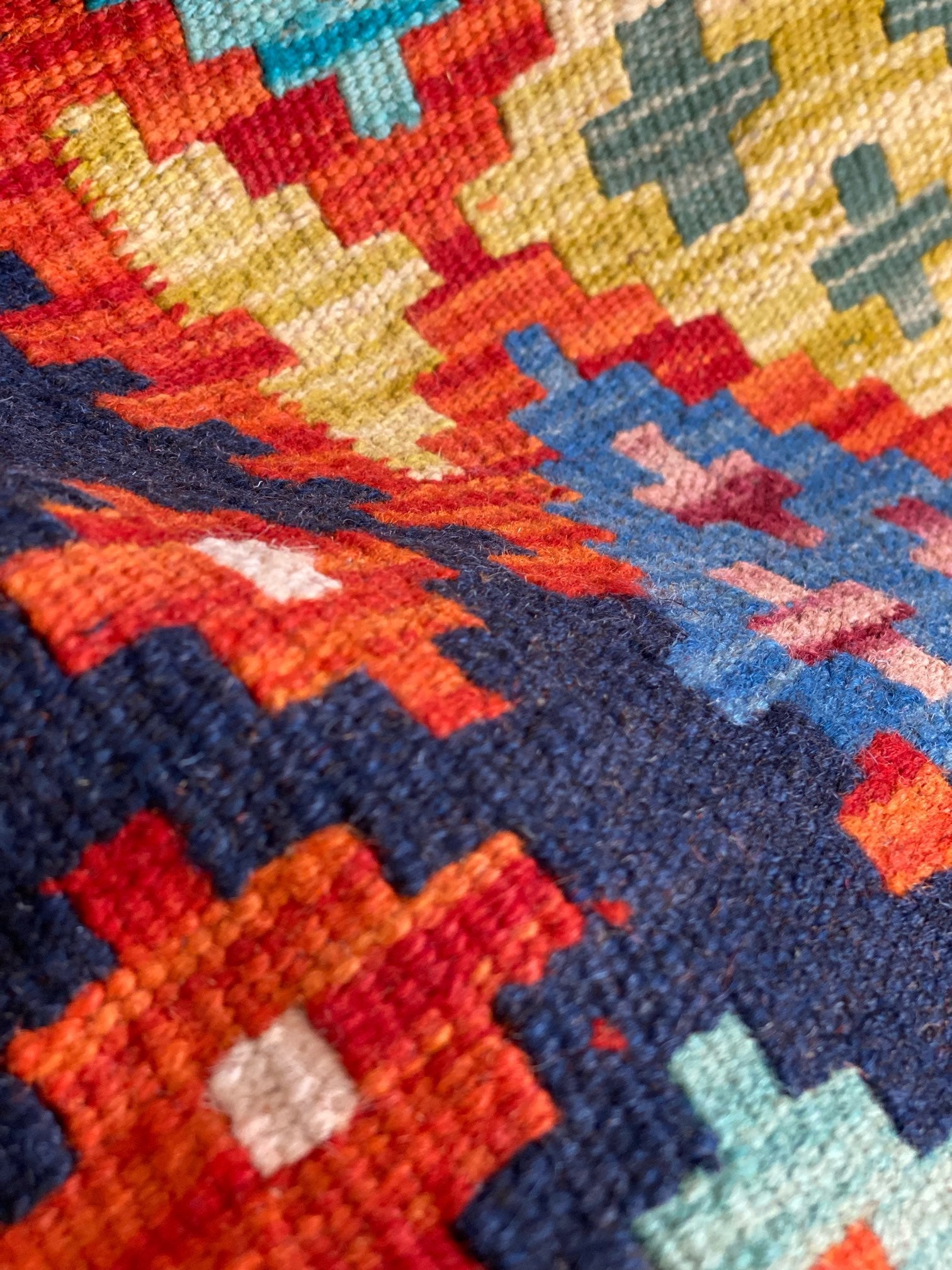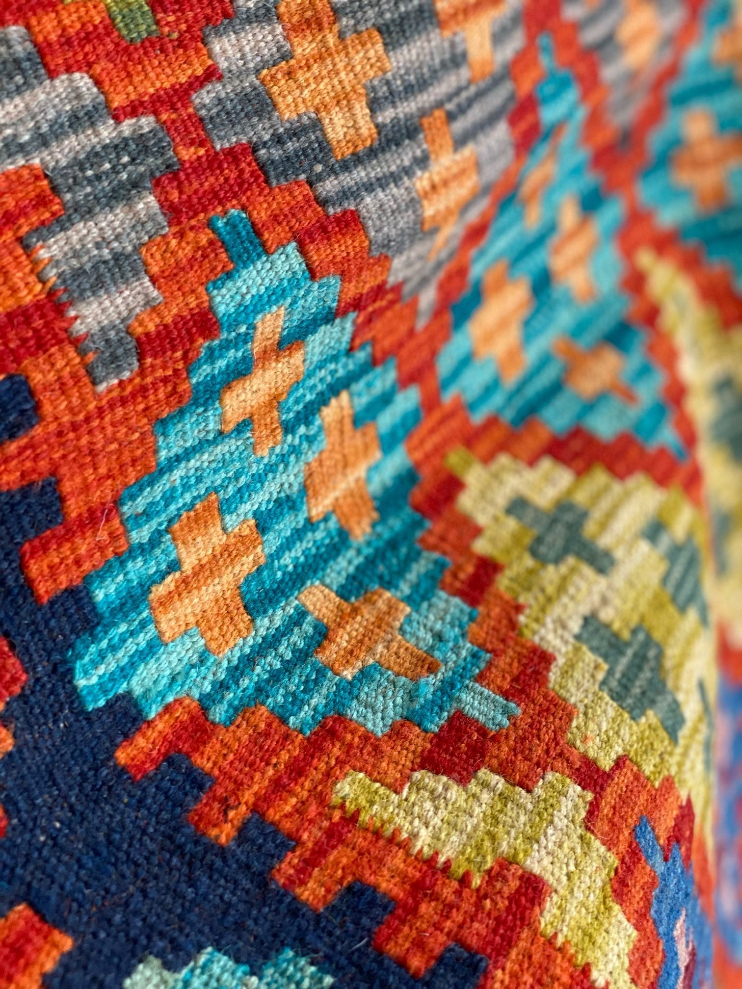 This Pure Sheep wool Afghan Kilim also represents a diverse range of cultures, and artistic sensibilities. Made with Persian Knots and Organic vegetable, flower and fruit dyes. These kilims will upgrade any space, bringing in a traditional yet trendy vibe to complement your decor.