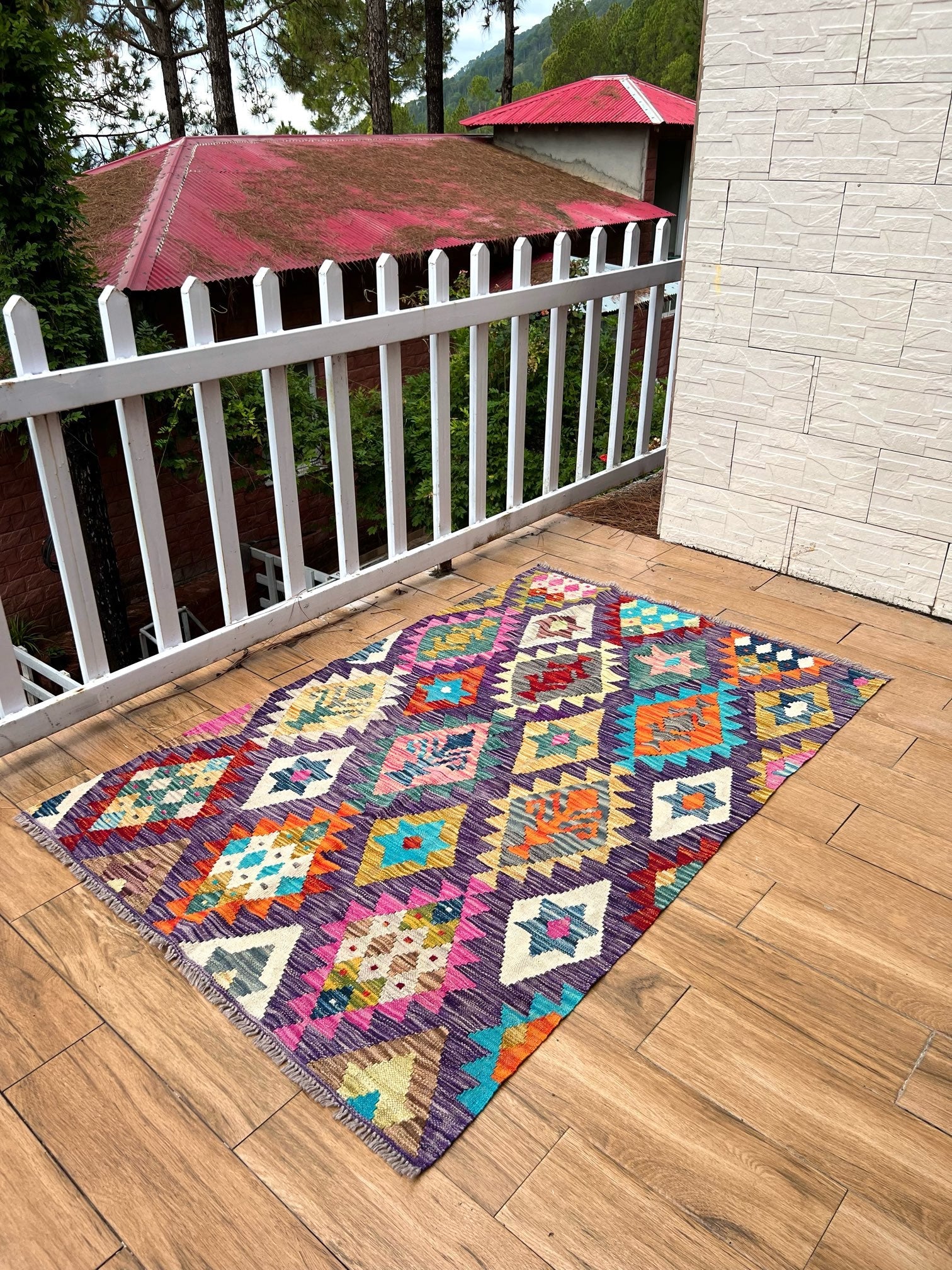 With its versatile design and contemporary color palette, "Majestic Peaks" complements a range of interior styles, making it a perfect addition to modern living rooms or traditional settings. Bring warmth, charm, and a piece of the Himalayan beauty into your Pakistani home with this statement kilim.