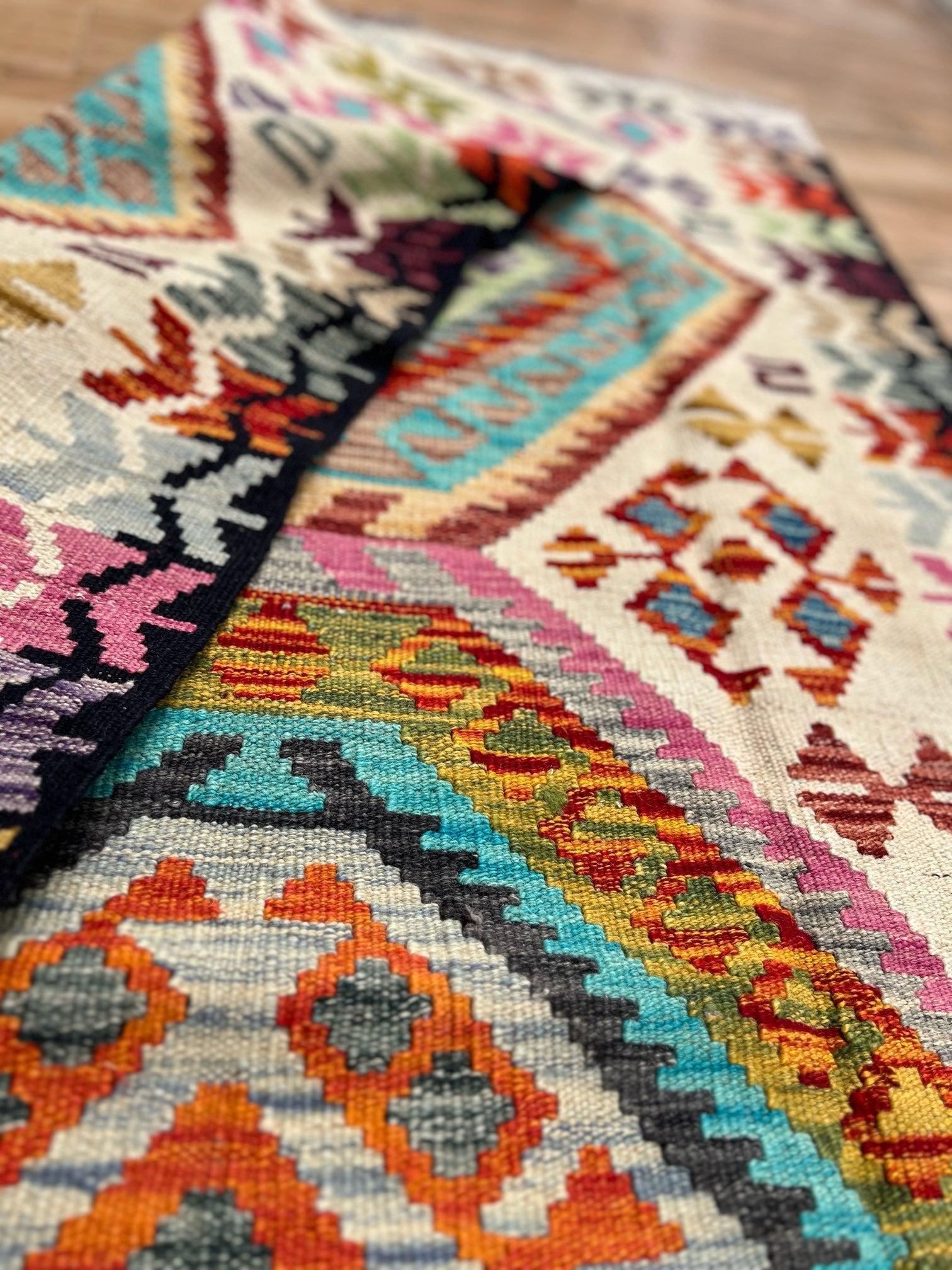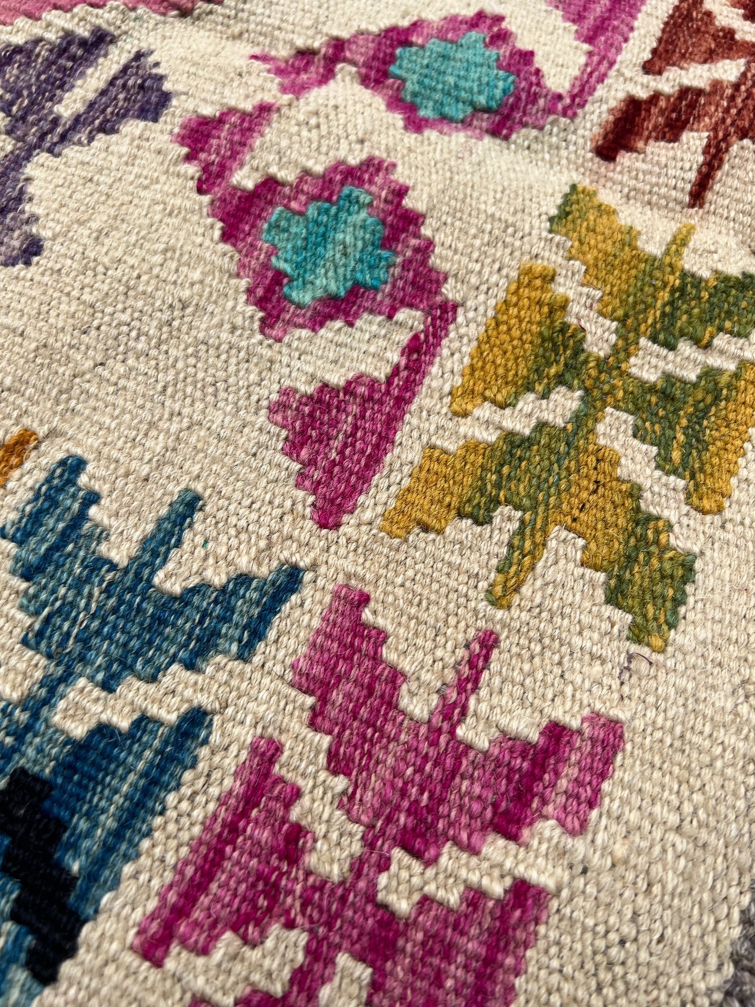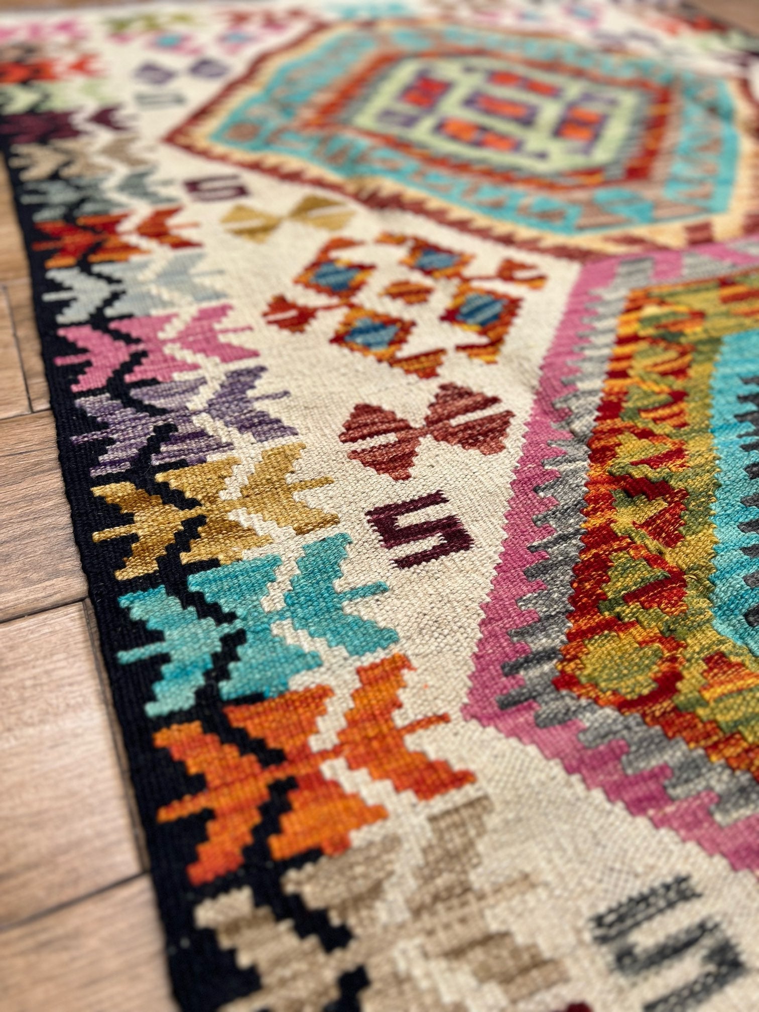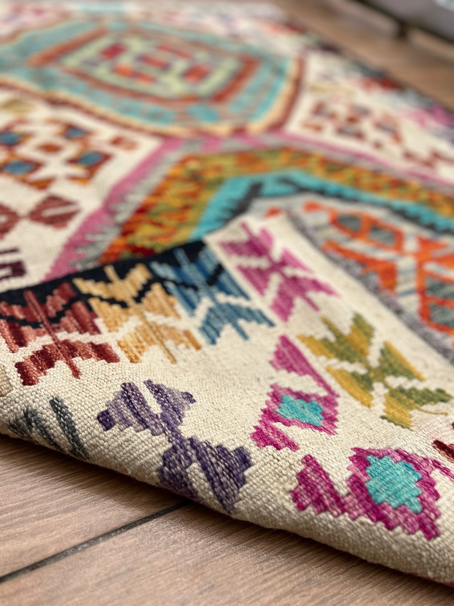 Island Oasis is a premium kilim that brings a touch of tropical charm with its bold and vibrant patterns against a creamy background. Featuring large, bold pink and other colored motifs, this kilim creates an inviting tapestry reminiscent of an island paradise.