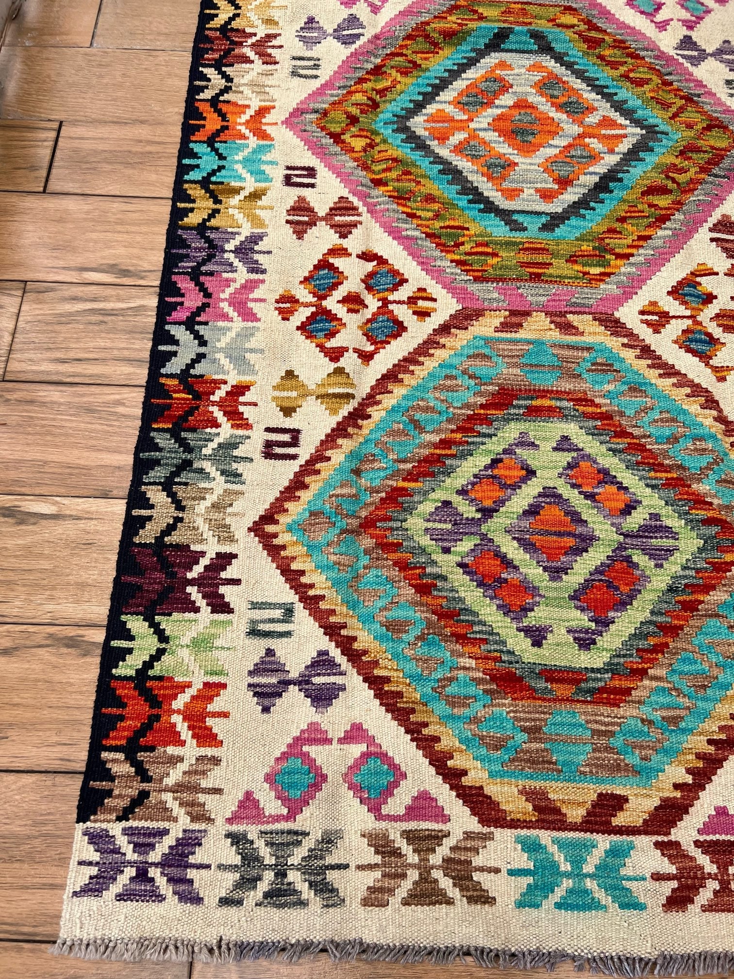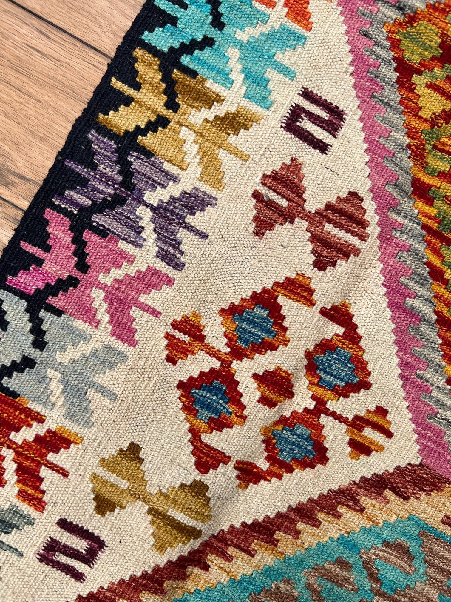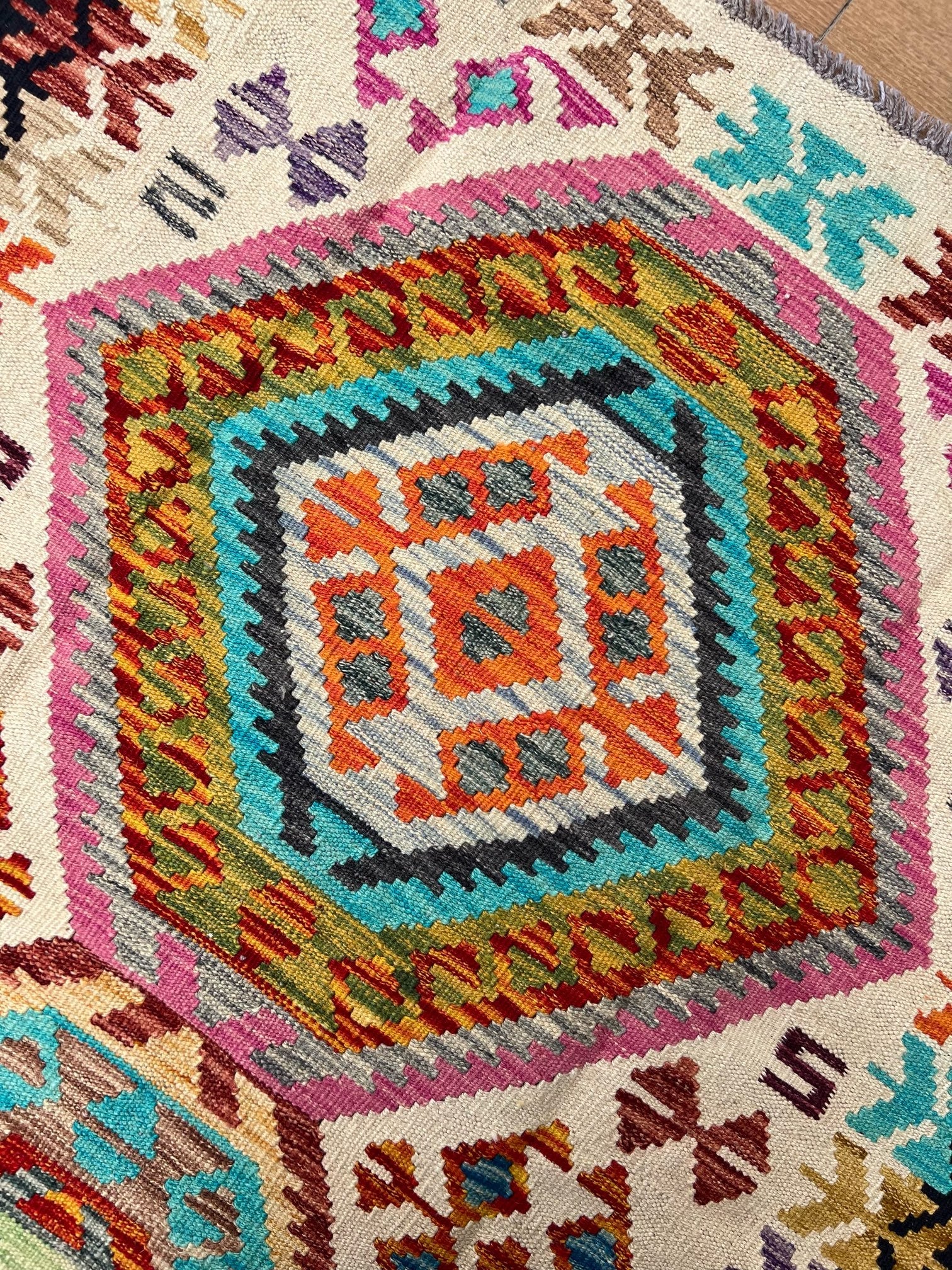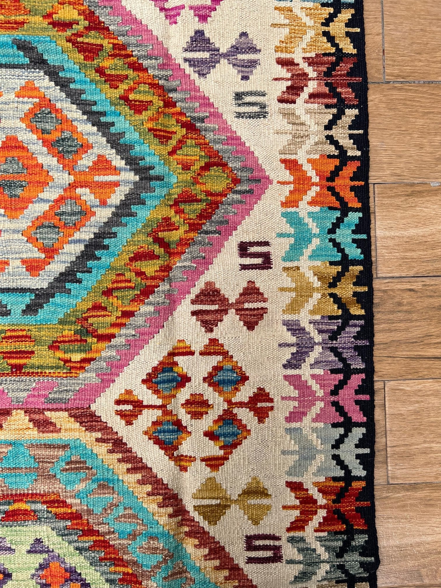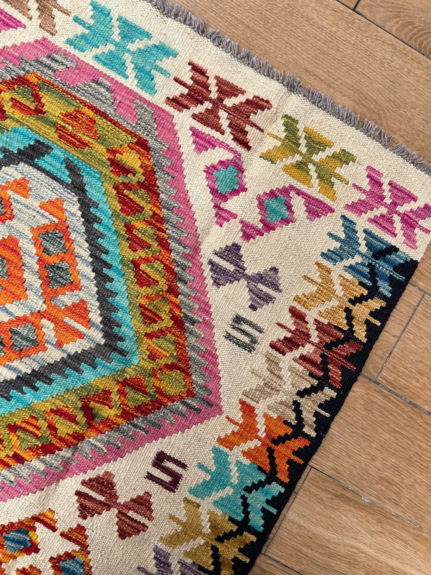 Island Oasis is a premium kilim that brings a touch of tropical charm with its bold and vibrant patterns against a creamy background. Featuring large, bold pink and other colored motifs, this kilim creates an inviting tapestry reminiscent of an island paradise.