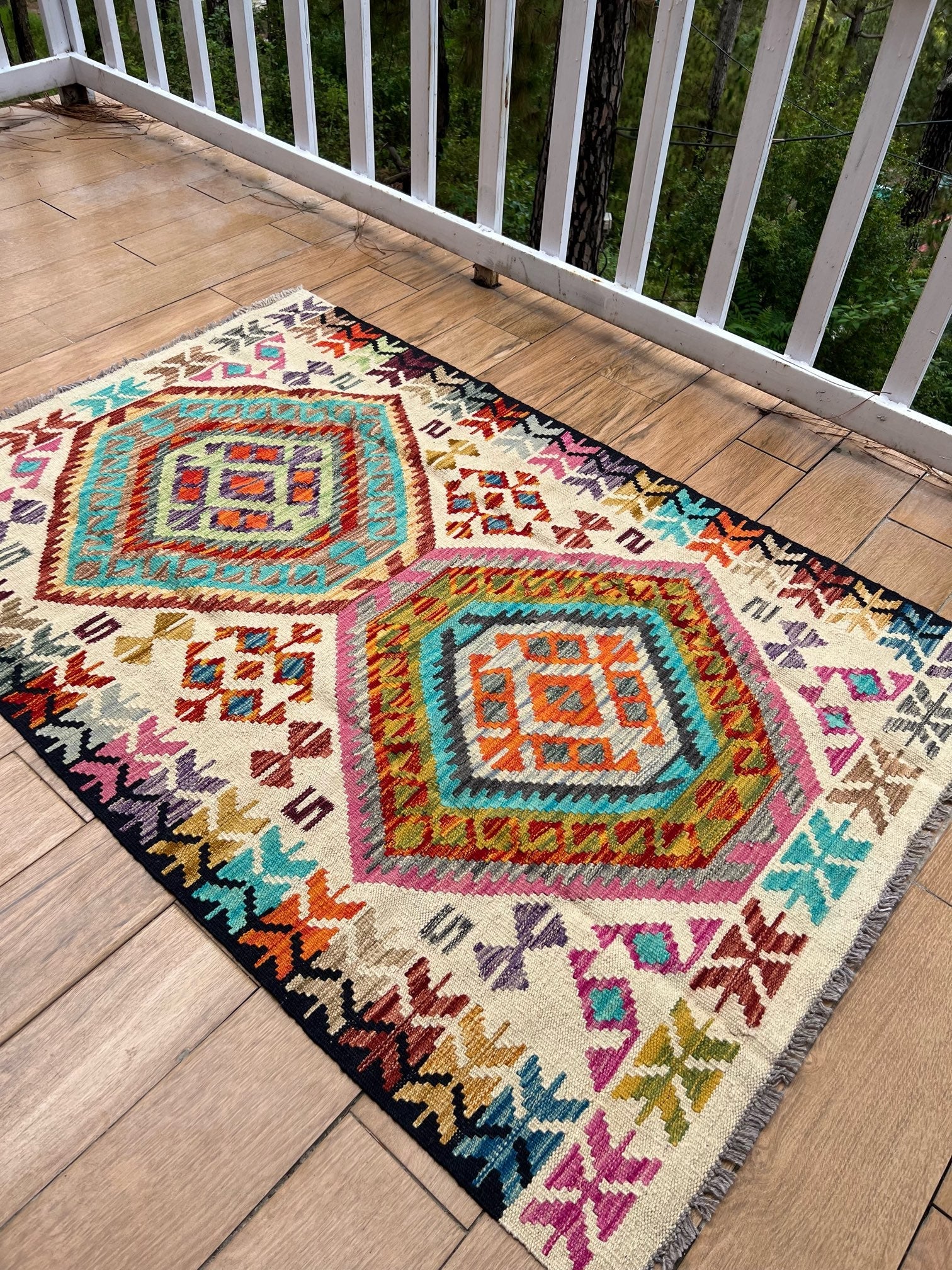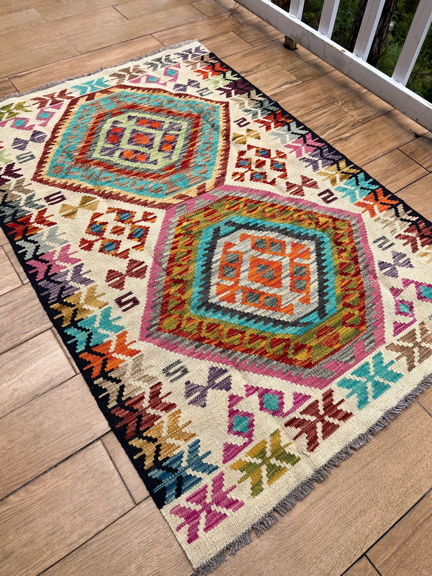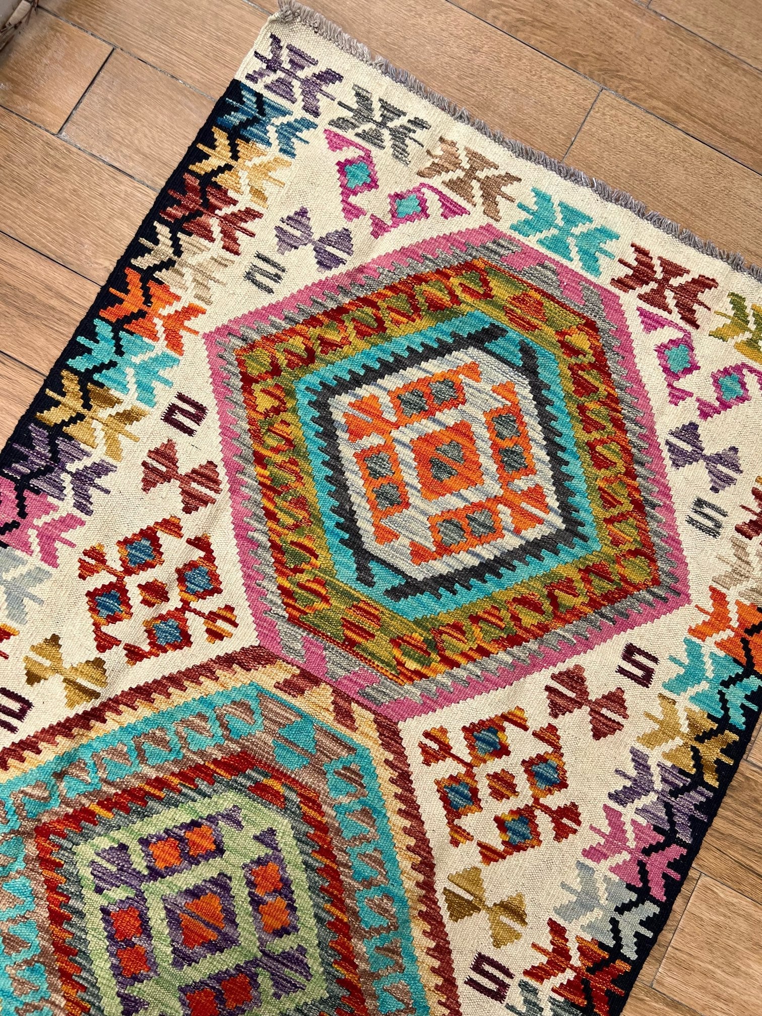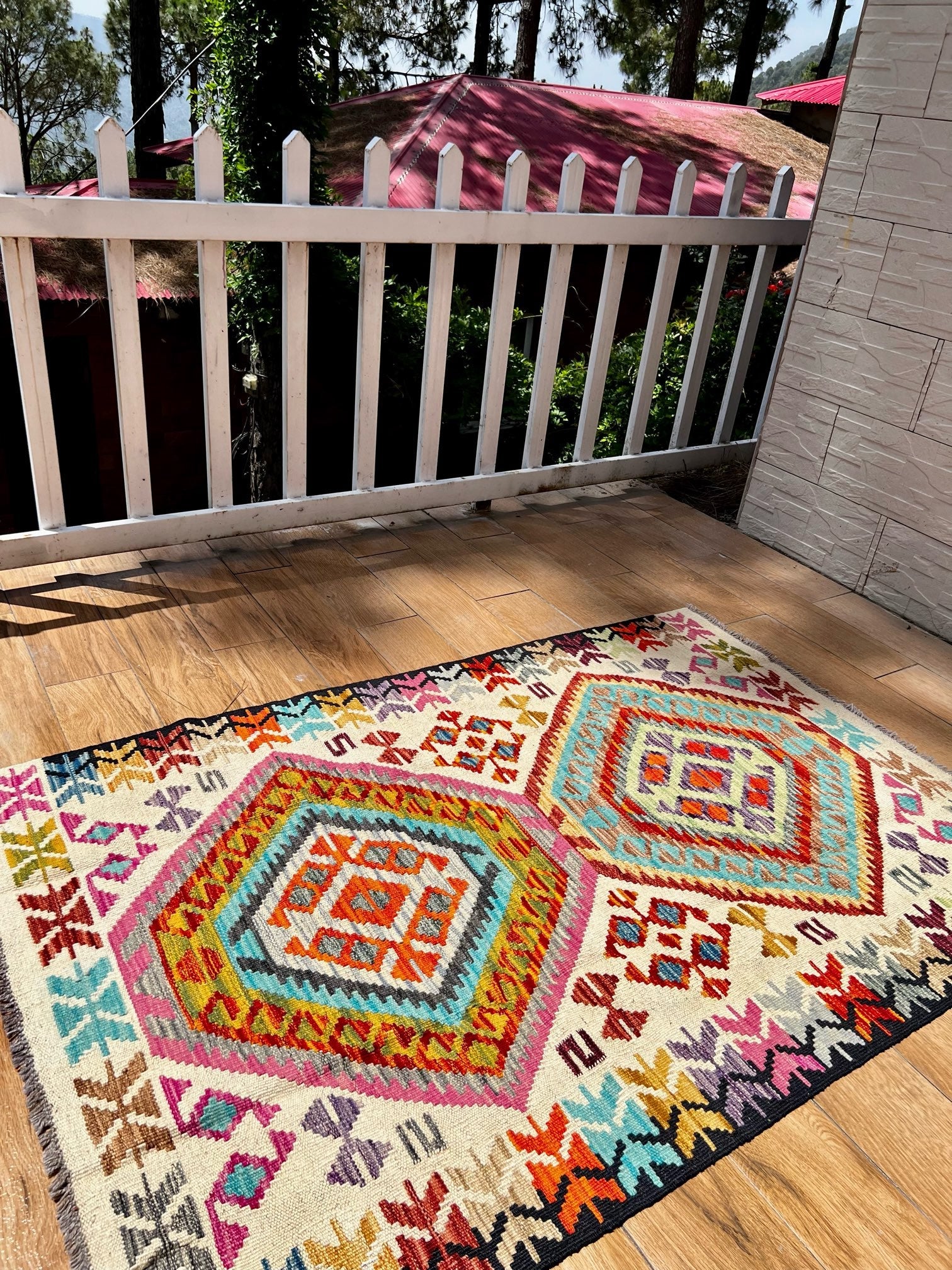 Island Oasis is a premium kilim that brings a touch of tropical charm with its bold and vibrant patterns against a creamy background. Featuring large, bold pink and other colored motifs, this kilim creates an inviting tapestry reminiscent of an island paradise.
