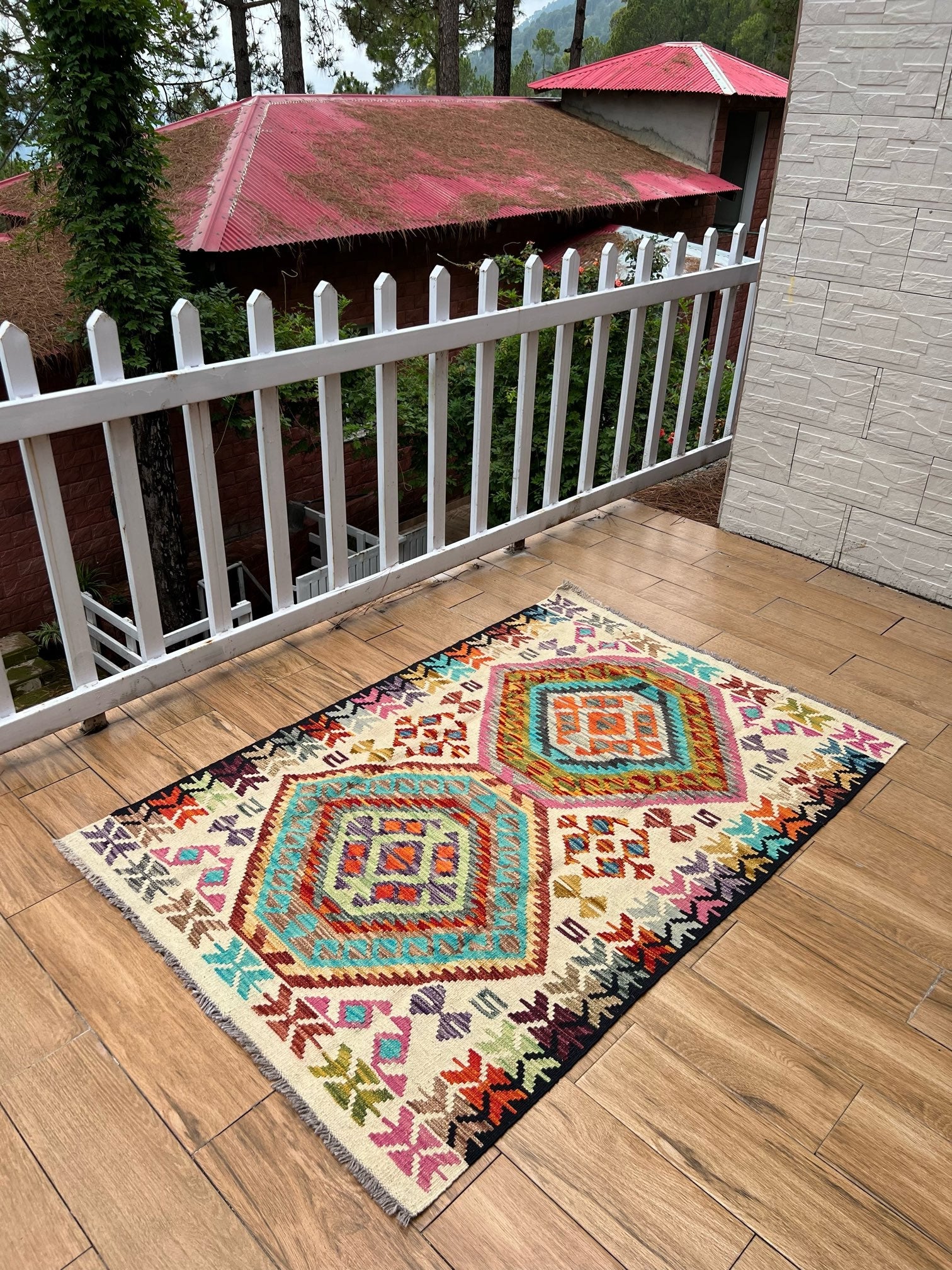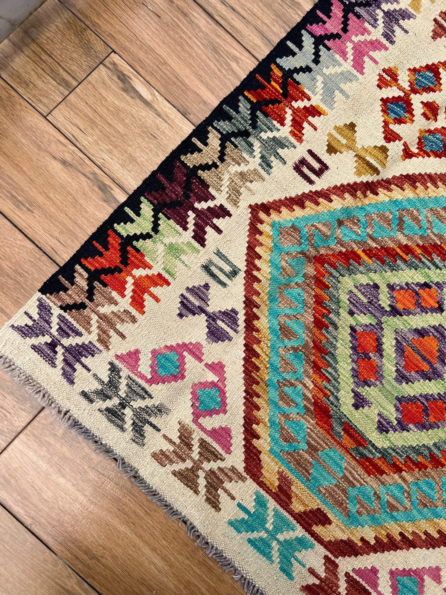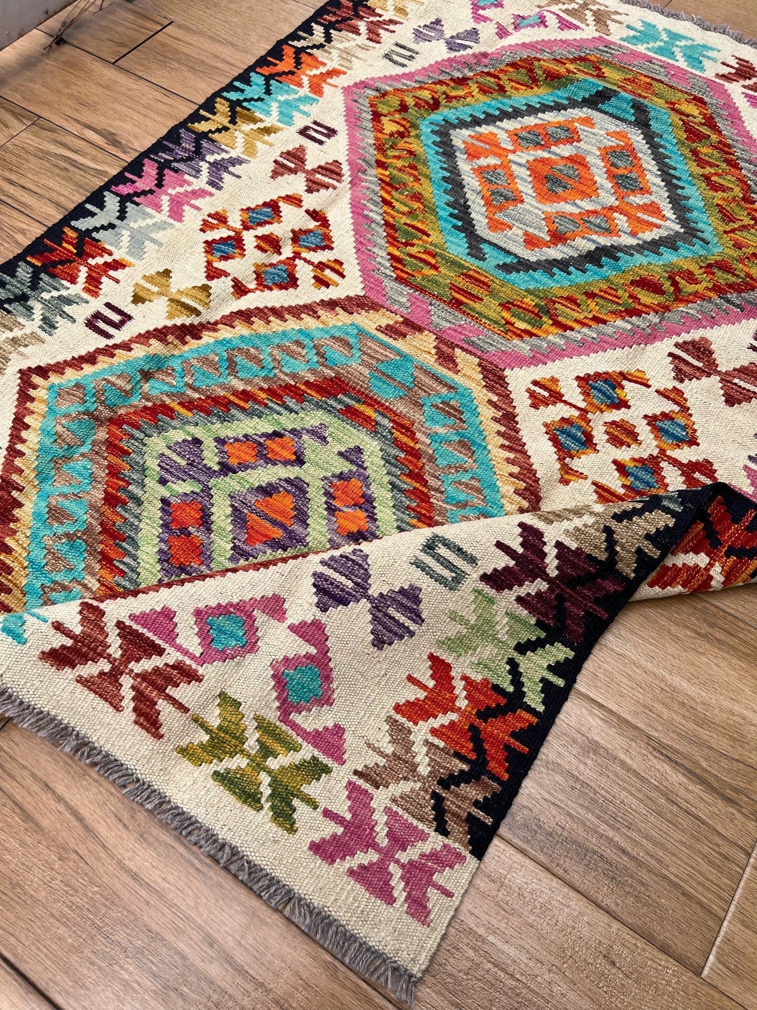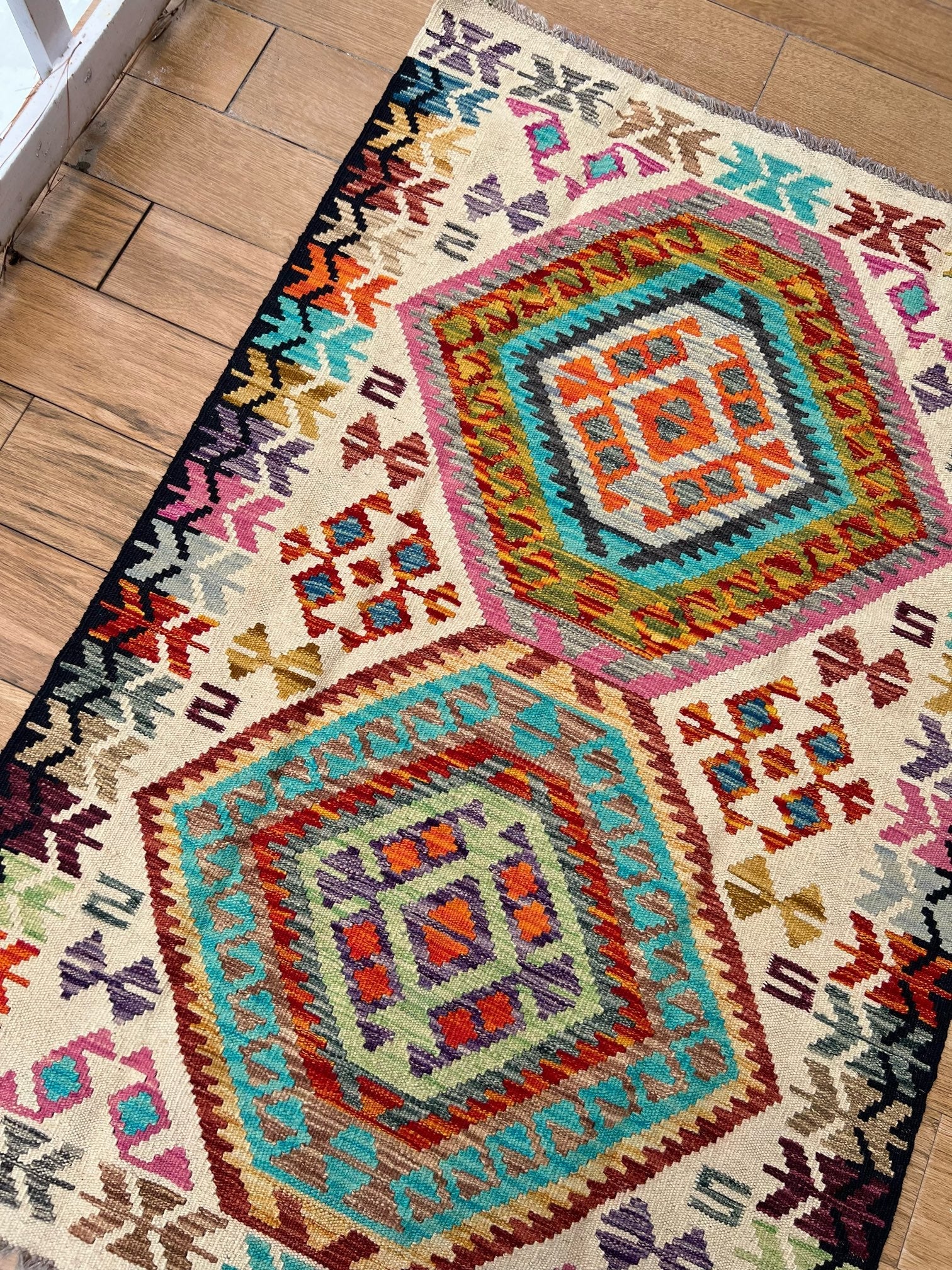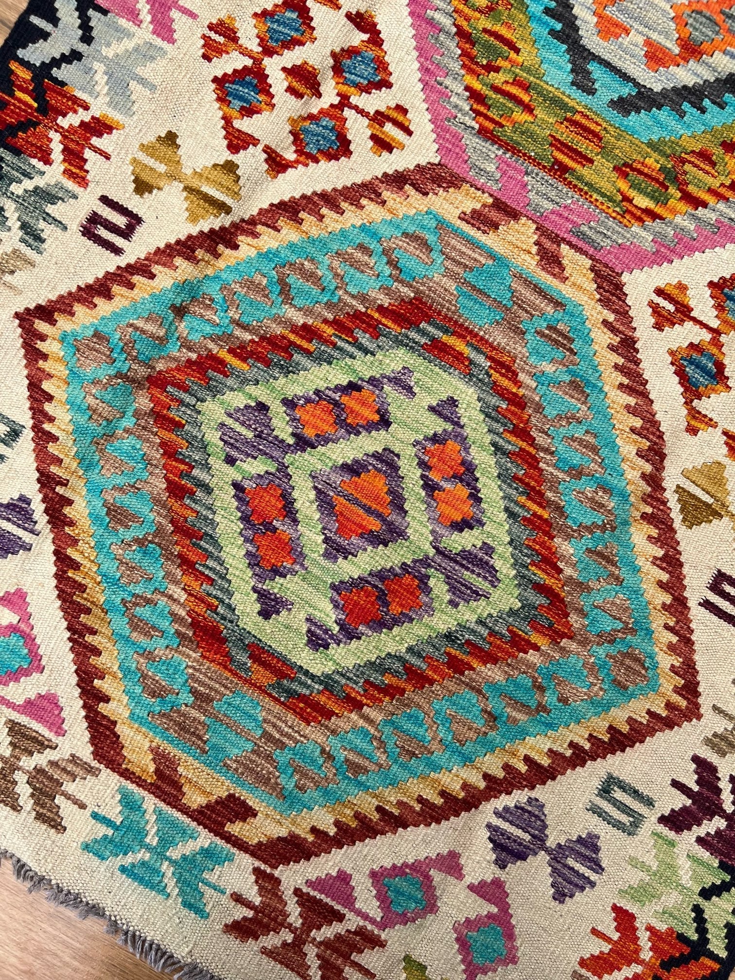 Island Oasis is a premium kilim that brings a touch of tropical charm with its bold and vibrant patterns against a creamy background. Featuring large, bold pink and other colored motifs, this kilim creates an inviting tapestry reminiscent of an island paradise.