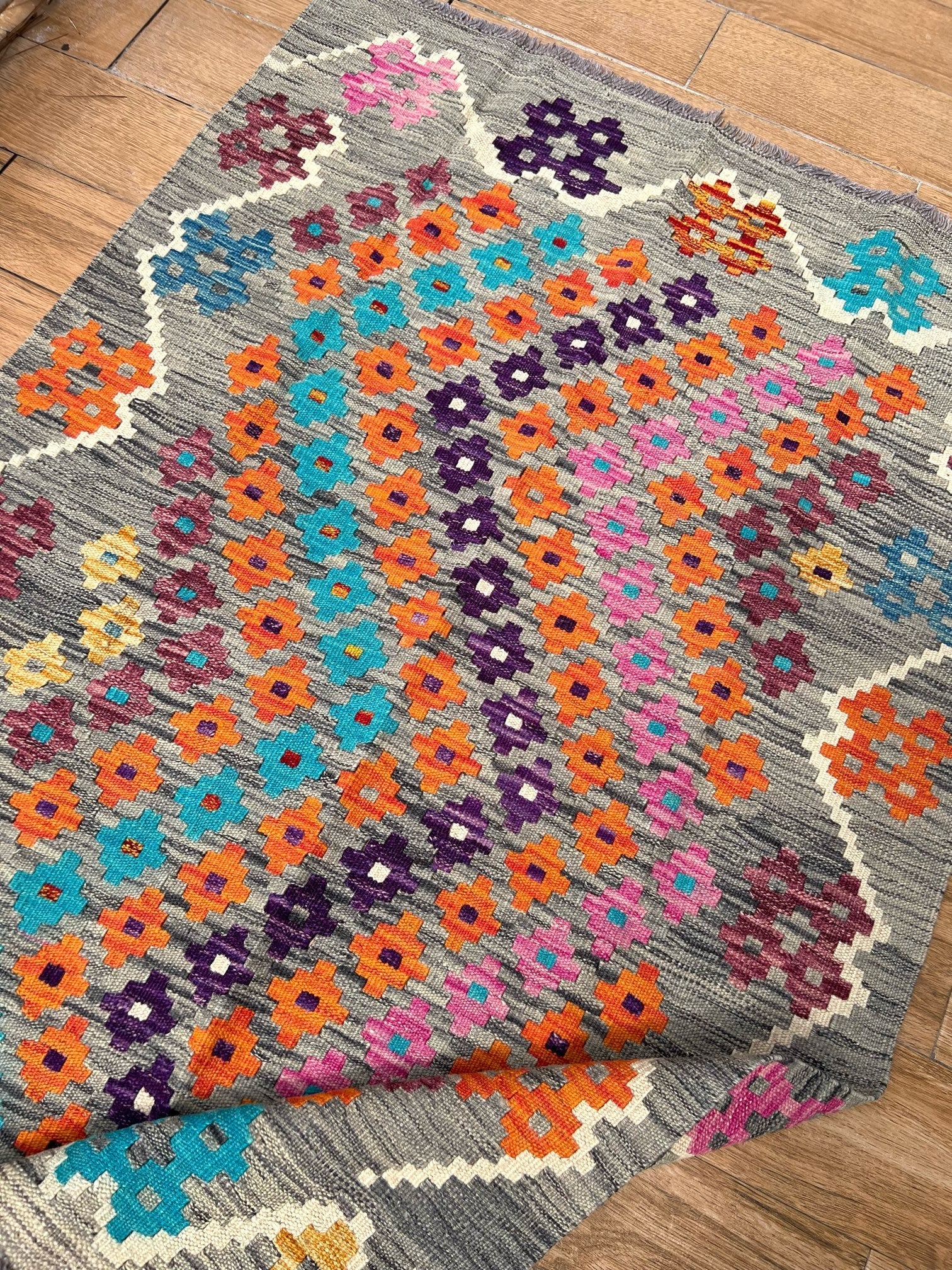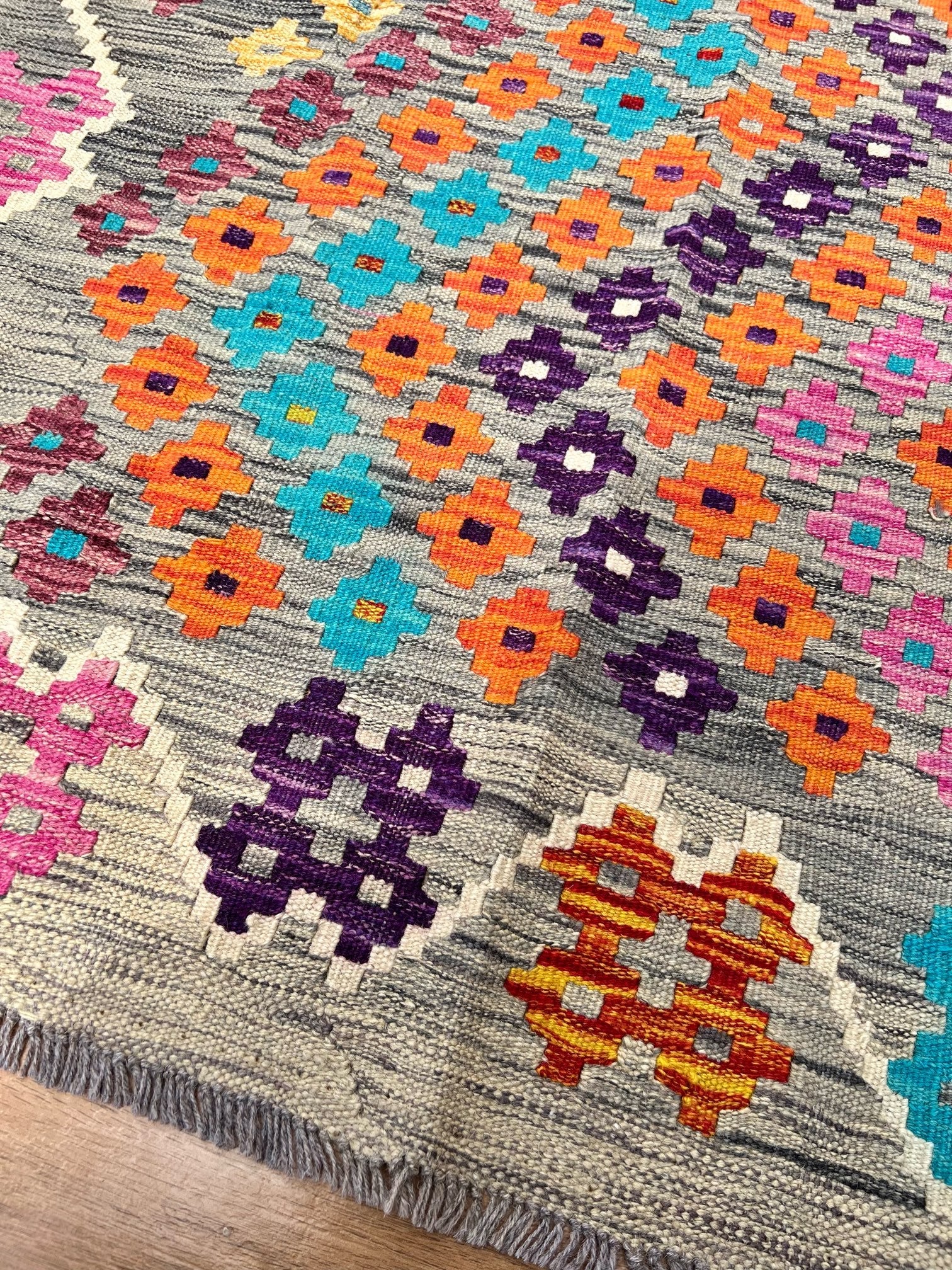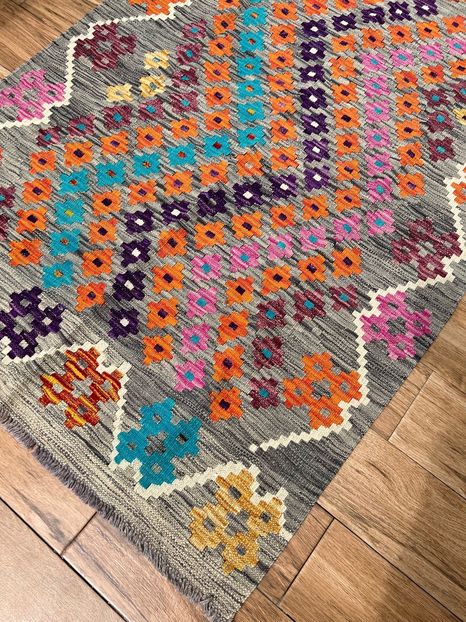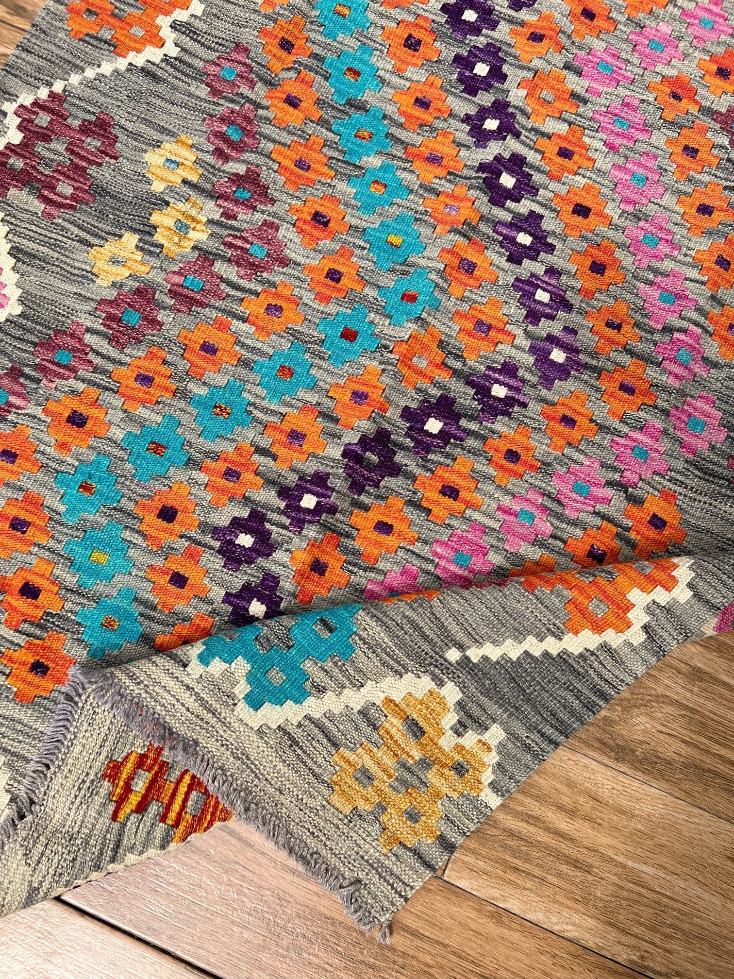 Experience the allure of "Majestic Mirage," a premium kilim meticulously handcrafted to perfection. This exquisite masterpiece showcases exceptional quality and masterful artistry. The kilim features a captivating grey static-like print with small diamond patterns in vibrant blue, orange, pink, and purple hues. Its design is framed with a thin white border, adding an elegant touch to its remarkable craftsmanship.