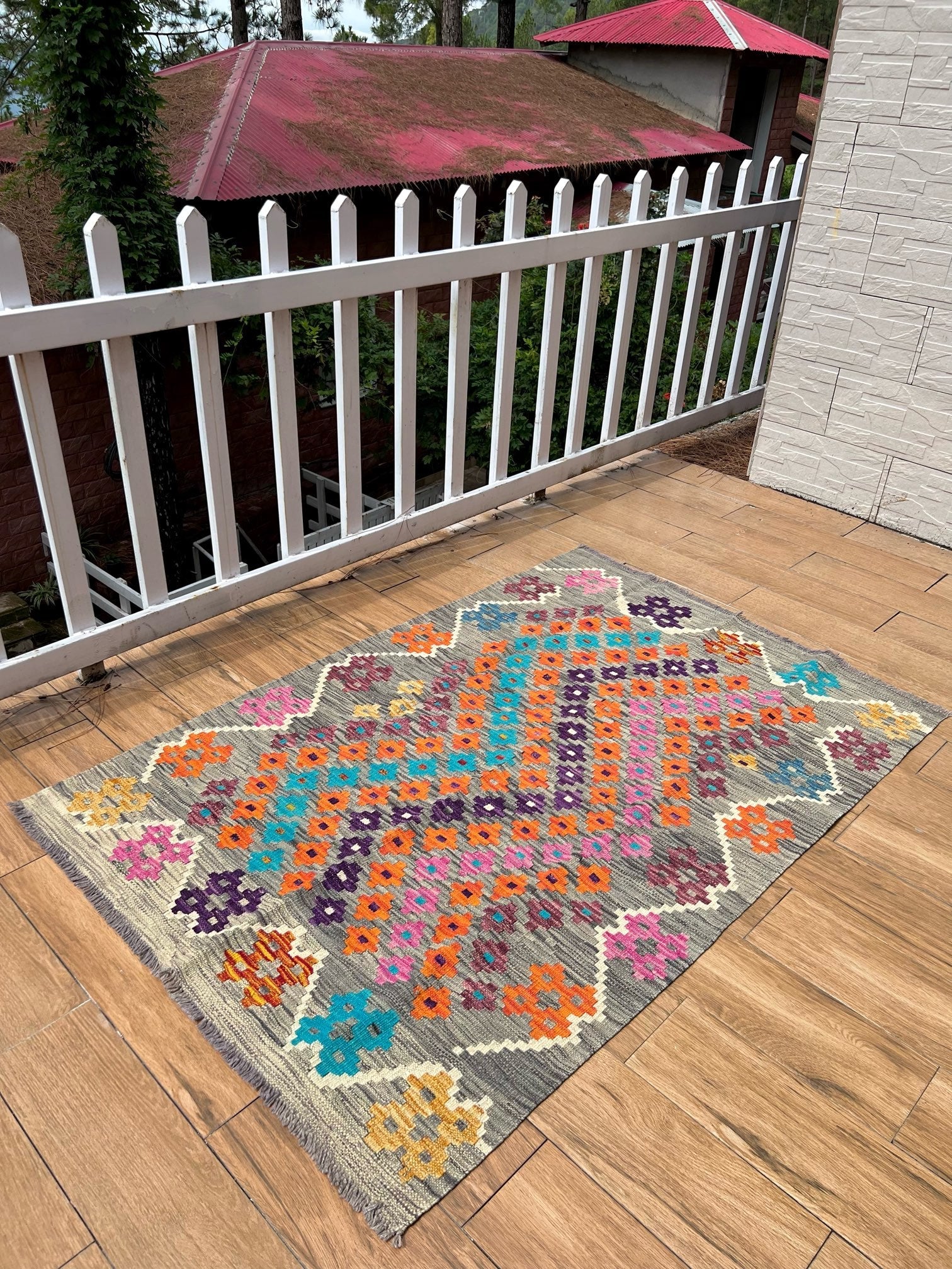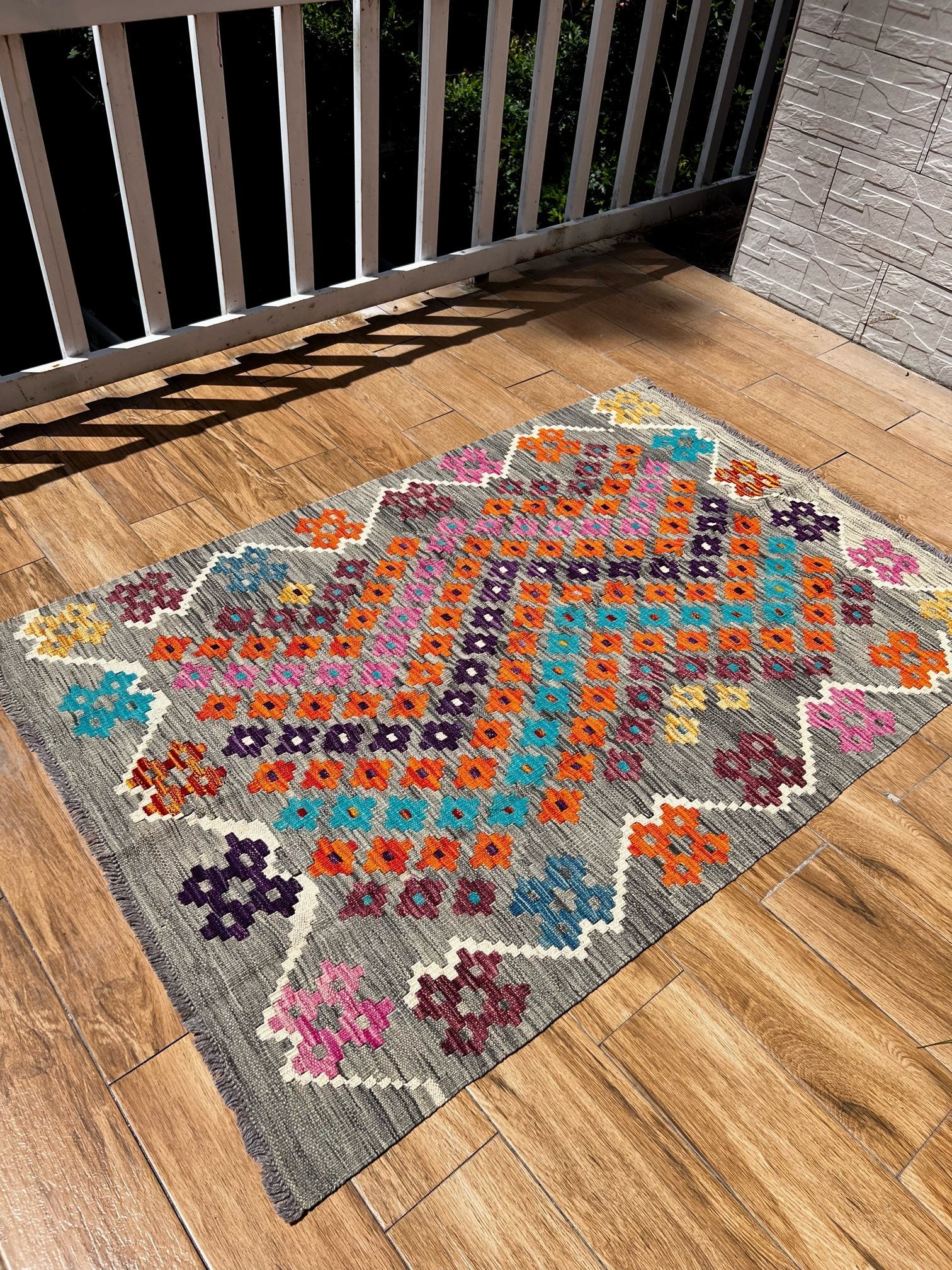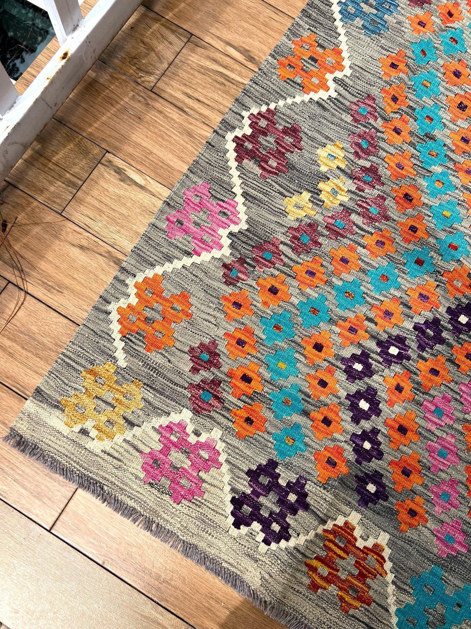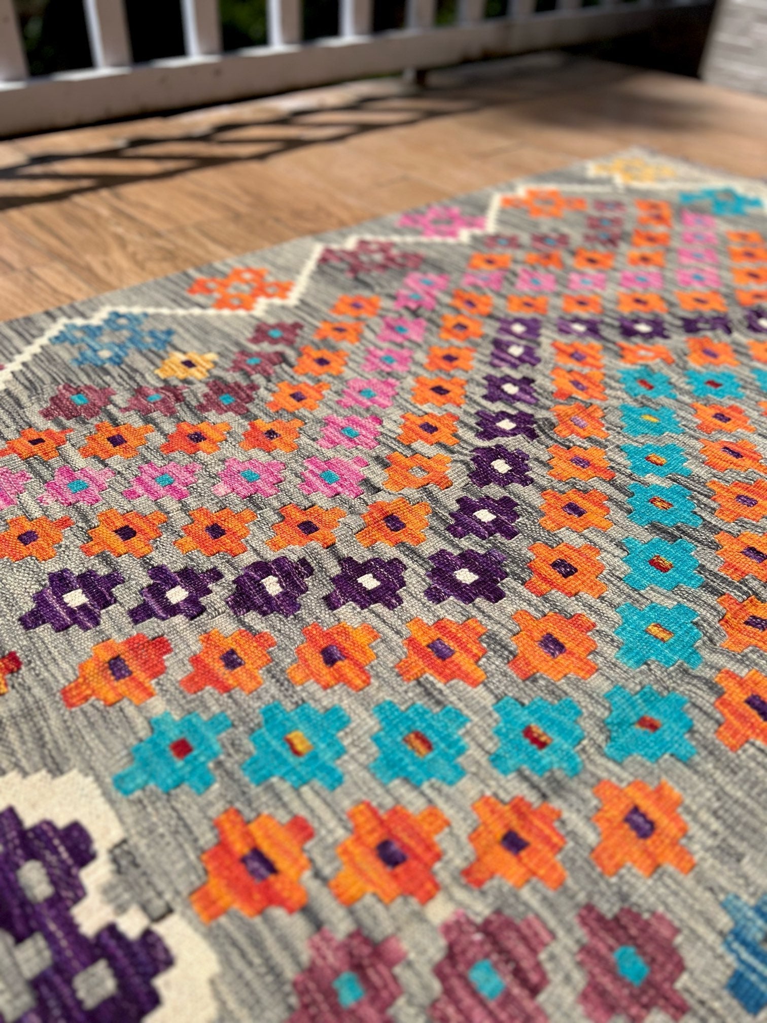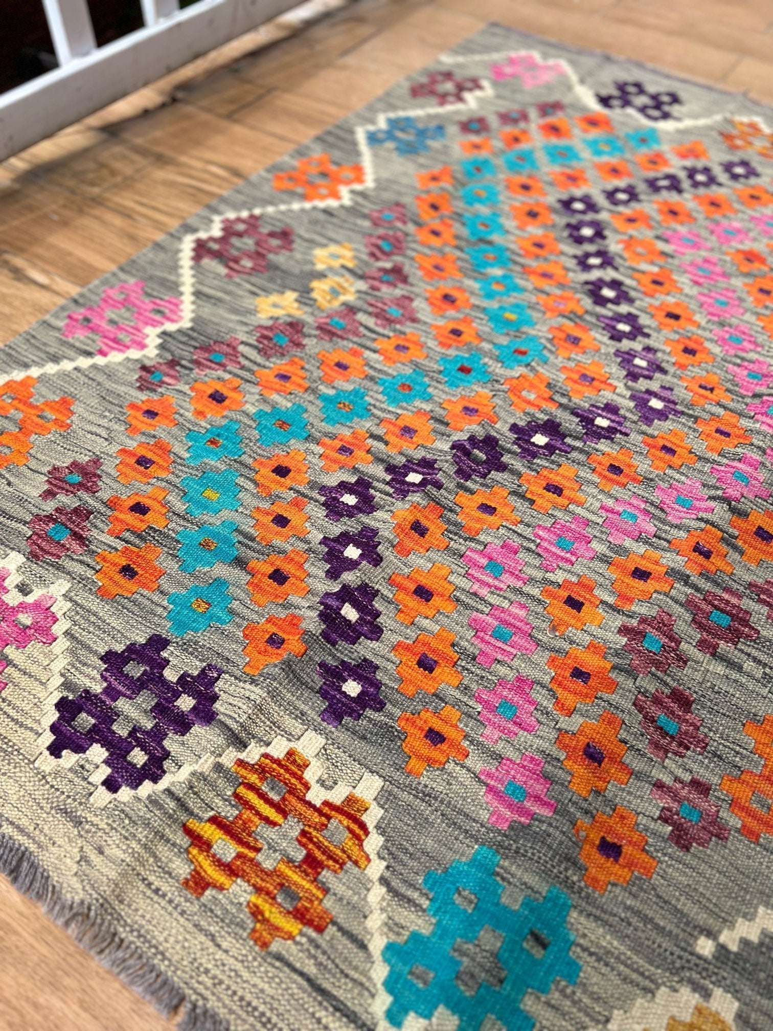 Experience the allure of "Majestic Mirage," a premium kilim meticulously handcrafted to perfection. This exquisite masterpiece showcases exceptional quality and masterful artistry. The kilim features a captivating grey static-like print with small diamond patterns in vibrant blue, orange, pink, and purple hues. Its design is framed with a thin white border, adding an elegant touch to its remarkable craftsmanship.