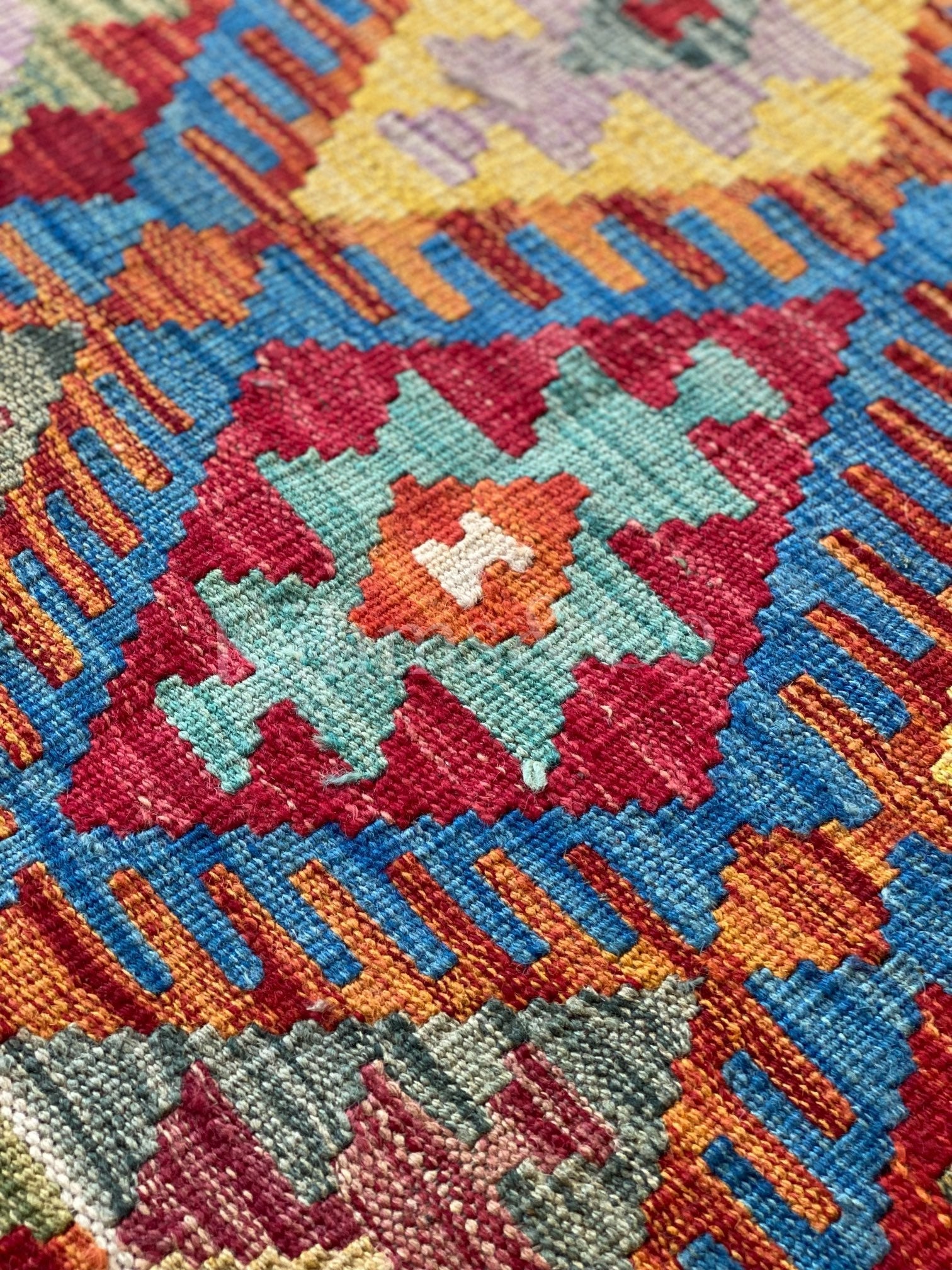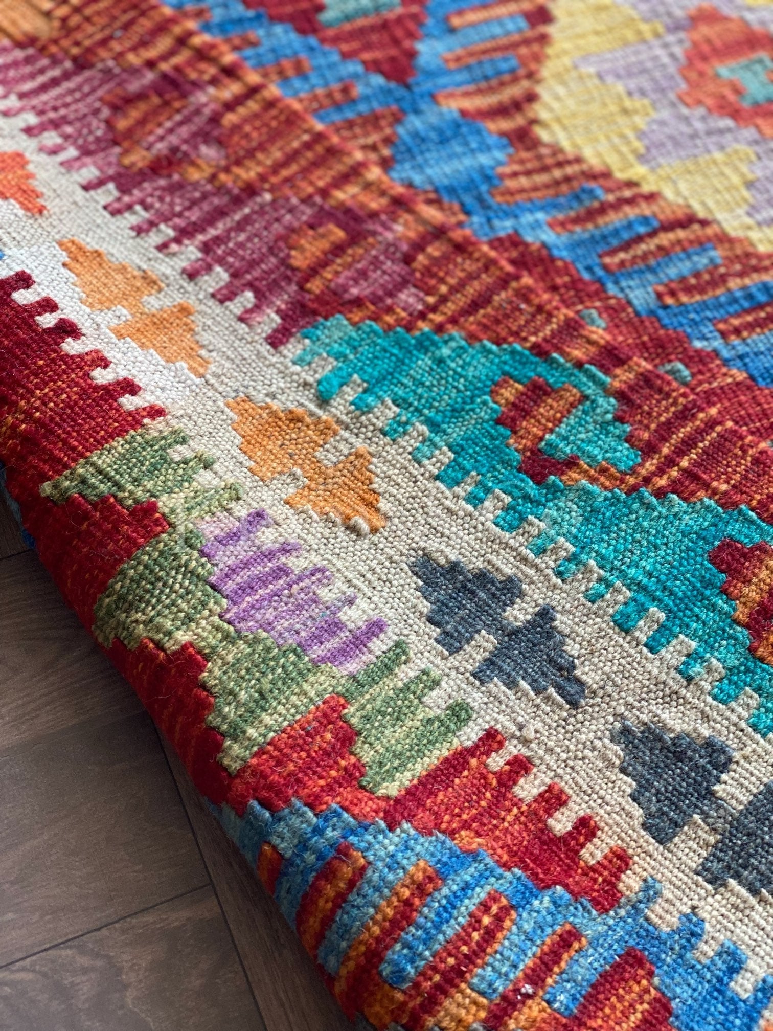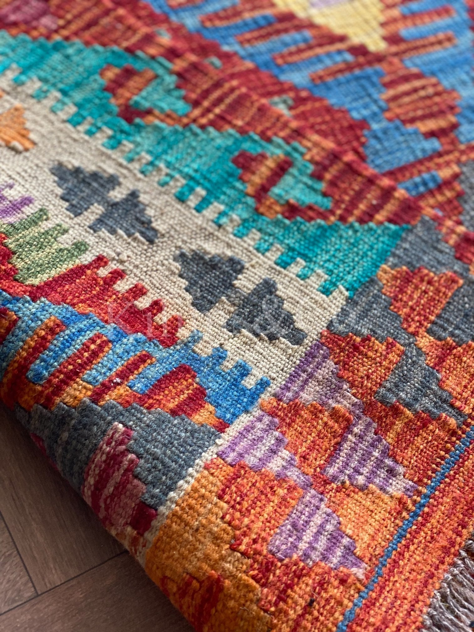 The perfect addition to any room in your home, this multicoloured handmade woollen kilim is a must-have. Made from 100% pure wool, this beautiful piece will add a touch of elegance and warmth to any room.