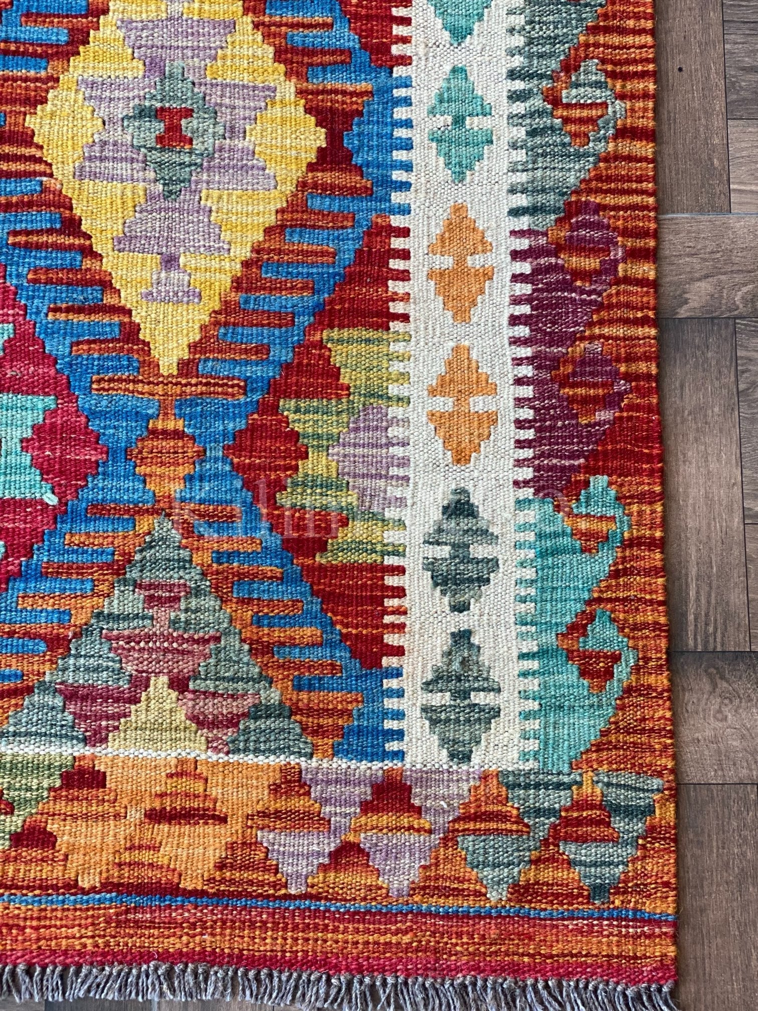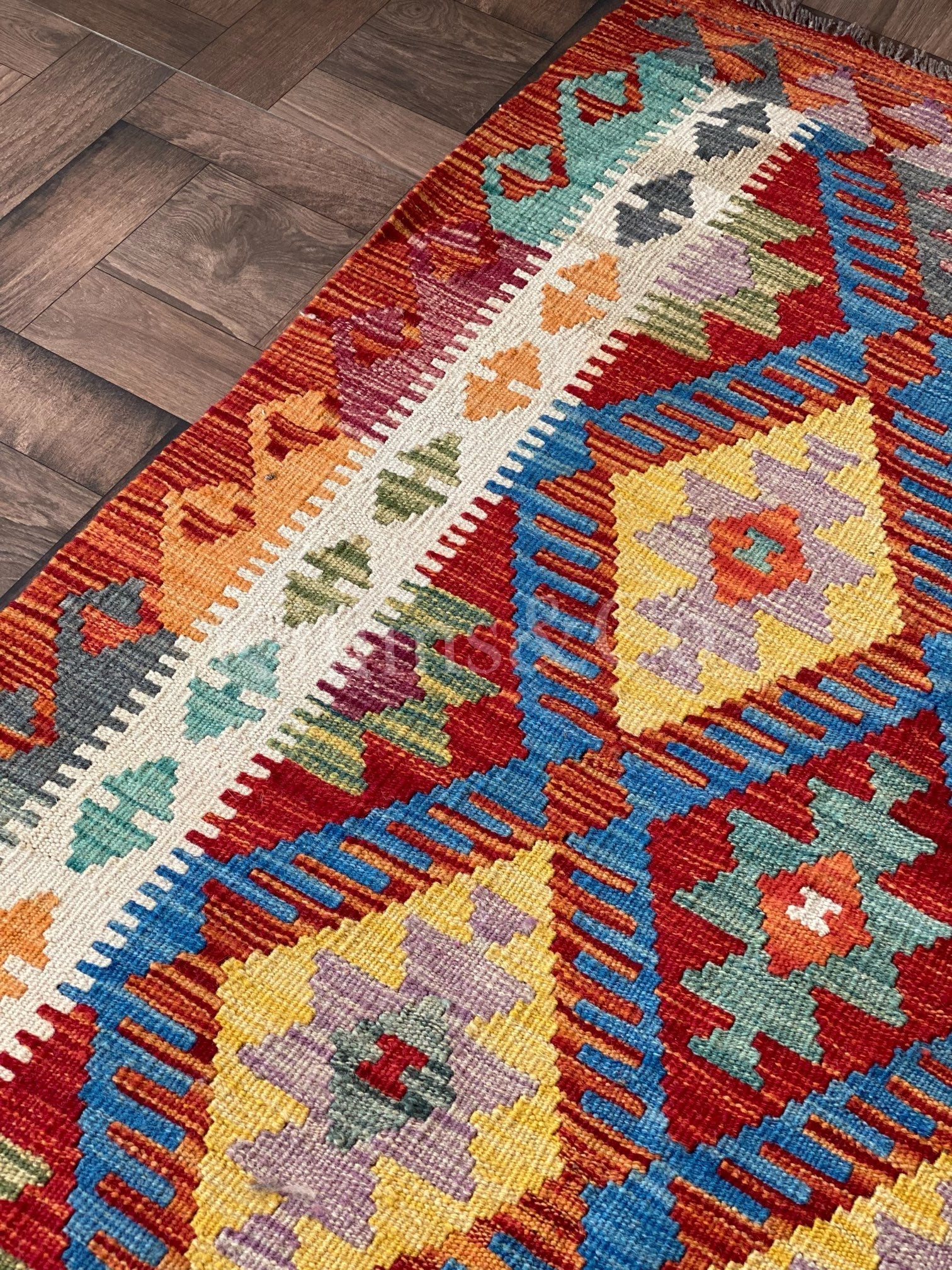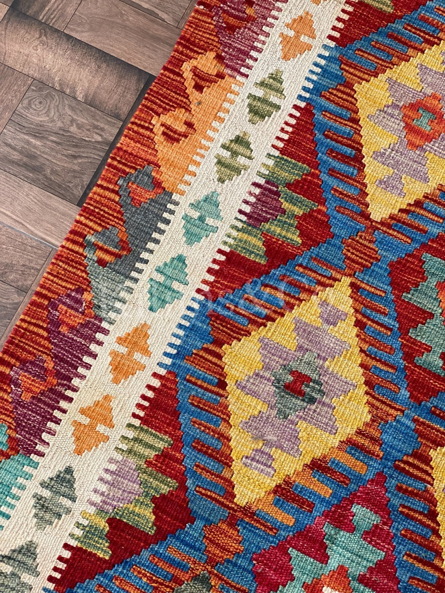 The perfect addition to any room in your home, this multicoloured handmade woollen kilim is a must-have. Made from 100% pure wool, this beautiful piece will add a touch of elegance and warmth to any room.
