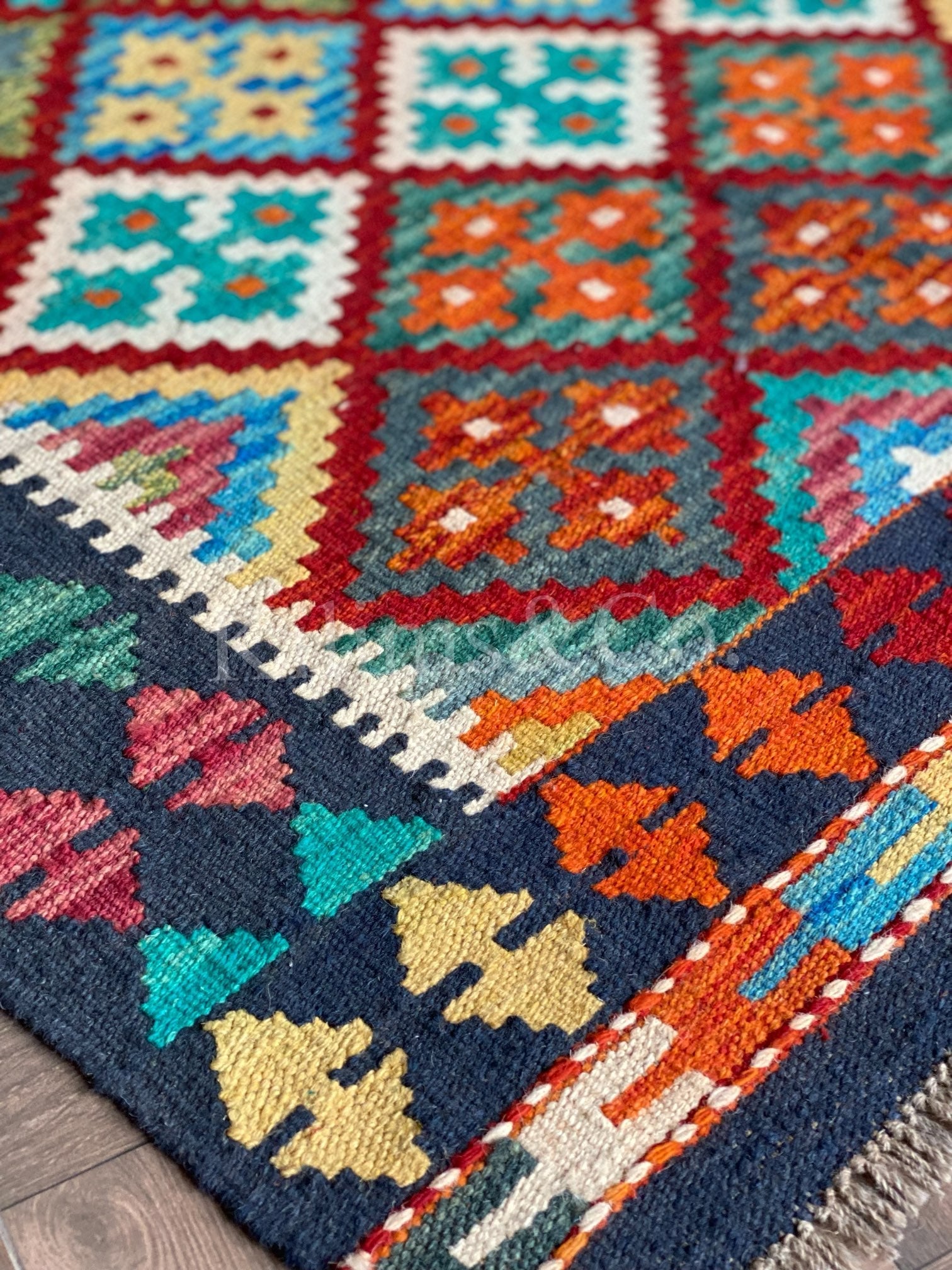 The perfect addition to any room in your home, this multicoloured handmade woollen kilim is a must-have. Made from 100% pure wool, this beautiful piece will add a touch of elegance and warmth to any room.