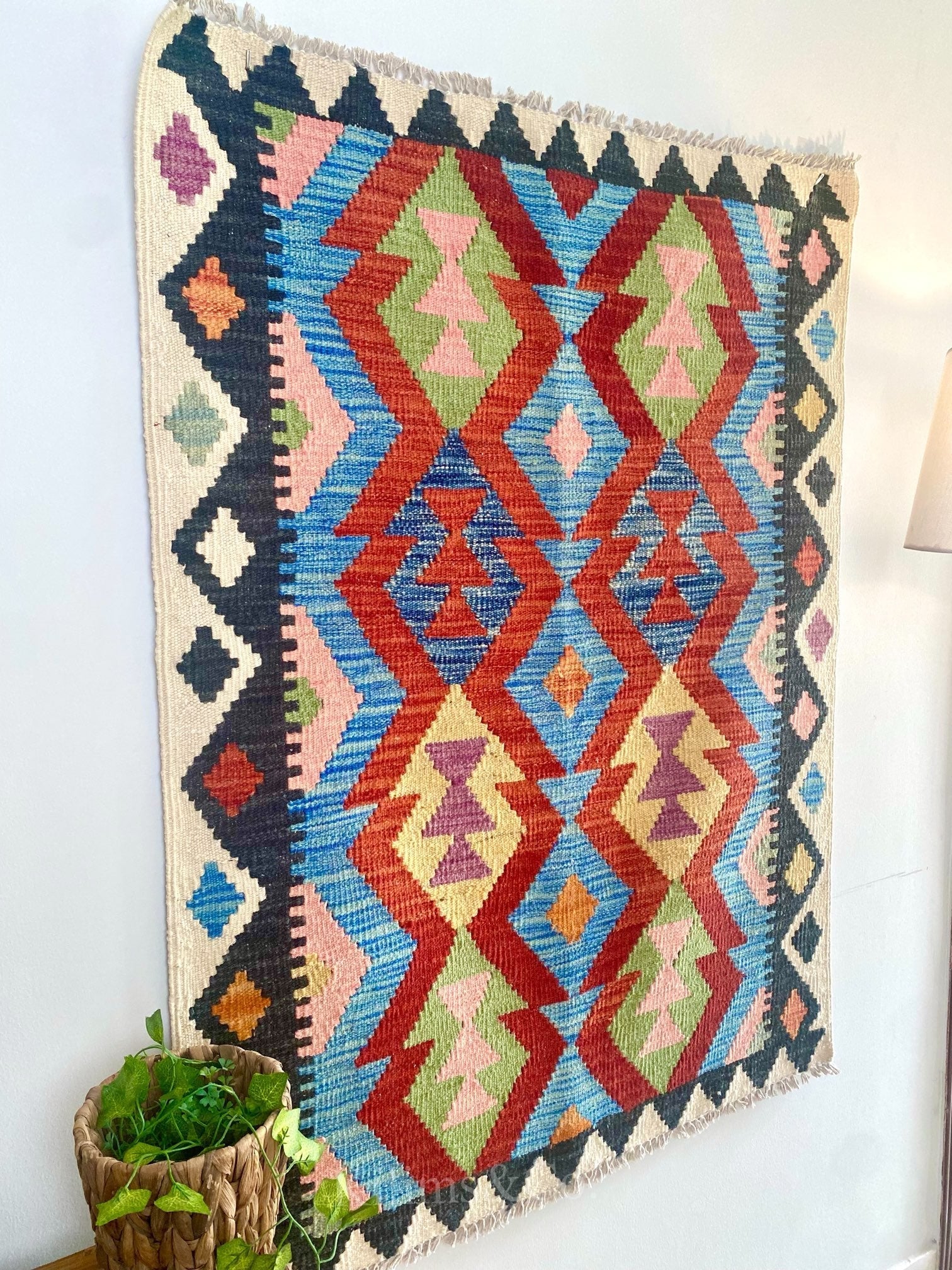 The Premium Afghan Kilim, a masterpiece in our collection, transforms your walls into a canvas of vivid colors and intricate patterns. Crafted with Persian Knots and using organic vegetable, flower, and fruit dyes, these kilims represent a diverse range of cultures and artistic sensibilities. They bring a traditional yet trendy vibe to complement your decor.