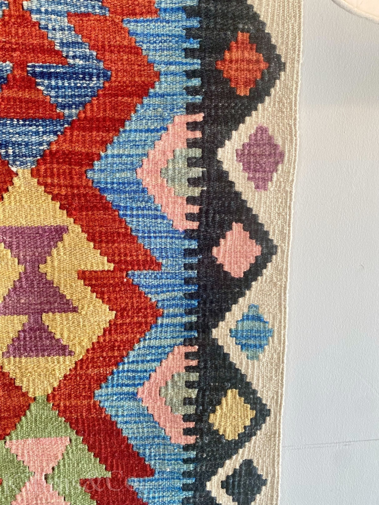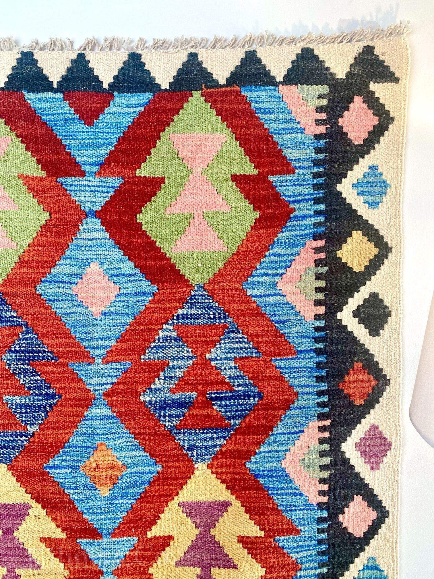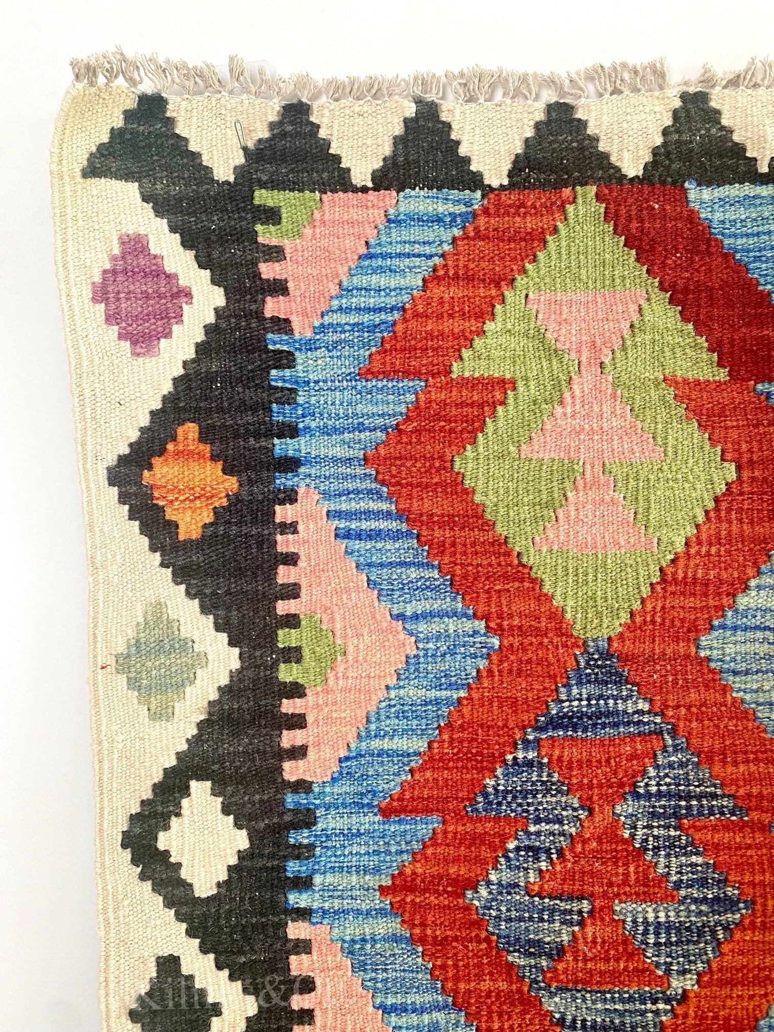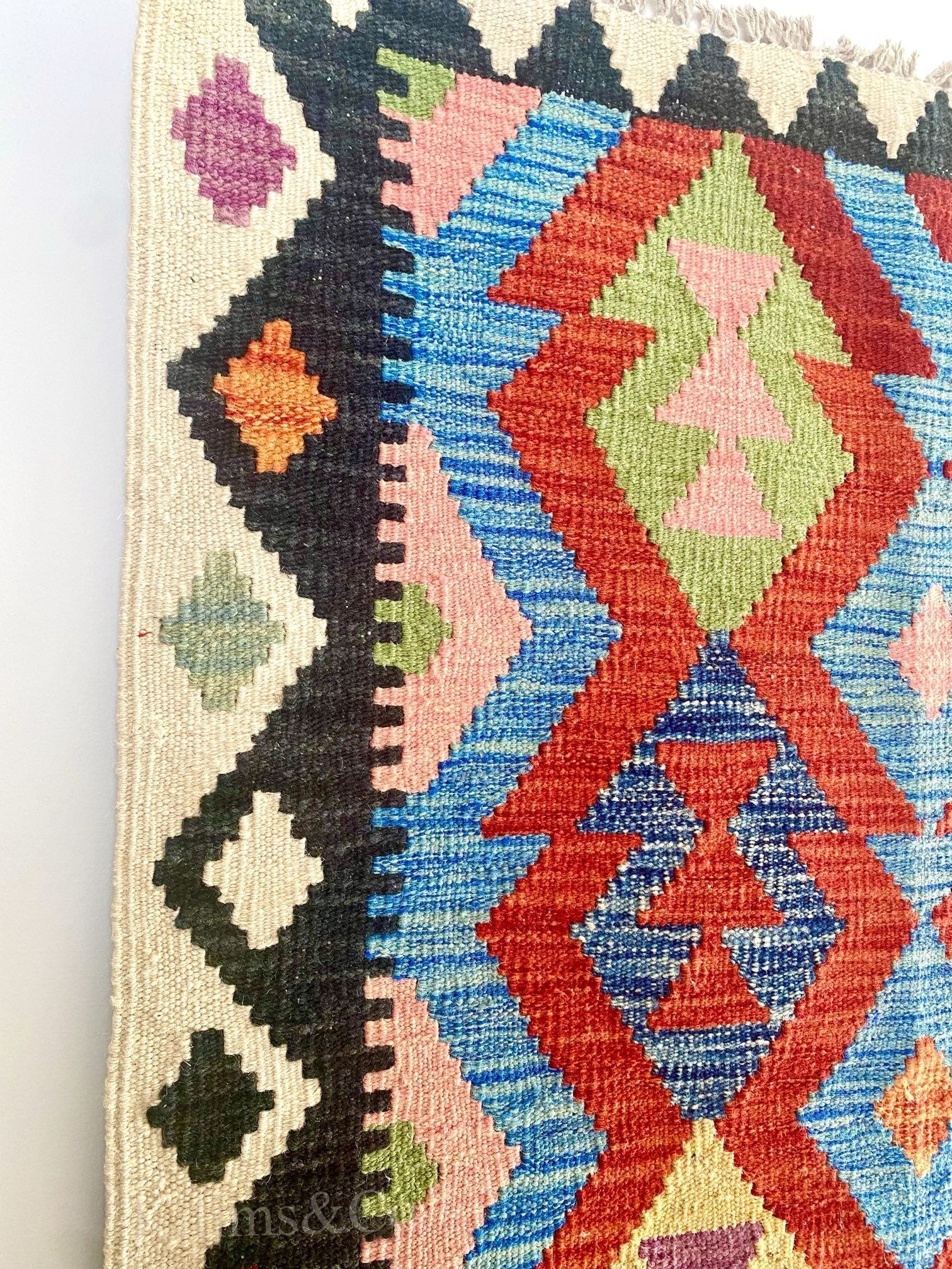 The Retro Kilim, another gem from Kilims&Co, is a playful piece that features a colorful, 70s-inspired design. Its shades of mustard yellow, avocado green, burnt orange, and jeans blue create a vibrant and lively palette. Perfect for adding a touch of retro-inspired style to any room, these handmade kilims are a great accent piece for mid-century or bohemian decor.