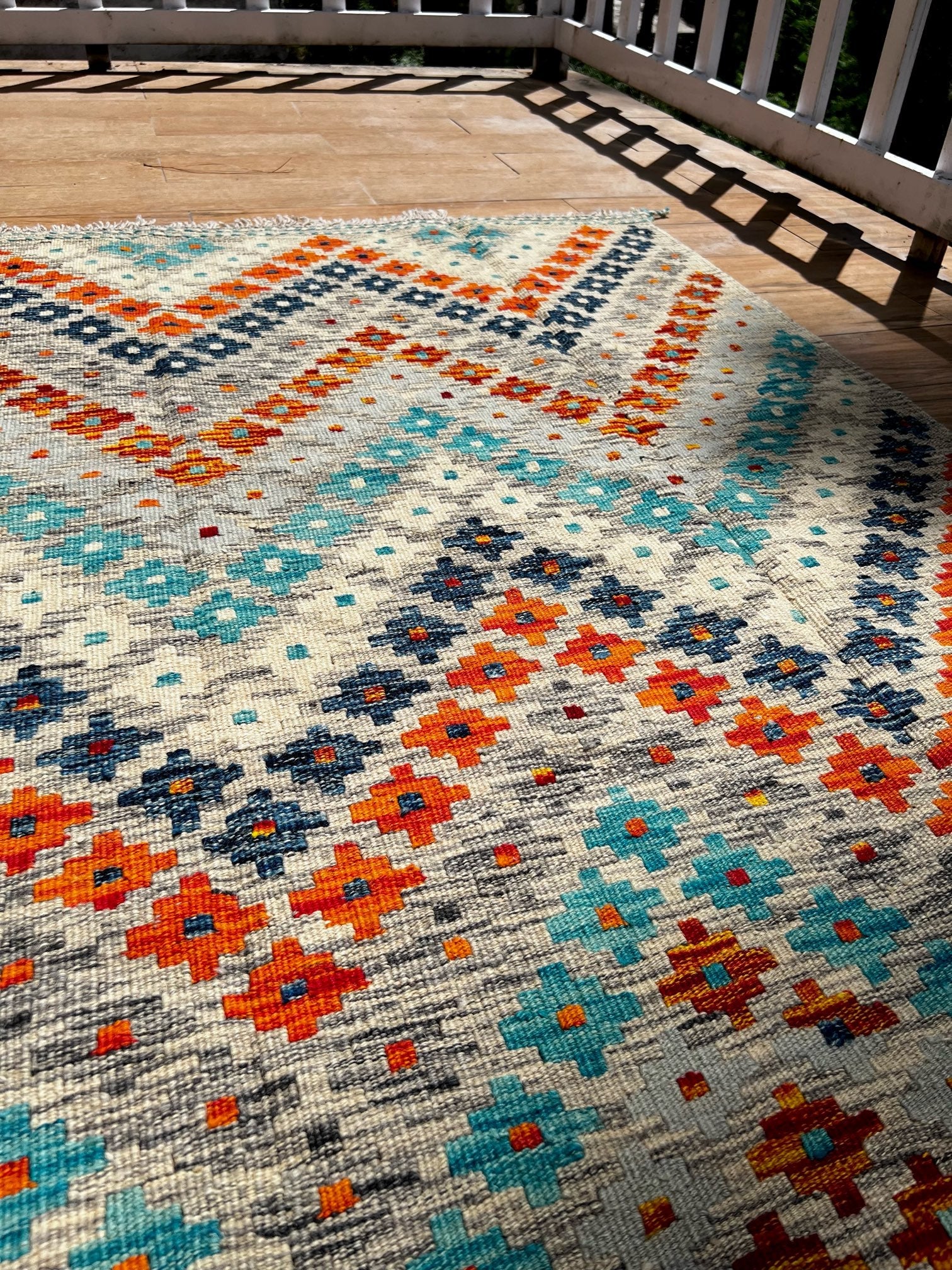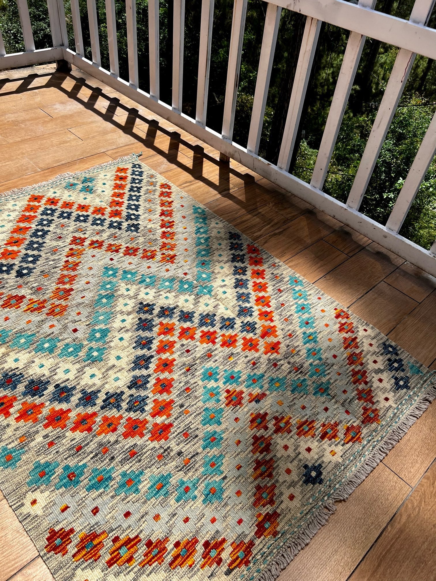 Serene Blooms seamlessly blends traditional floral motifs with a contemporary color palette, making it a versatile piece that complements a range of interior styles. Whether placed in a modern living room or a traditional setting, this kilim becomes a statement piece that adds warmth, charm, and a touch of natural beauty.