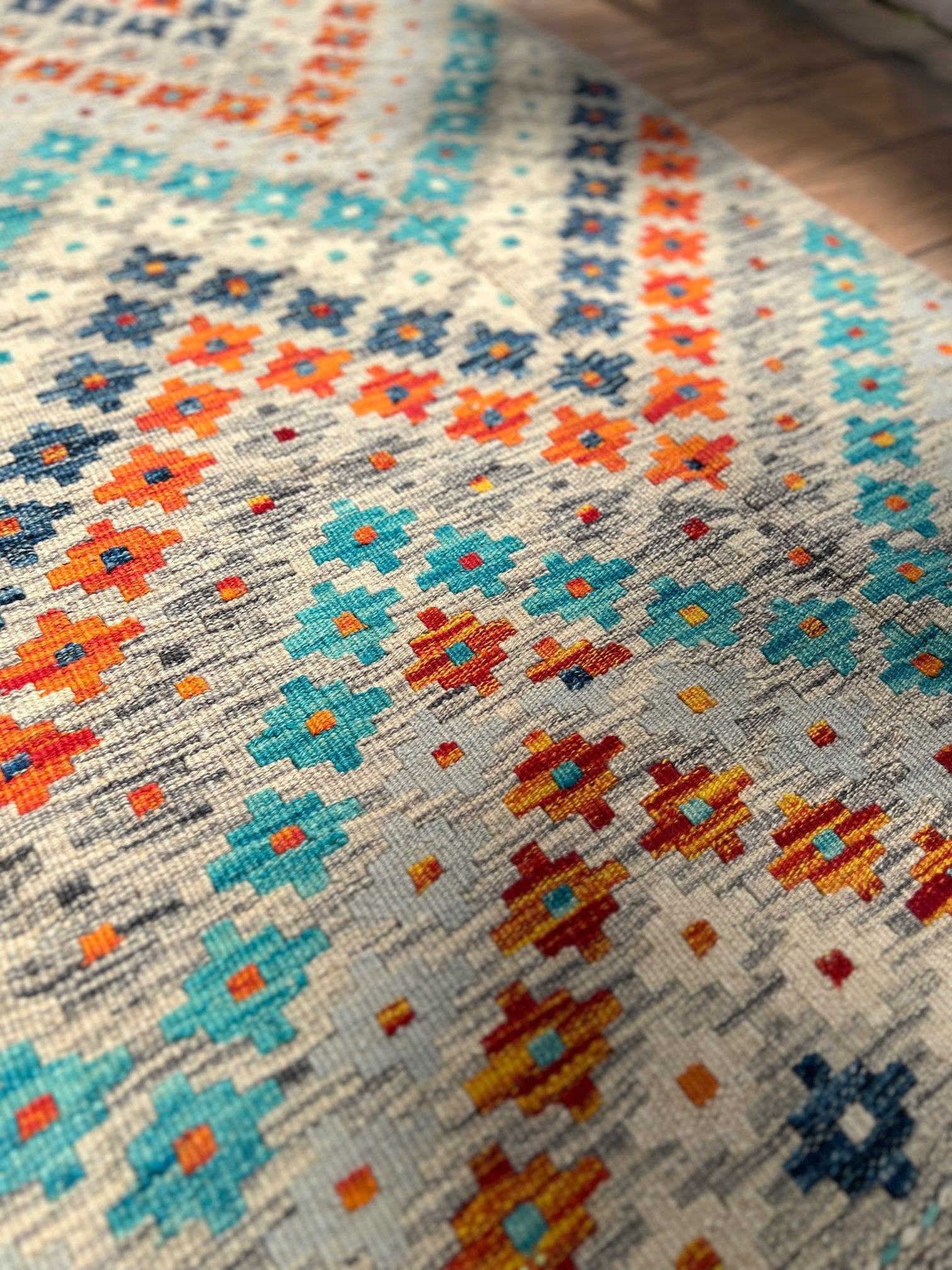 Meticulously handcrafted, Serene Blooms showcases the artistry of master craftsmen. The delicate flowers, intricately woven into the kilim, create a mesmerizing tapestry of colors and patterns. The light sandy grey background provides a calming backdrop, allowing the vibrant hues of the flowers to truly shine.