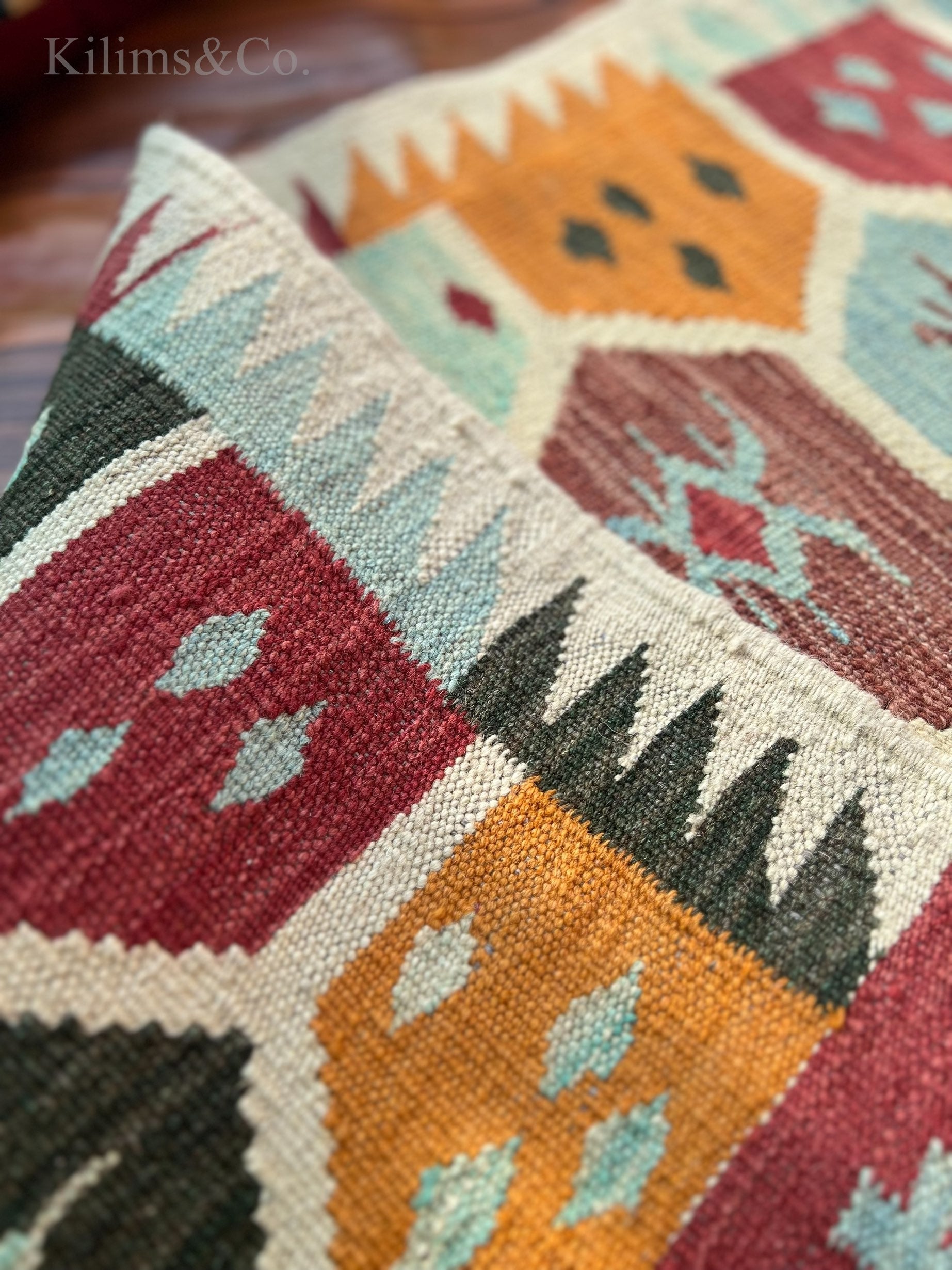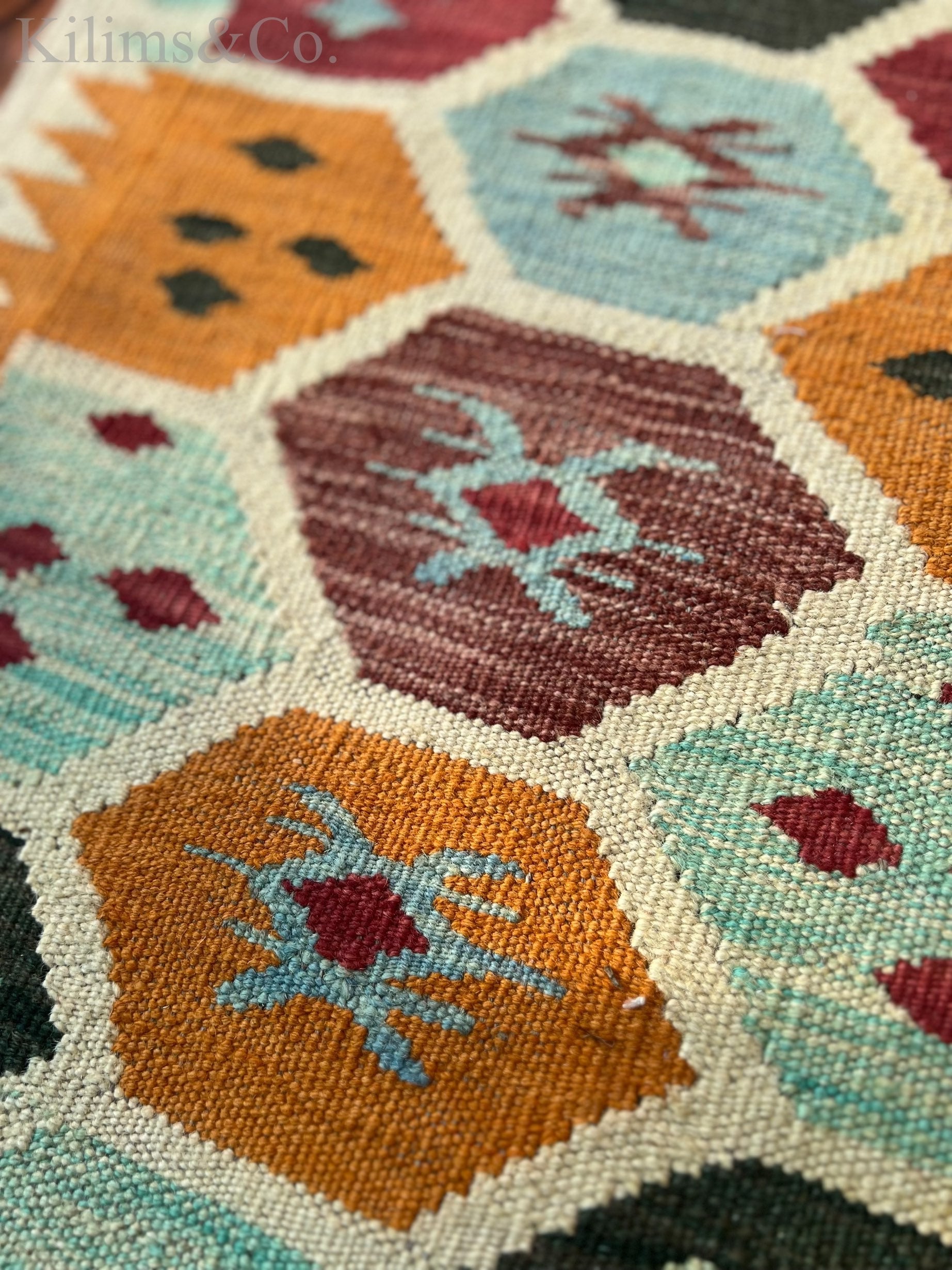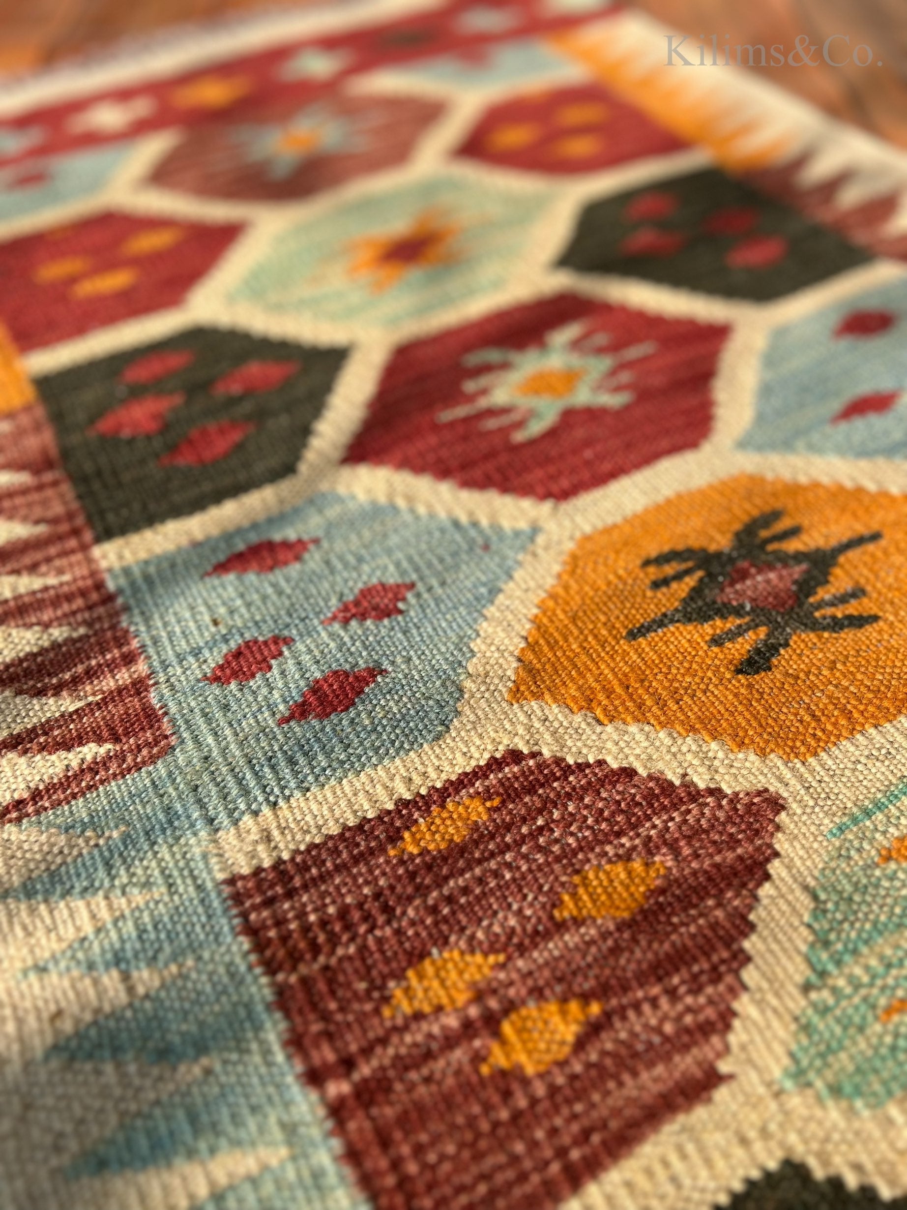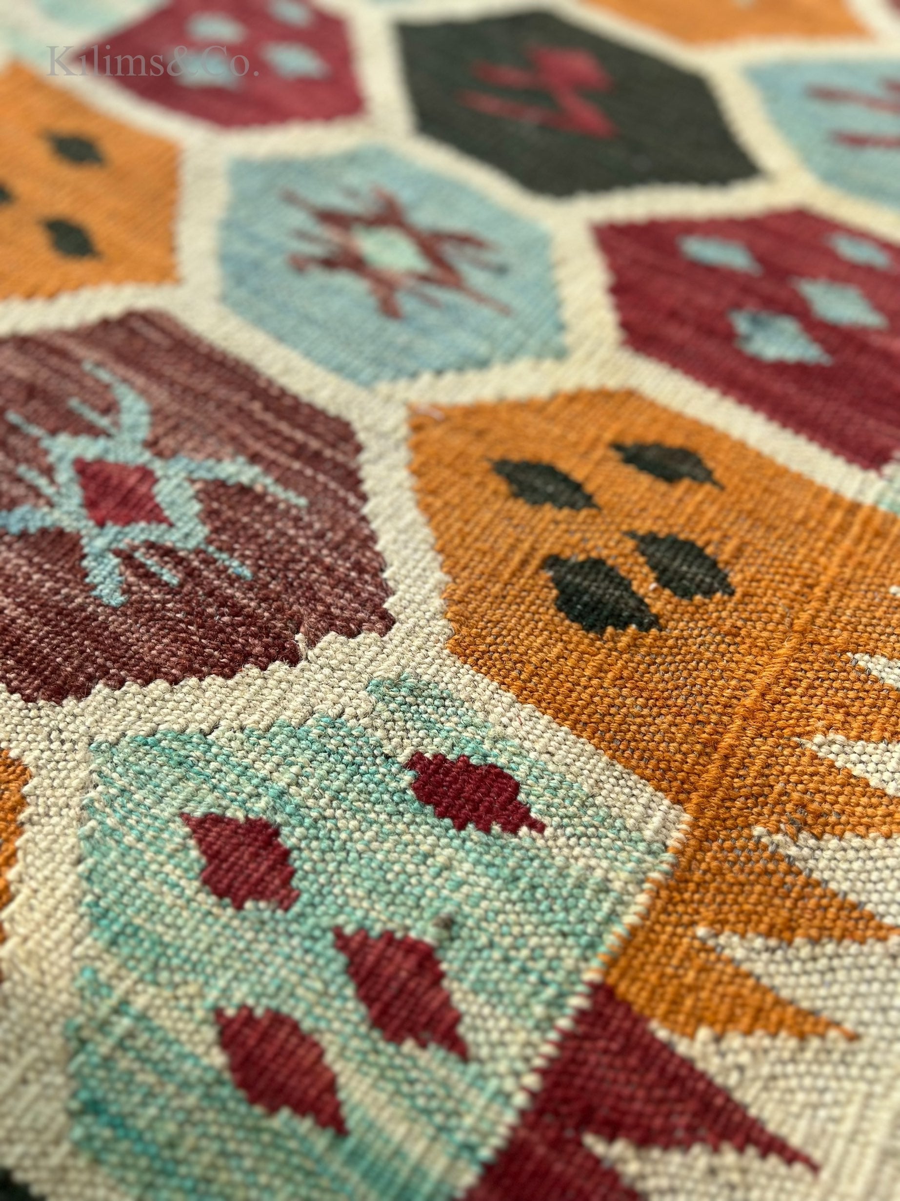 This Pure Sheep wool Afghan Kilim represents a diverse range of cultures, and artistic sensibilities. Made with Persian Knots and Organic vegetable, flower and fruit dyes. These kilims will upgrade any space, bringing in a traditional yet trendy vibe to complement your decor.